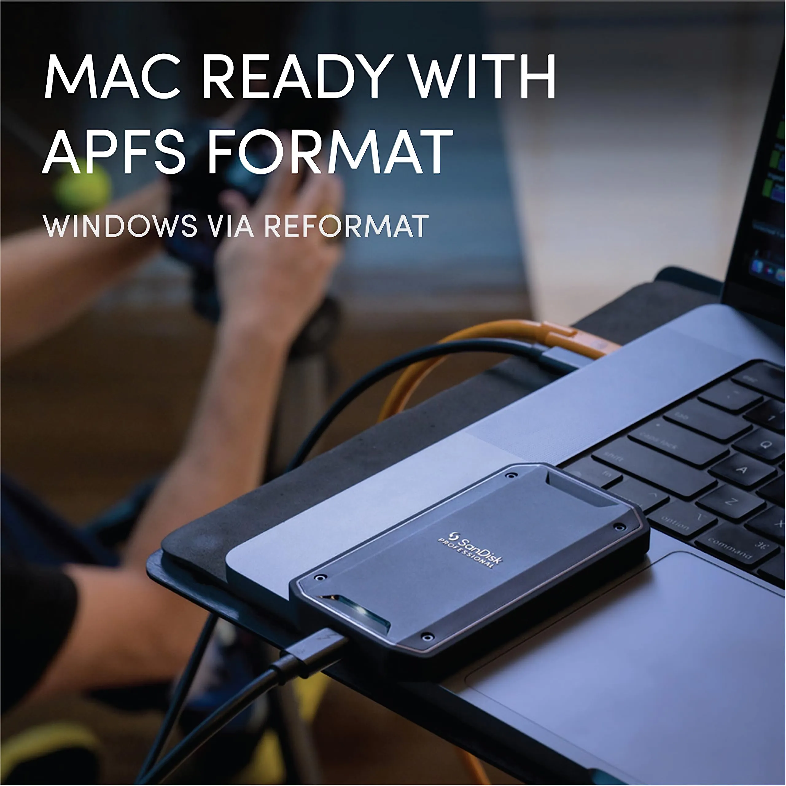 Immerse yourself in the action with the supercharged, ultra-rugged SanDisk Professional PRO-G40 SSD. Built for compatibility with both Thunderbolt 3 and USB-C, this versatile drive enables you to efficiently collaborate across devices. Sustaining speeds up to 3000MB/s read and 2500MB/s write via Thunderbolt 3, the PRO-G40 SSD will power through your most demanding workflows. Bring this ultra-durable drive wherever your vision takes you its 3m drop2 and 4000lb. crush resistance2 along with an IP68 dust- and water-resistant rating help withstand the elements in just about every location.