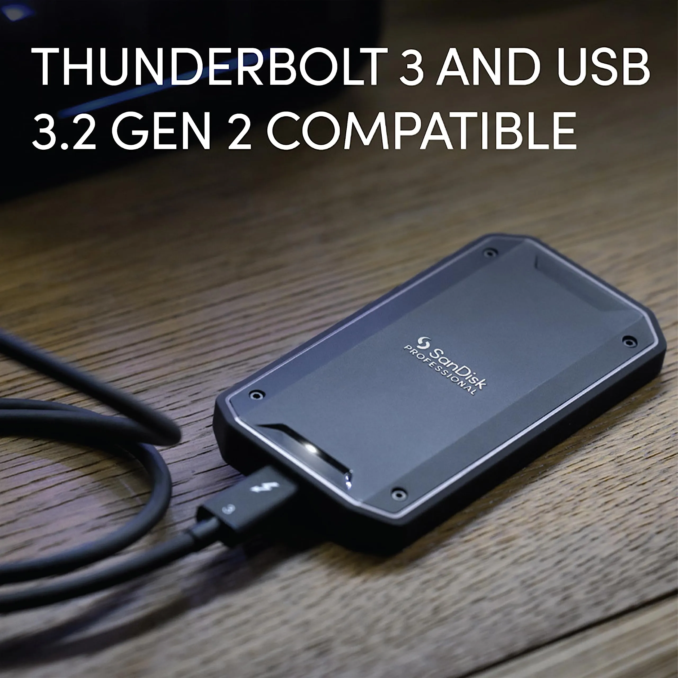 Immerse yourself in the action with the supercharged, ultra-rugged SanDisk Professional PRO-G40 SSD. Built for compatibility with both Thunderbolt 3 and USB-C, this versatile drive enables you to efficiently collaborate across devices. Sustaining speeds up to 3000MB/s read and 2500MB/s write via Thunderbolt 3, the PRO-G40 SSD will power through your most demanding workflows. Bring this ultra-durable drive wherever your vision takes you its 3m drop2 and 4000lb. crush resistance2 along with an IP68 dust- and water-resistant rating help withstand the elements in just about every location.