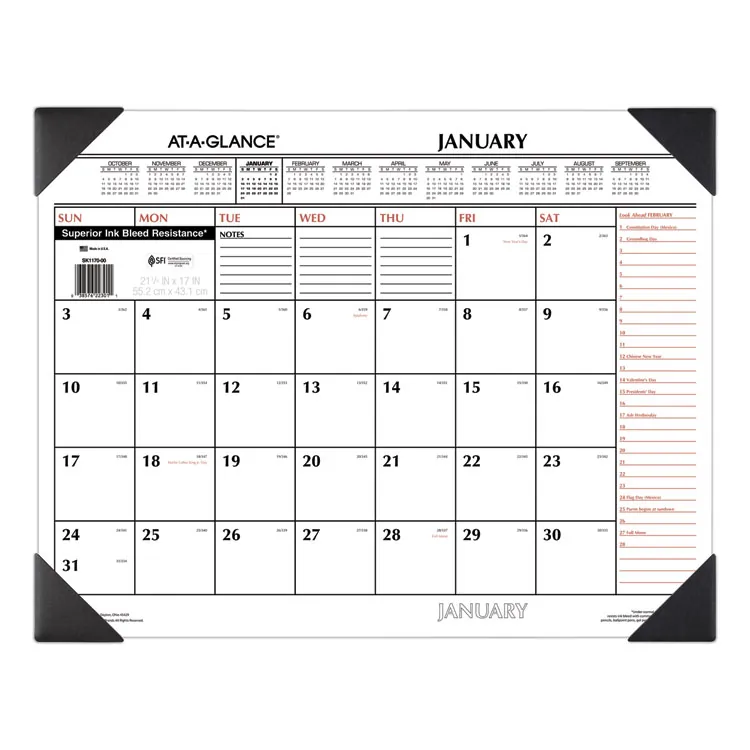 This two-color monthly desk pad calendar is perfect for keeping track of important dates and events. Measuring 22 inches by 17 inches, it provides ample writing space for notes, reminders, and appointments throughout the year.