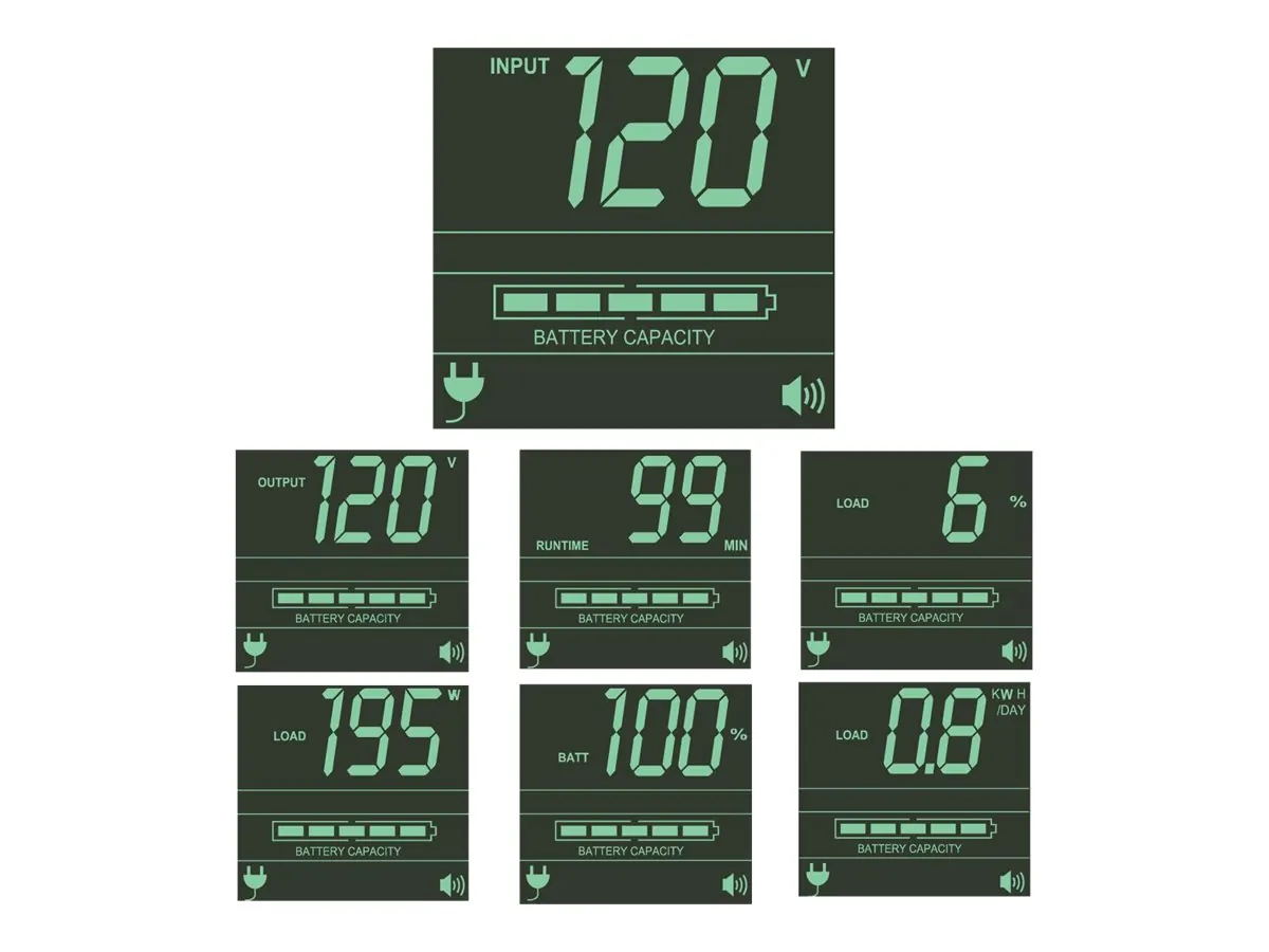 Voltage compatibility 120V AC Frequency compatibility 60 Hz Output volt amp capacity VA 1000 Output watt capacity watts 700 Output nominal voltage 120V AC Output voltage regulation LINE MODESine wave line voltage 120V below 21 percent or above 8 percent BATTERY MODESine wave output within 5 percent of 120 VAC Output frequency regulation LINE MODEPasses line frequency of 60Hz above or below 10 percent BATTERY MODEInverter output regulated to 60Hz above or below 05Hz Outlet quantity type 6 NEMA 515R Overload protection 15A input breaker Maximum input amps 68A 770 watts Input connection type NEMA 515P Input cord length 10 ft 14 gauge Recommended electrical service15A 120V BATTERY Full load runtime9 minutes 700 watts Half load runtime21 minutes 350 watts DC system voltage24 VDC Typical battery lifespan36 years depending on usage Battery recharge rate24 hours to 90 percent Voltage regulation description Line interactive voltage regulation system corrects input voltages between 83 and 147 back to usable 120V nominal levels Overvoltage correction Input voltages between 128 and 147 are reduced by 12 percent Brownout correction Input voltages between 83 and 107 are boosted by 14 percent Front panel LEDs 5 front panel LEDs Green POWER LED 3 color BATTERY CHARGE LED 3 color OUTPUT LOAD LEVEL LED red BATTERY WARNING LED Alarms 3 function audible alarm indicate power failure conditions4 short beeps every 10 seconds overloadcontinuous short beeps and low batterycontinuous tone Switches Includes 2 front panel mounted pushbutton switches for system enable selftest and alarm cancel functions AC surge suppression 480 joules AC suppression response time Instantaneous EMI RFI AC noise suppression Yes Shipping weight 415 lbs 188 kg Unit weight 35 lbs 159 kg Unit Dimensions H x W x D 35 x 175 x 135 inches 89 x 445 x 343 cm Shipping Dimensions H x W x D 9 x 24 x 2025 inches 229 x 61 x 514 cm