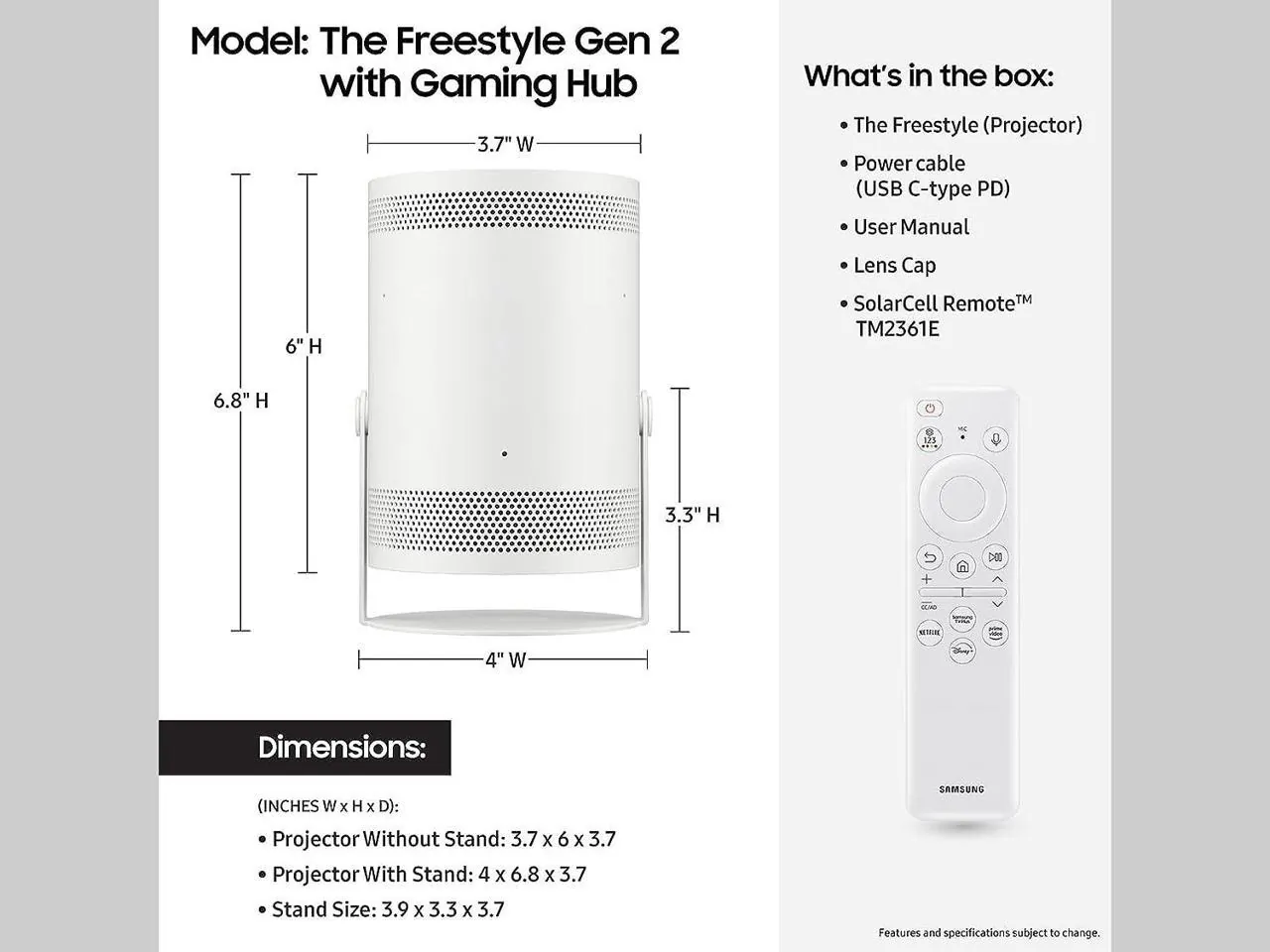 The Samsung The Freestyle Gen2 Smart Projector offers an immersive viewing experience with its ability to project images from 30" to 100". Equipped with a built-in Gaming Hub, this projector is designed to elevate your entertainment, whether for gaming, movies, or streaming.