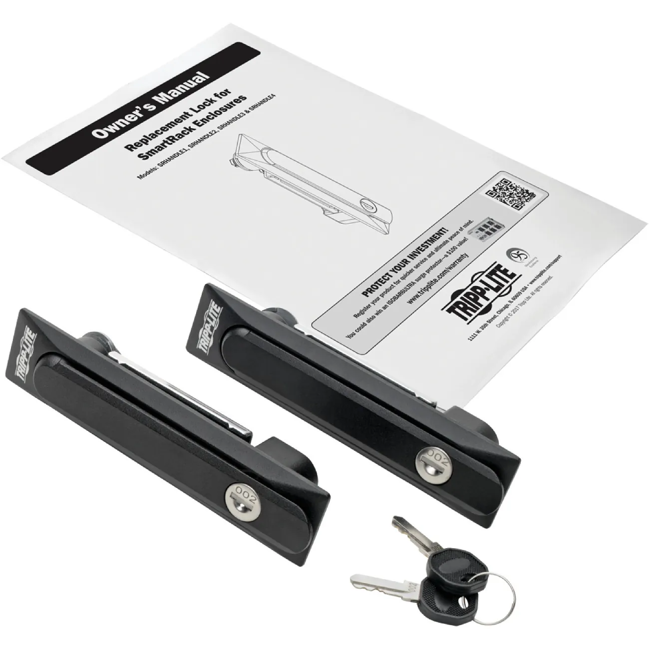 Replacement door lock fits SmartRack® floor-standing enclosures with door handlesUses mounting hardware from existing SmartRack door handle for quick installationIncludes 2 keys specific to this model to give you control over who has accessTheft-Deterrent Replacement Handle Prevents Unauthorized Access to Your Rack Cabinet This replacement lock handle kit helps you securely store your valuable rack-mounted equipment to protect it from damage, tampering or theft. It’s recommended for data centers, server rooms or network closets where you need your floor-standing rack enclosures to be protected from unauthorized access.Included Keys Are Specific to This Lock Only SRHANDLE2 fits SmartRack enclosure door assemblies equipped with handles. Replacement handles for front and rear doors are included, which replace the rack cabinet’s existing door handles using the original mounting hardware. Easy installation takes just a few minutes. The included keys fit SRHANDLE2 locks only, allowing you to control who has access to internal equipment. Keys and handles are marked with the numeral “2” for quick identification.