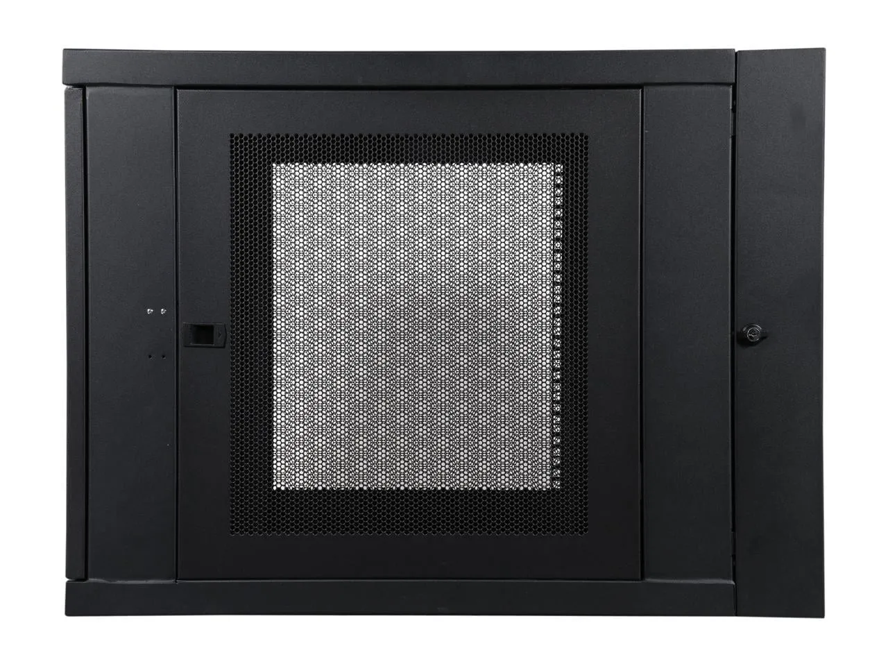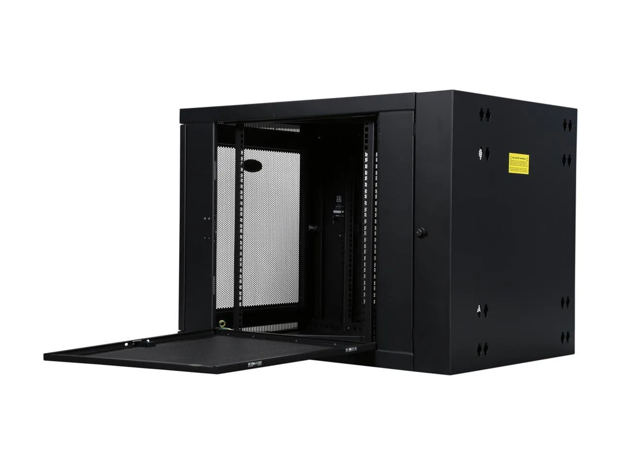 Ideal for network wiring closets, retail locations, classrooms, back offices and other areas with limited floor space Secures 12U of 19 in. rack equipment up to 32.5 in. deep Maximum load capacity of 250 lbs. Swings away from wall on hinge for easy, backdoor access to equipment and cabling during installation and maintenance Cabinet should be rotated 180° before mounting to open reversible doors left or right Locking steel cabinet vented at sides, front, top and bottom Flow-through ventilation keeps equipment cool Convenient ports with removable covers allow cable routing through top and bottom Wall-mounting holes spaced 16 in. apart for standard wall stud placement Vertical mounting rails adjust in 7/8 in. increments to accommodate equipment up to 32.5 in. deep, such as network switches and patch panels Rails support square hole or 12-24 threaded-hole mounting Rack spaces numbered for easy reference Can be converted to a roll rack with optional SRCASTER (sold separately) Meets Payment Card Industry Standards Ships fully assembled 5-year limited warranty Includes 36 M6 screws, 36 M6 cage nuts, 36 M6 washers, 36 12-24 screws and 2 keys