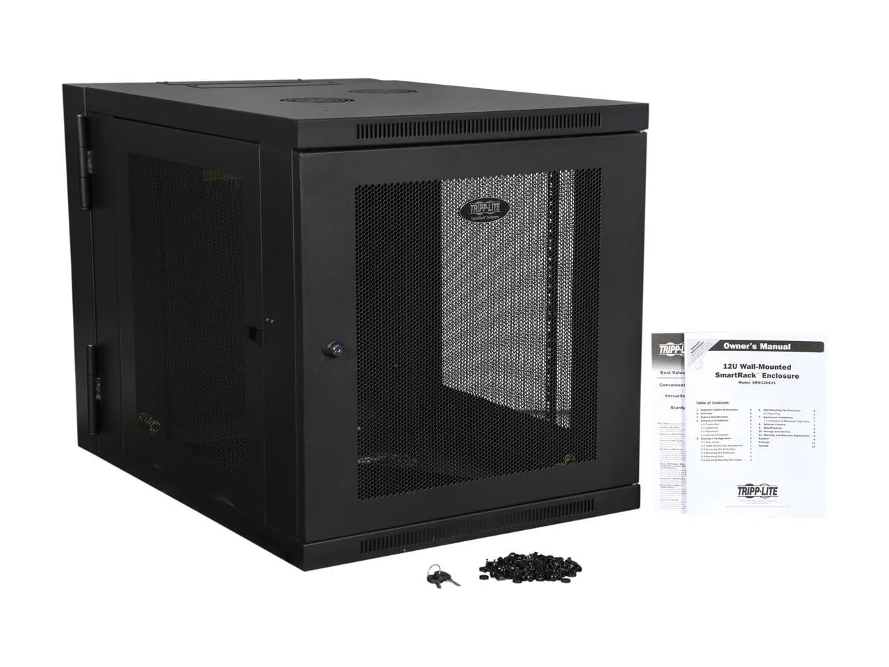 The Tripp Lite SRW12US33 SmartRack 12U Server Depth Wallmount Rack Enclosure Cabinet is designed to house EIA-standard 19 in. rack equipment in network wiring closets, retail locations, classrooms, back offices and other areas with limited floor space where you need equipment to be secure, organized and out of the way. Constructed from heavy-duty steel with a durable black powder-coated finish, the cabinet has a maximum load capacity of 250 lbs. The doors and side panels lock securely to help prevent damage, tampering or theft. The front, top, bottom and removable side panels are vented, which allows air to flow freely and keep equipment cool. The reversible doors can open left or right by rotating the cabinet 180° before mounting. Convenient top and bottom ports allow easy cable routing. The SRW12US33 comes fully assembled and ready to mount to the wall, or use Tripp Lite’s optional SRCASTER rolling caster kit to make it a mobile rack.