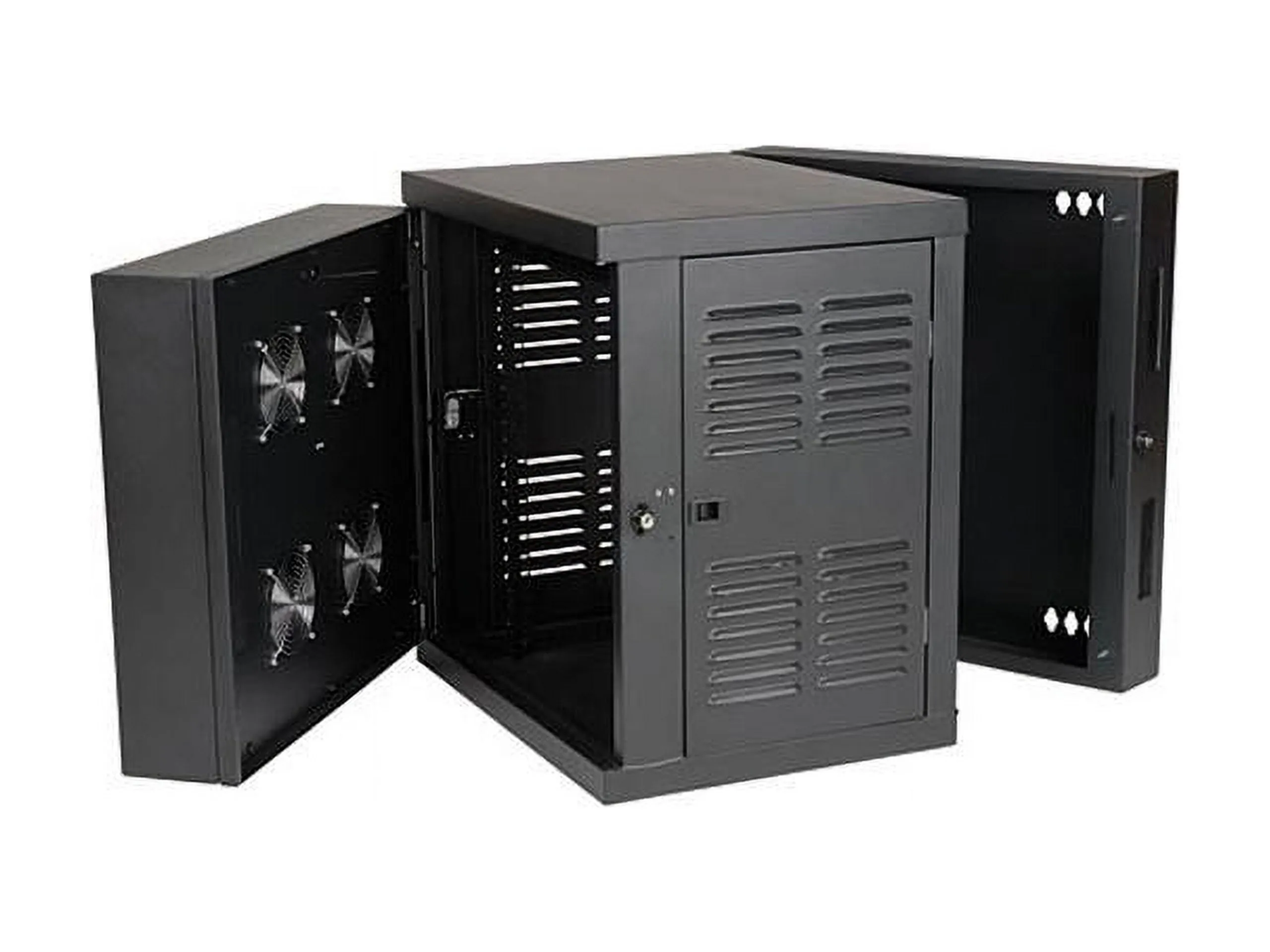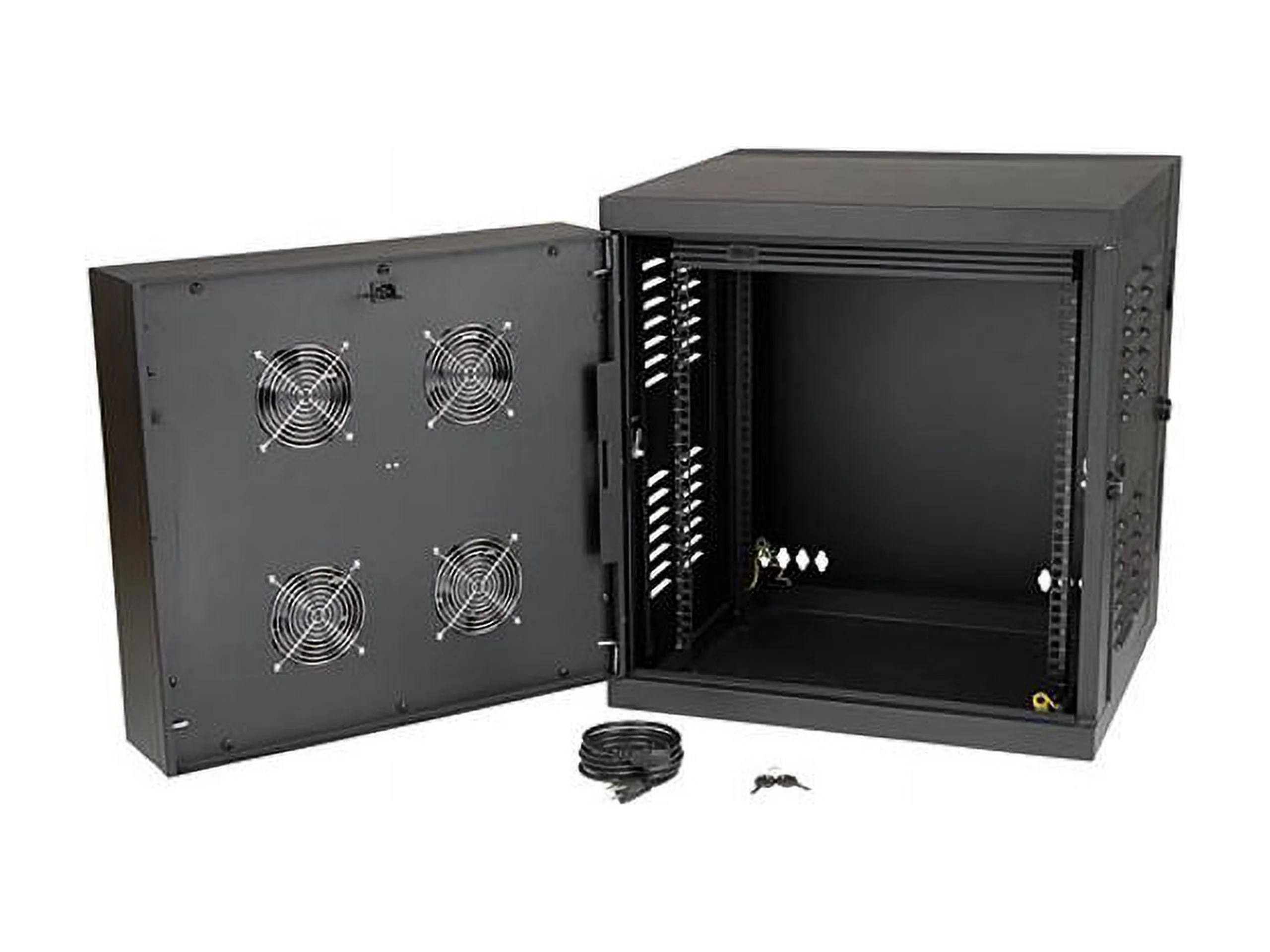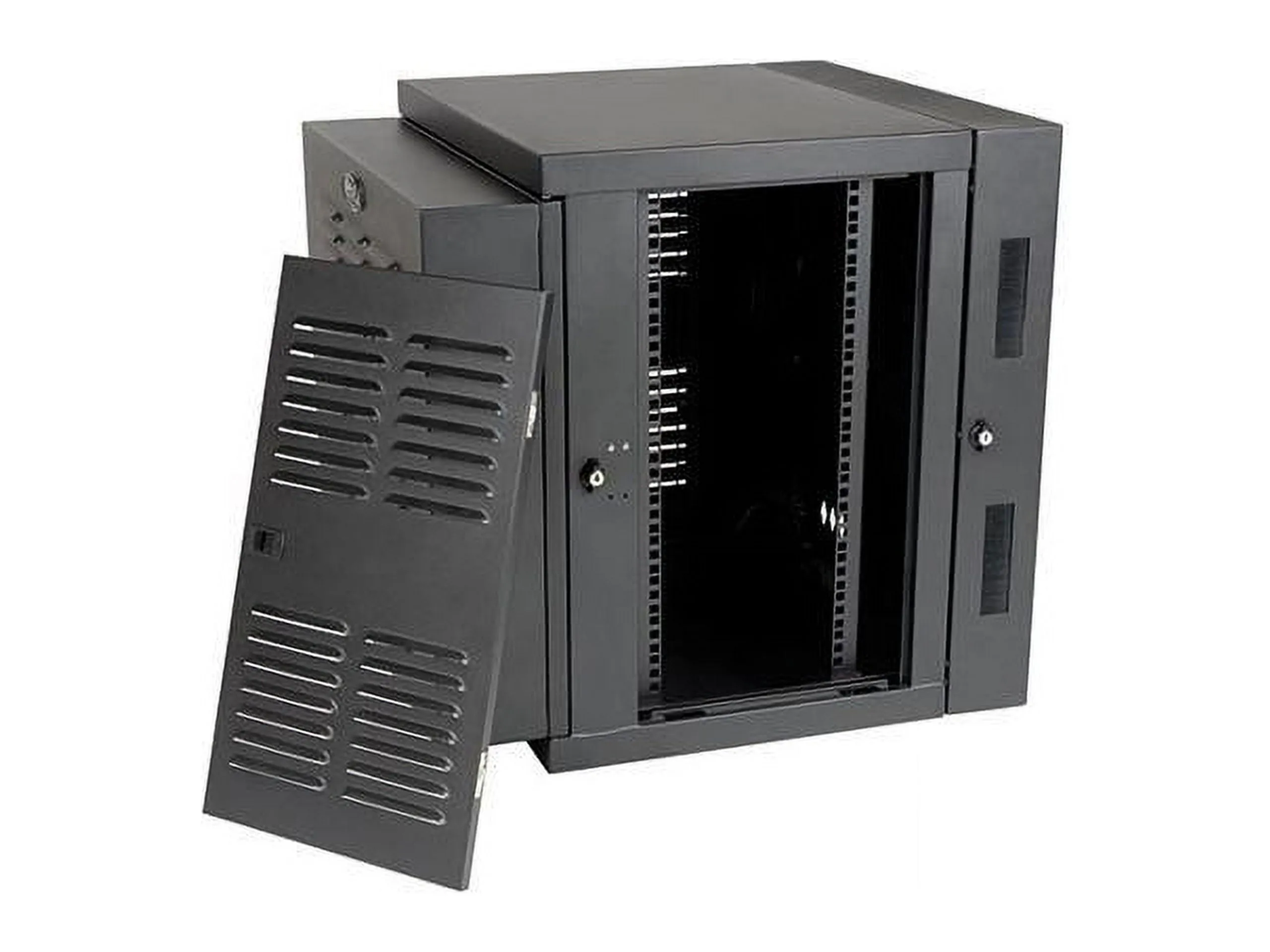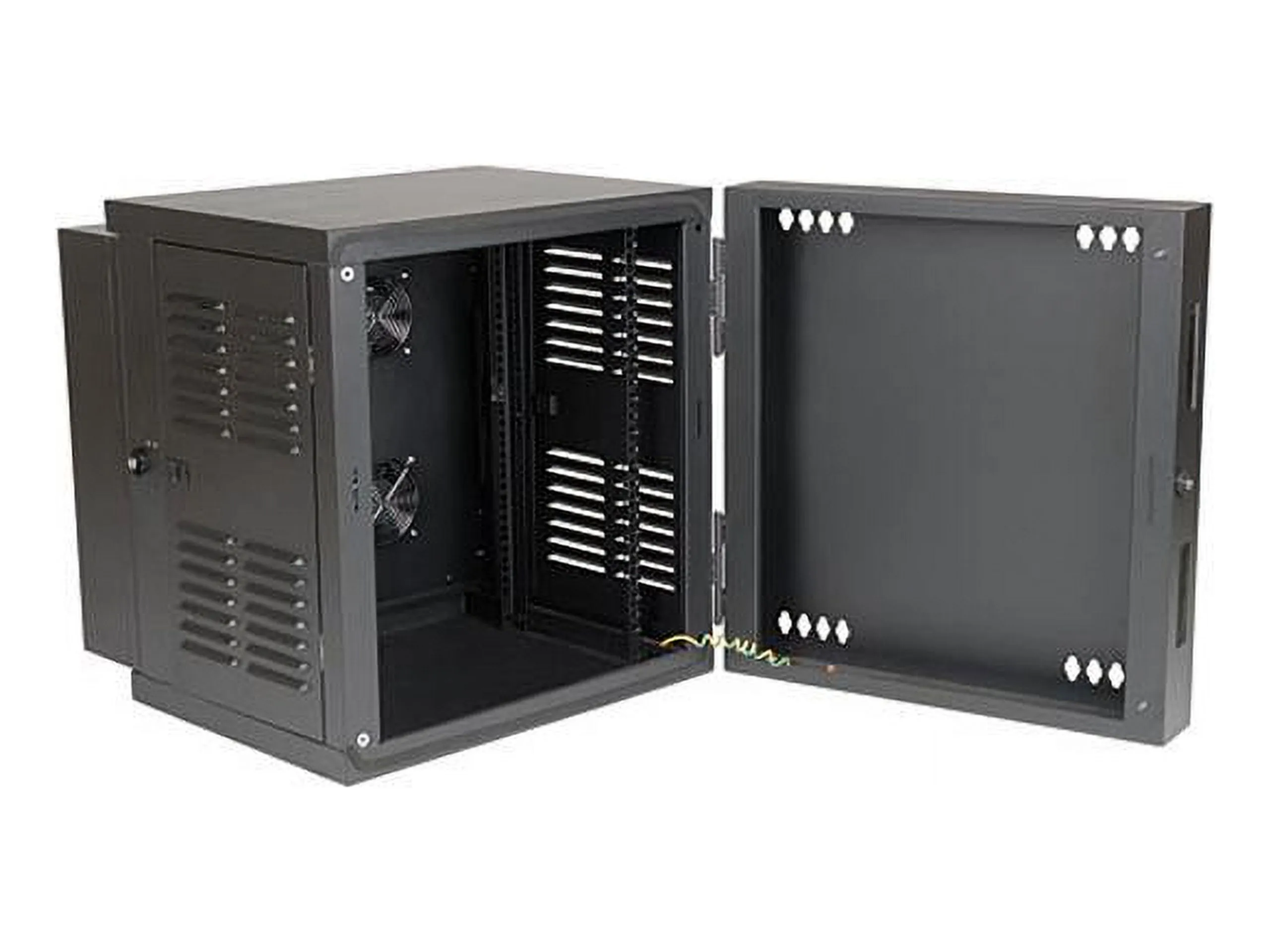 The SRW12USNEMA SmartRack 12U NEMA 12 Switch-Depth Wall-Mount Rack Enclosure Cabinet is designed to house EIA-standard 19-inch rack equipment in harsh, dirty work environments with limited floor space, such as factories, construction areas, utility plants, power stations, transportation terminals, distribution hubs and warehouses. Constructed from heavy-duty steel with a durable black powder-coated finish, the cabinet has a maximum load capacity of 90 kgs. (200 lbs.)The SRW12USNEMA has a NEMA 12 (IP54) protection rating, protecting sensitive equipment against dirt, dust, lint, oil, drips and splashes. Its built-in air filter, louvered vents on the front door and side panels, sealed gasket around the door frames and brush strips around cable access points prevent dripping water, oil and airborne contaminants from getting inside. You can replace the air filter with standard, off-the-shelf furnace filters. Four high-performance intake fans built into the front door pull filtered air through the cabinet to keep your equipment cool.The cabinet swings away from the wall on a sturdy hinge, allowing easy back-door access to equipment and cabling during installation and maintenance. The reversible doors can open left or right. The doors and side panels lock securely to help prevent damage, tampering or theft. Convenient ports on the back door allow easy cable routing.The SRW12USNEMA comes fully assembled and ready to mount to the wall. Square and threaded mounting holes and numbered rack spaces make equipment installation easy. The vertical mounting rails adjust in 7/8-inch increments to house equipment up to 20.5 inches deep, such as network switches and patch panels.