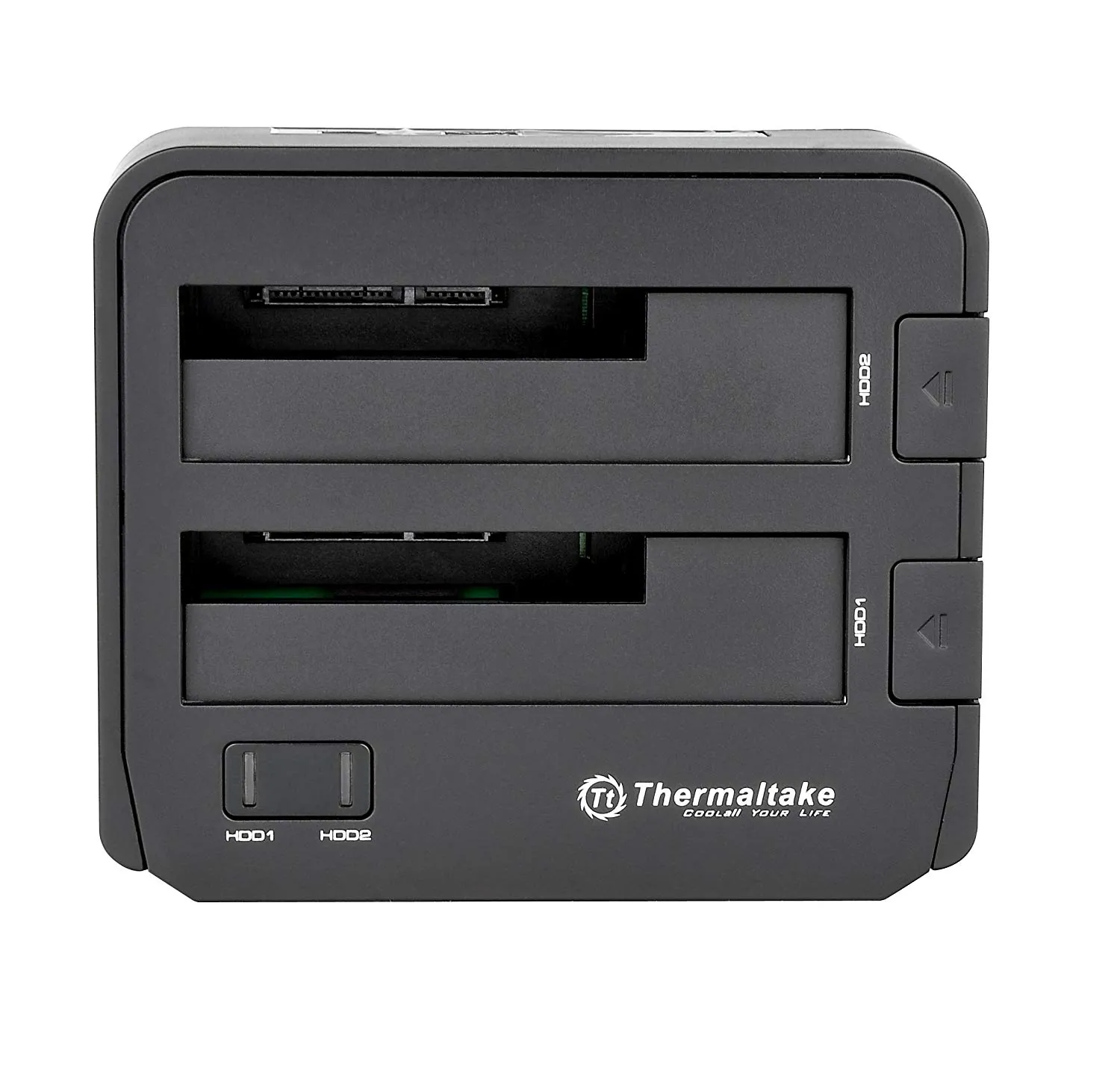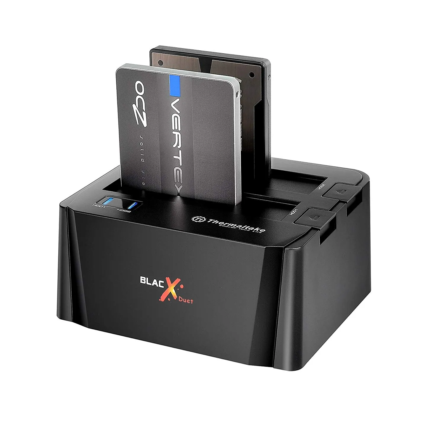 BlacX Duet Docking USB3.0. The Thermaltake BlacX Duet Docking Station provides Read and Write of two drives simultaneously for 2.5" or 3.5" SATA I/II/III hard drives for easy to use access and exchange of your favorite media. This compact and safe design, protects SATA HDD/SSD drives from accidental damage while offering a straight forward plug and play solution without any need for software. With capabilities of transferring through USB 3.0, enjoy up to 5.0 Gbps for fast and easy transfers to and from your system. Compatible with both Windows and Mac OS, gain the advantage of easy file transfer with the Thermaltake BlacX Duet Docking Station.