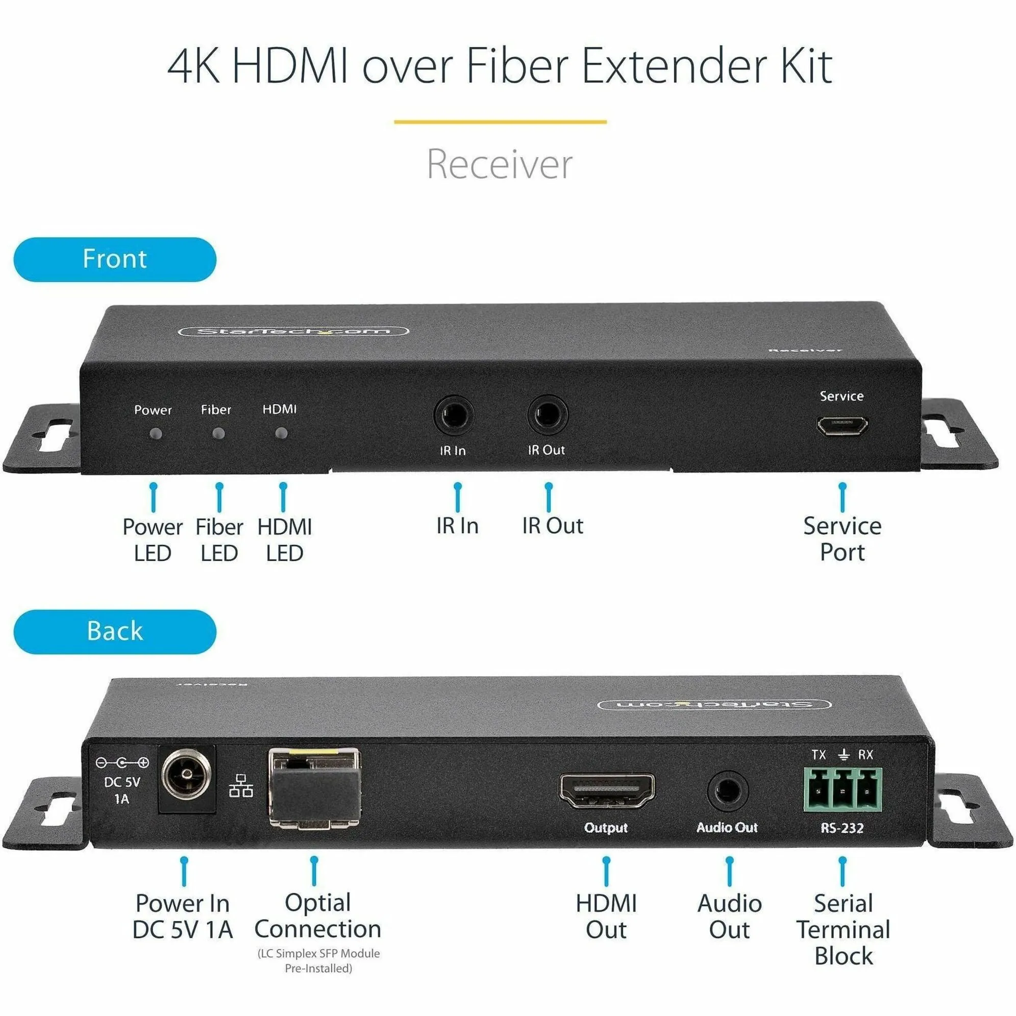 The 4K HDMI Fiber Extender kit enables the extension of a 4K 60Hz signal with 7.1 channel audio transmission. It utilizes Single Strand LC/UPC connectors and supports HDR10 and HDCP 2.2 compliance. The extender can transmit signals over Single Mode fiber up to 3300 feet or Multimode fiber up to 1000 feet, allowing for the utilization of existing fiber cabling.