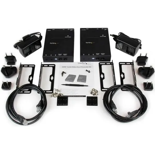 The HDMI over IP extender kit includes optional mounting hardware for a tidy installation.Ideal for high-definition applications, the extender supports 1080p video resolutions anddigital stereo audio. Plus, because the extender uses standard non-proprietary Cat5e or Cat6 Ethernet cable with RJ45 connectors, it eliminates both the expense and hassle of running specialized cables.The extender also features an EDID copy function, which ensures native resolution and maximum compatibility with your display or projector for a convenient plug-and-play installation.