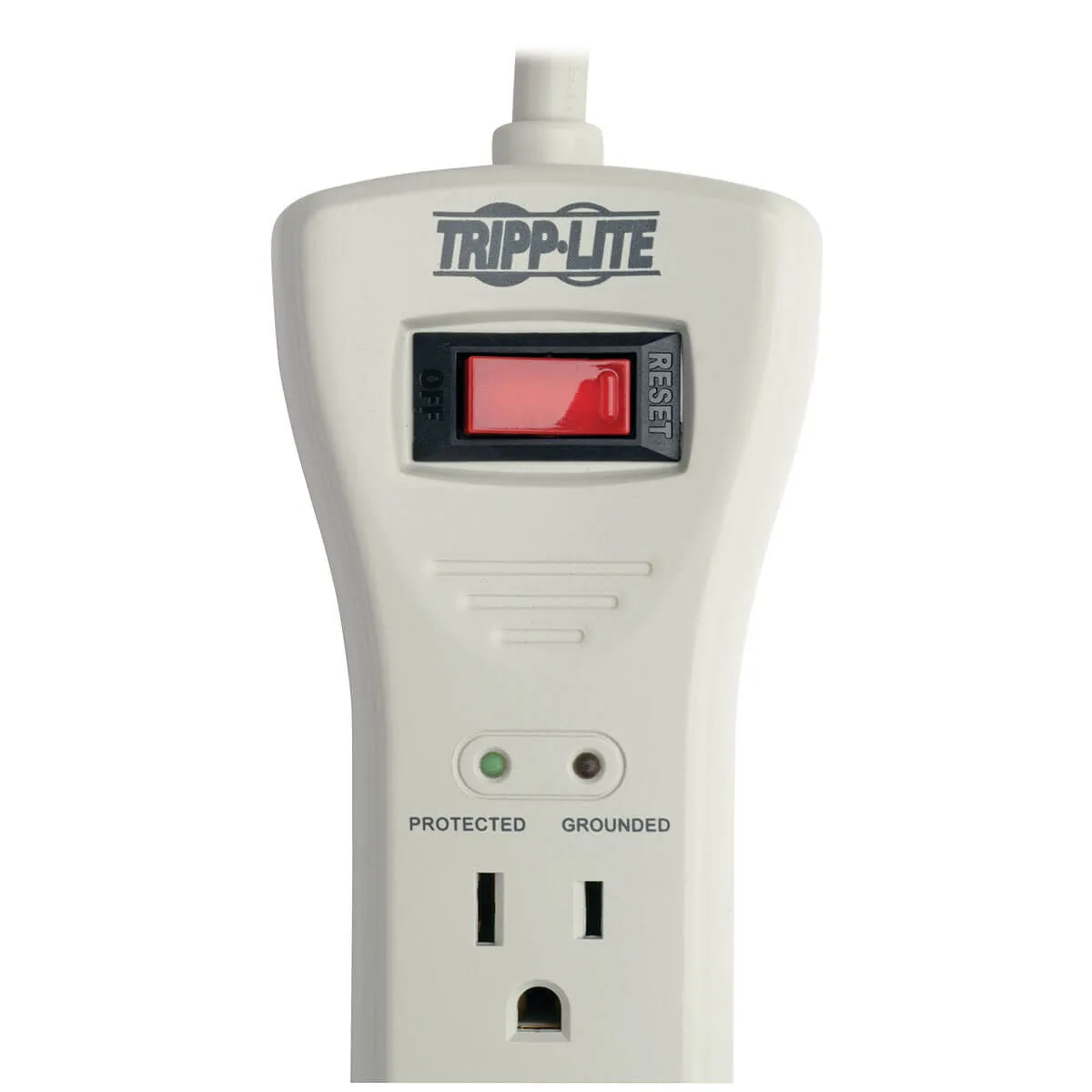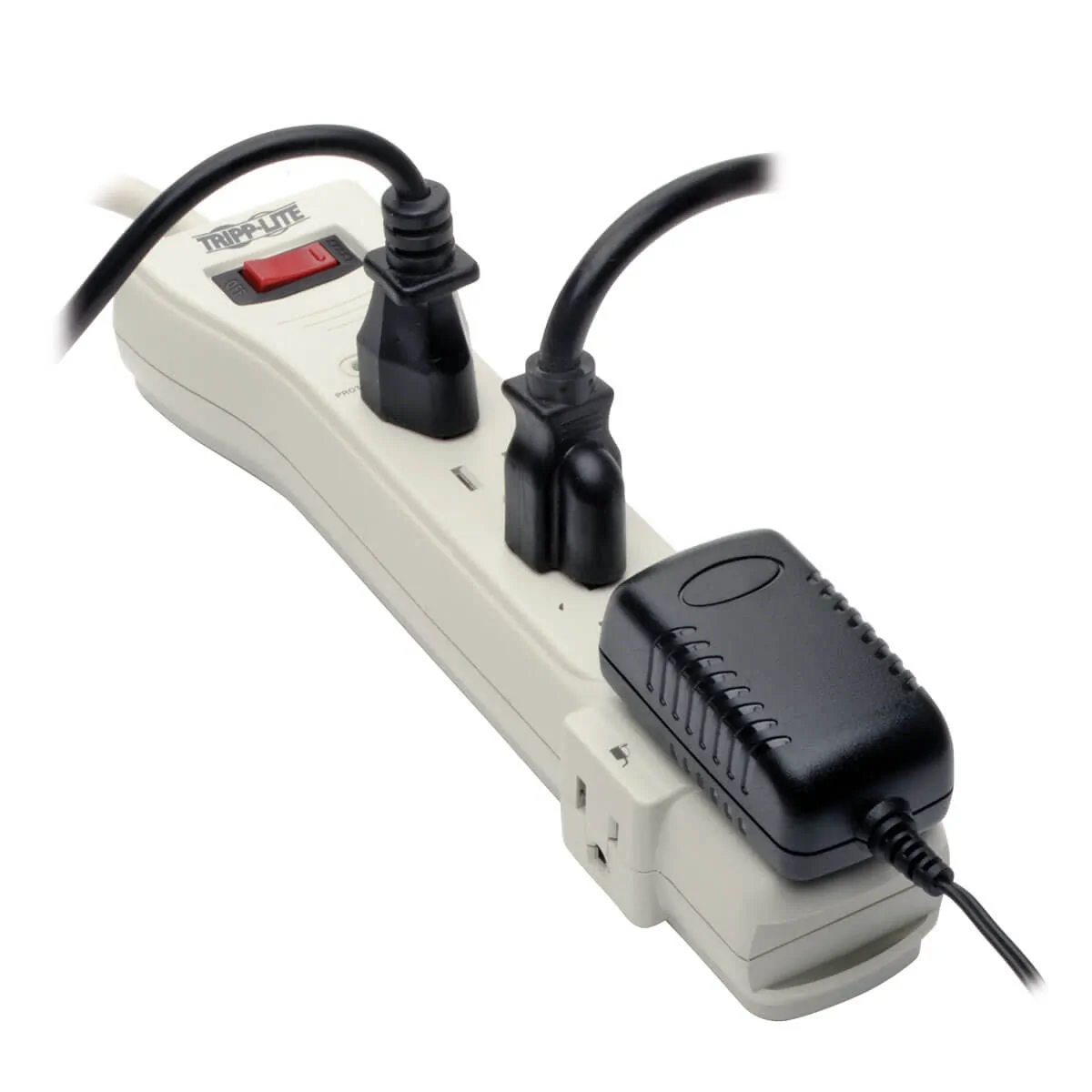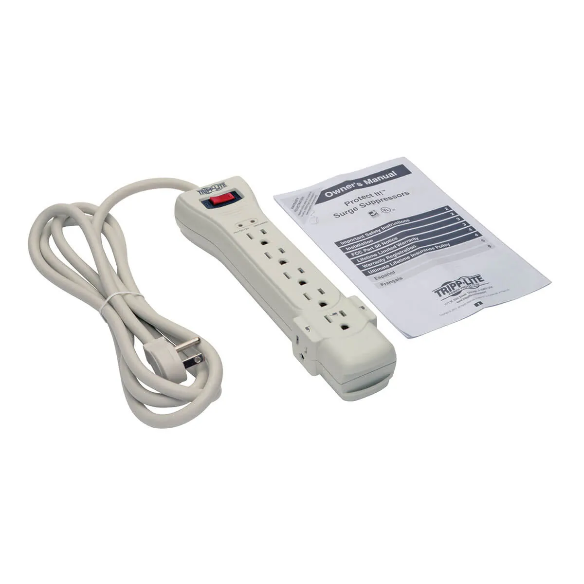 Perfect for your home or office workstation, the SUPER7 Protect It!r 7-Outlet Surge Protector features a surge suppression rating of 2160 joules to defend your sensitive electronic components against even the strongest surges and spikes.Because residential power outlets have three wiresrhot line (H), neutral (N) and ground (G)rthe SUPER7 protects all three, covering the two protection modes: full normal mode (H-N) and common mode (N-G/H-G). It also filters out electromagnetic interference (EMI) and radio frequency interference (RFI) that can disrupt your electronics and inflict hardware damage or data loss.Your devices plug into seven NEMA 5-15R outlets. Two outlets are mounted on the side to allow connection of three bulky transformers without blocking adjacent outlets. An integrated 15A circuit breaker protects all outlets and shuts down connected equipment in case of overload. The on/off switch provides one-touch control over connected equipment. Diagnostic LEDs confirm grounding and protection status.The seven-foot (2.1-meter) AC power cord allows the SUPER7 to reach nearby outlets, while its right-angle NEMA 5-15P plug allows furniture and equipment to be placed flush against the wall to save space in your workstation. Keyhole slots incorporated into the bottom panel provide convenient wall or desk mounting options for the light gray plastic housing.