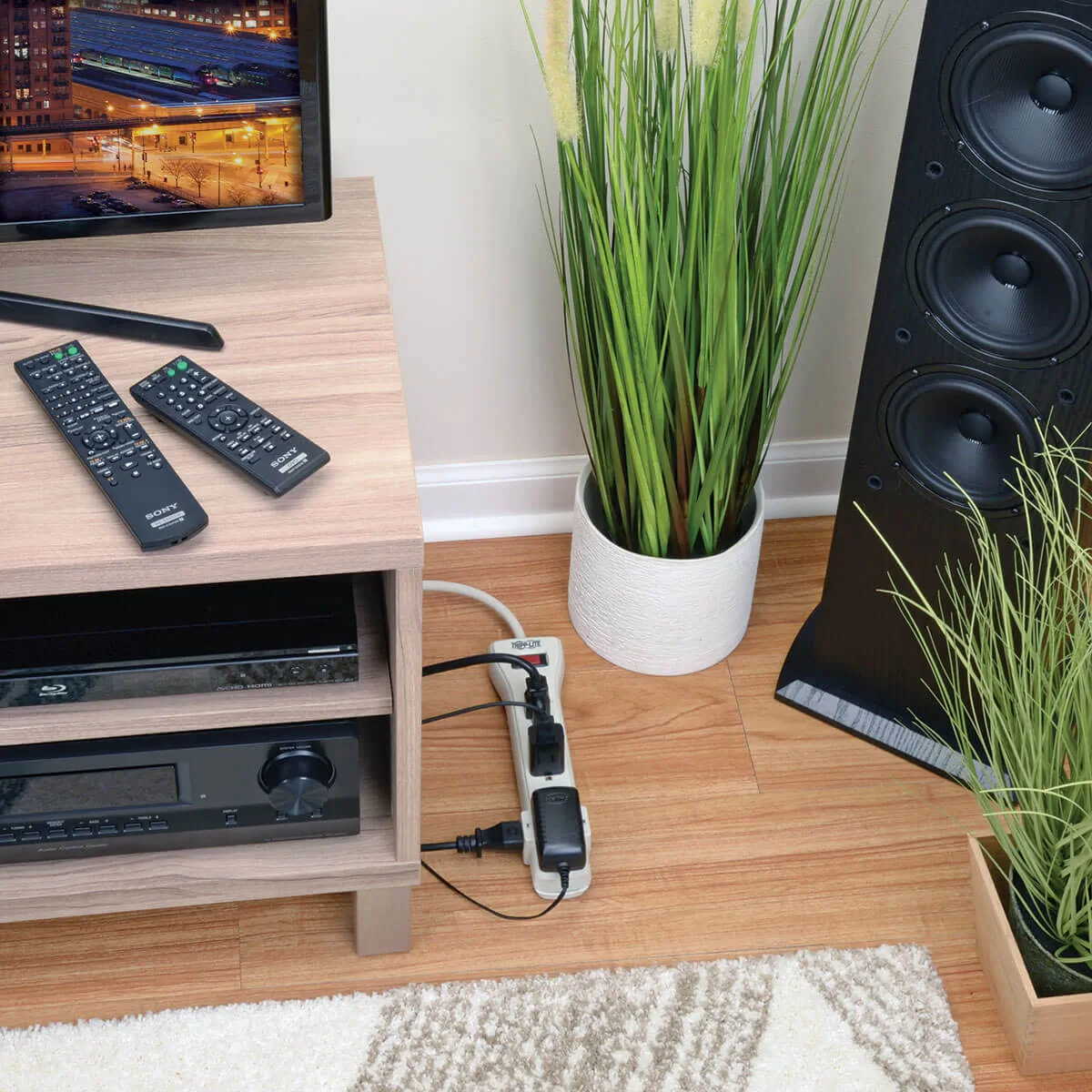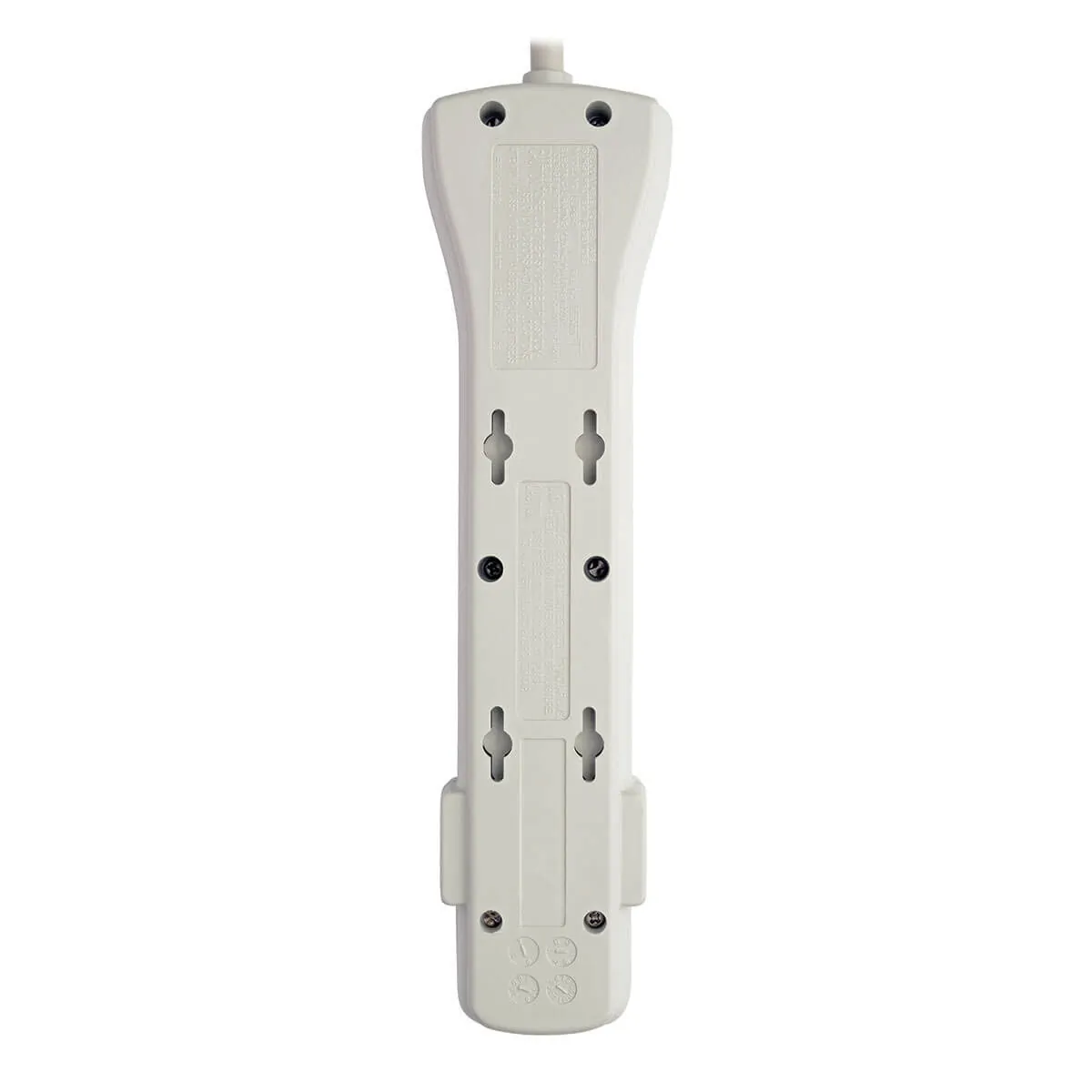 Safeguard your computer, printer, scanner, router, modem and other small home electronics against dangerous surges, spikes and line noise using this seven-outlet surge protector with right-angle plug and surge suppression rating of 2160 joules. It is recommended for any desktop, network or home application requiring AC line protection. Automatic shutoff permanently cuts power to outlets if protection circuit is incapacitated, preventing equipment damage and indicating replacement is required. 15A resettable circuit breaker foils dangerous overloads. On/off switch provides one-touch control over connected equipment. Diagnostic LEDs confirm grounding and protection status at a glance. The 7' AC power cord allows the SUPER7 to reach nearby outlets while its right-angle NEMA 5-15P plug allows furniture and equipment to be placed flush against the wall to save space in your workstation. Keyhole slots incorporated into the bottom panel provide convenient wall or desk mounting options.