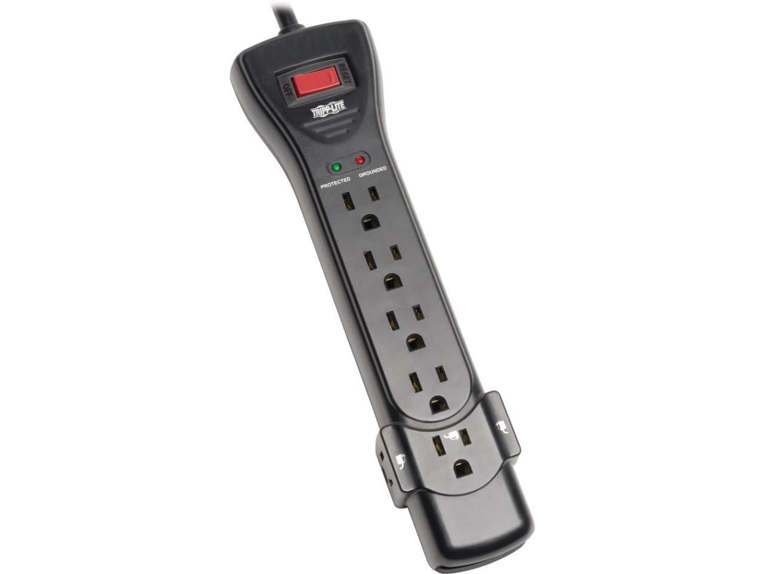 Marketing Information:Safeguard your computer, printer, scanner, router, modem and other small home electronics against dangerous surges, spikes and line noise using this seven-outlet surge protector with right-angle plug and surge suppression rating of 2160 joules. It is recommended for any desktop, network or home application requiring AC line protection. Automatic shutoff permanently cuts power to outlets if protection circuit is incapacitated, preventing equipment damage and indicating replacement is required. 15A resettable circuit breaker foils dangerous overloads. On/off switch provides one-touch control over connected equipment. Diagnostic LEDs confirm grounding and protection status at a glance. The 7' AC power cord allows the SUPER7 to reach nearby outlets while its right-angle NEMA 5-15P plug allows furniture and equipment to be placed flush against the wall to save space in your workstation. Keyhole slots incorporated into the bottom panel provide convenient wall or desk mounting options.