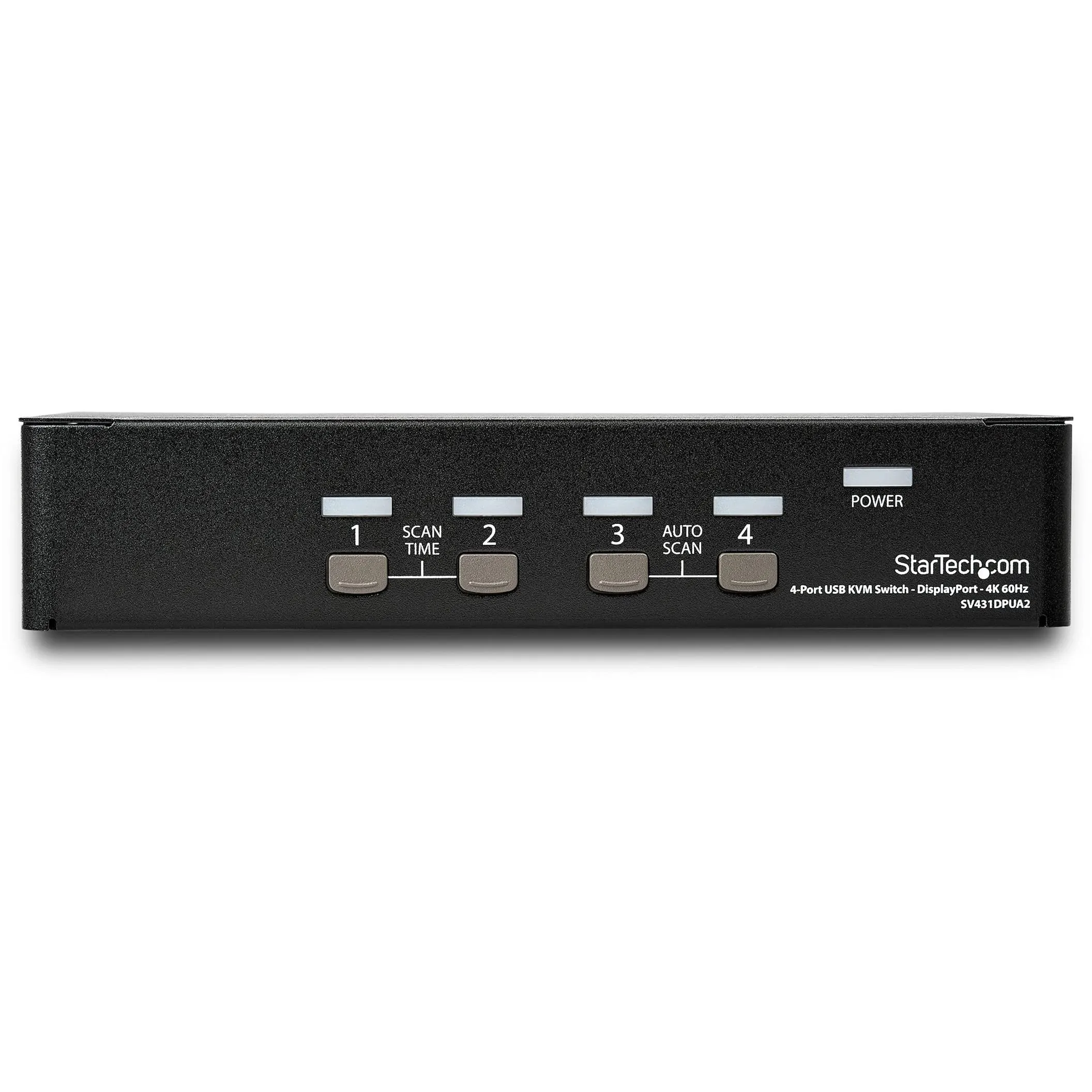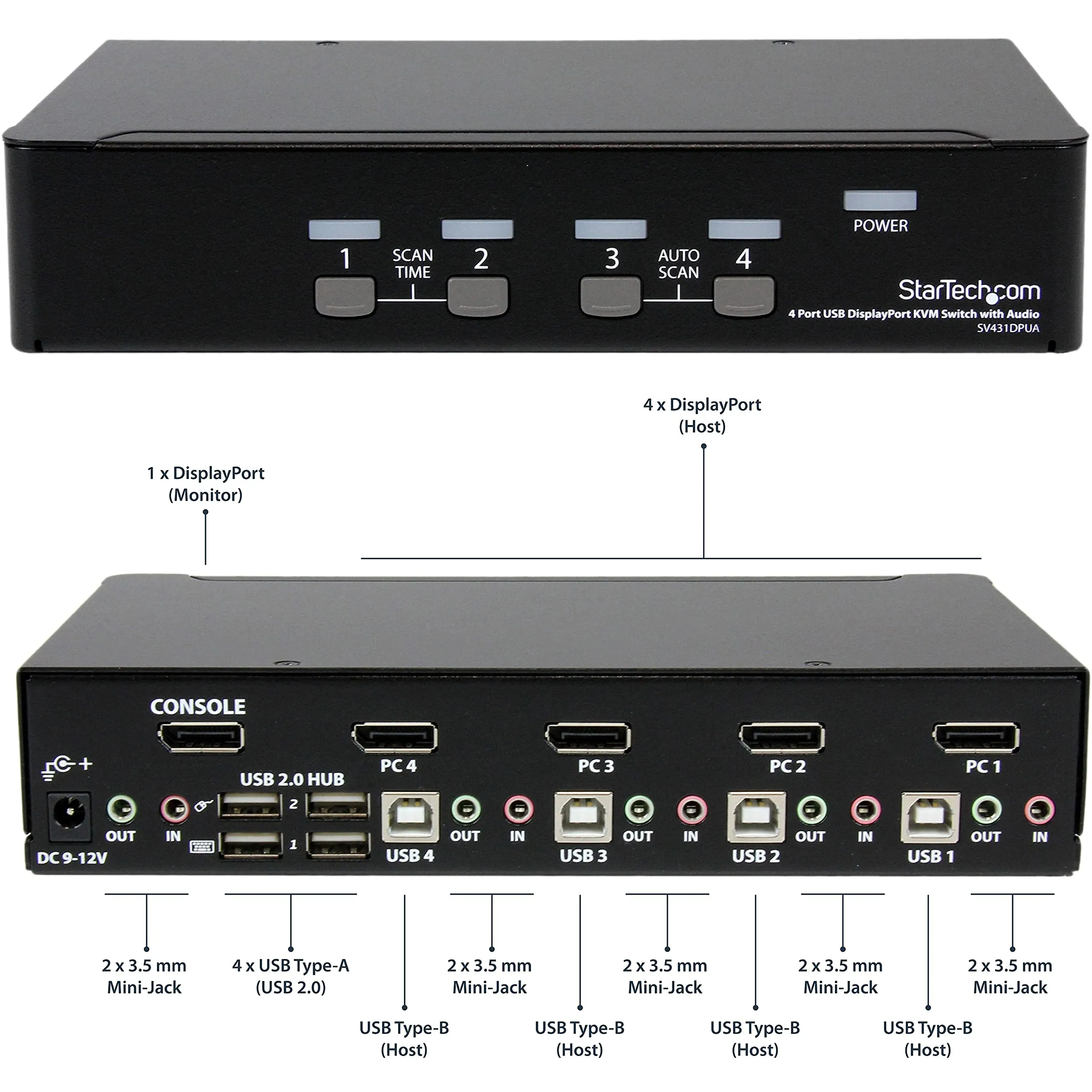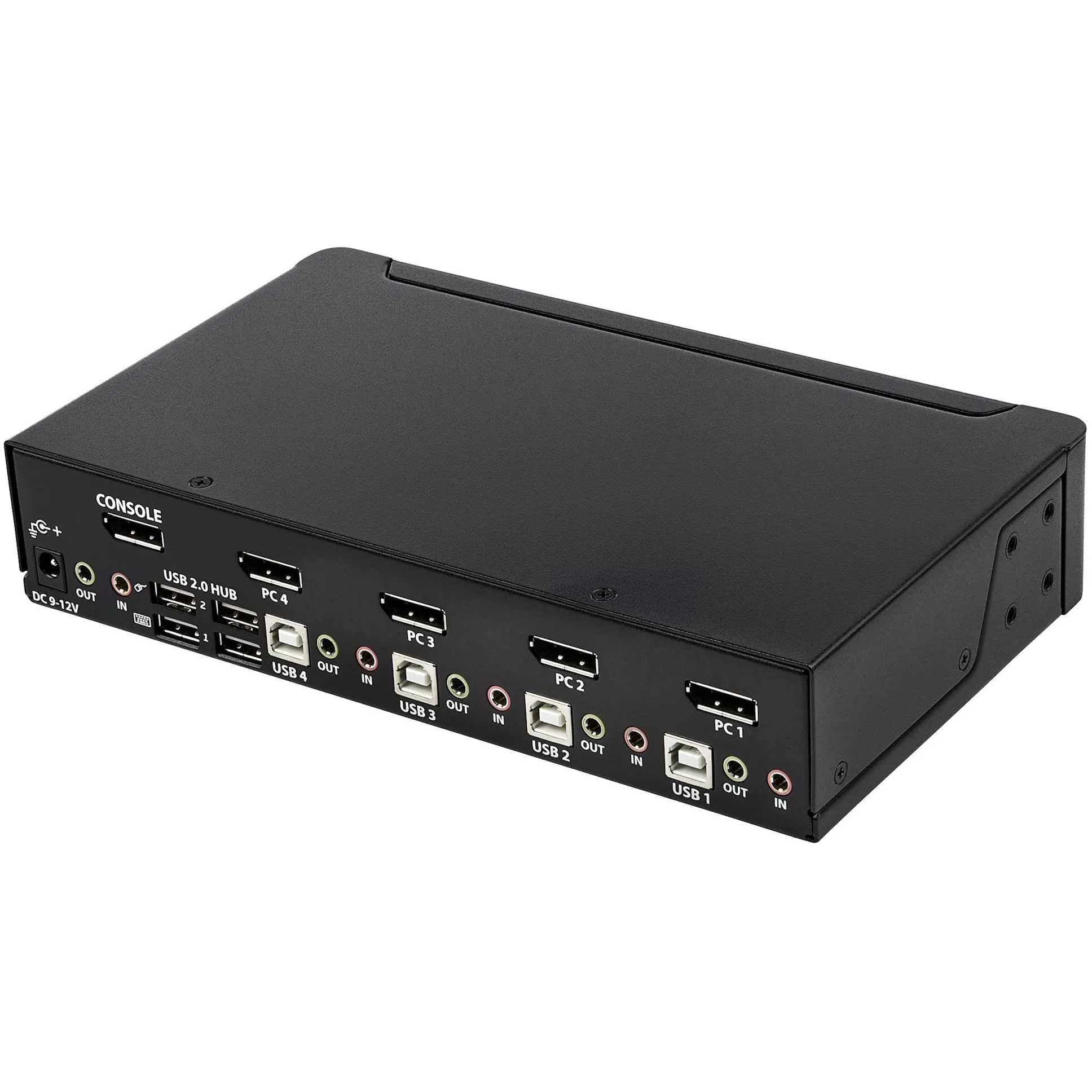 TAA complaint DisplayPort 1.2rKVM - DP KVM switch controls 4 computers from one set of peripherals - Supports resolutions up to 4K at 60Hz - 4 port KVM supports digital 7.1 HD audio and 3.5mm analog audio - 2 port USB 2.0 hub built into USB KVM switch - Front panel push button and hotkey selection with audible switch indicator - PC compatible and MAC compatible with mini DisplayPort adapter - 4K KVM switch is great for high resolution medical imaging