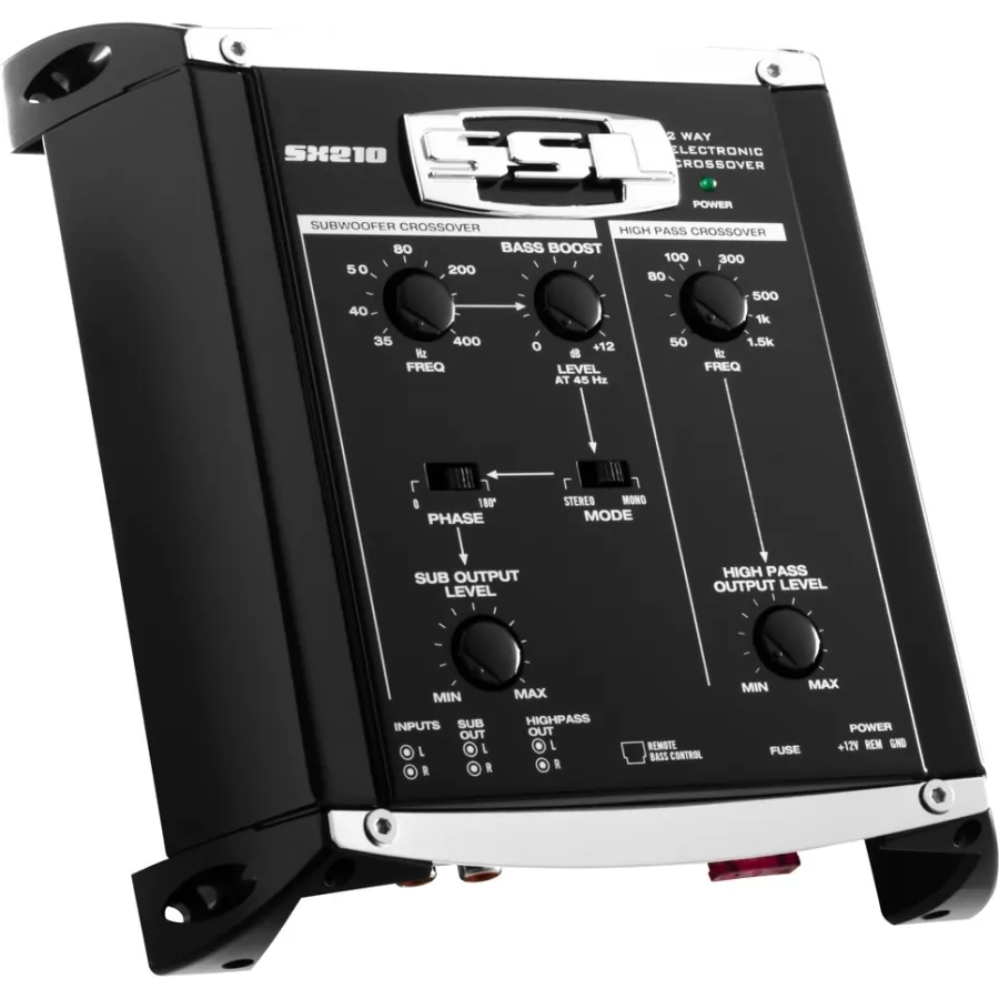 Soundstorm SX210 Electronic Crossover with Remote Subwoofer Level Control, 2 Way:Remote subwoofer level control featureHigh pass and sub outputsVariable crossover frequencies: high pass at 50Hz, 1.5kHz; subwoofer at 35Hz, 400HzSlop: 12 dB/octaveBass Boost: variable 0 - 12 dB at 45HzPhase inversion shift switchStereo/mono switchIndependent high pass and subwoofer level controlsSignal-to-noise ratio: >100 dB