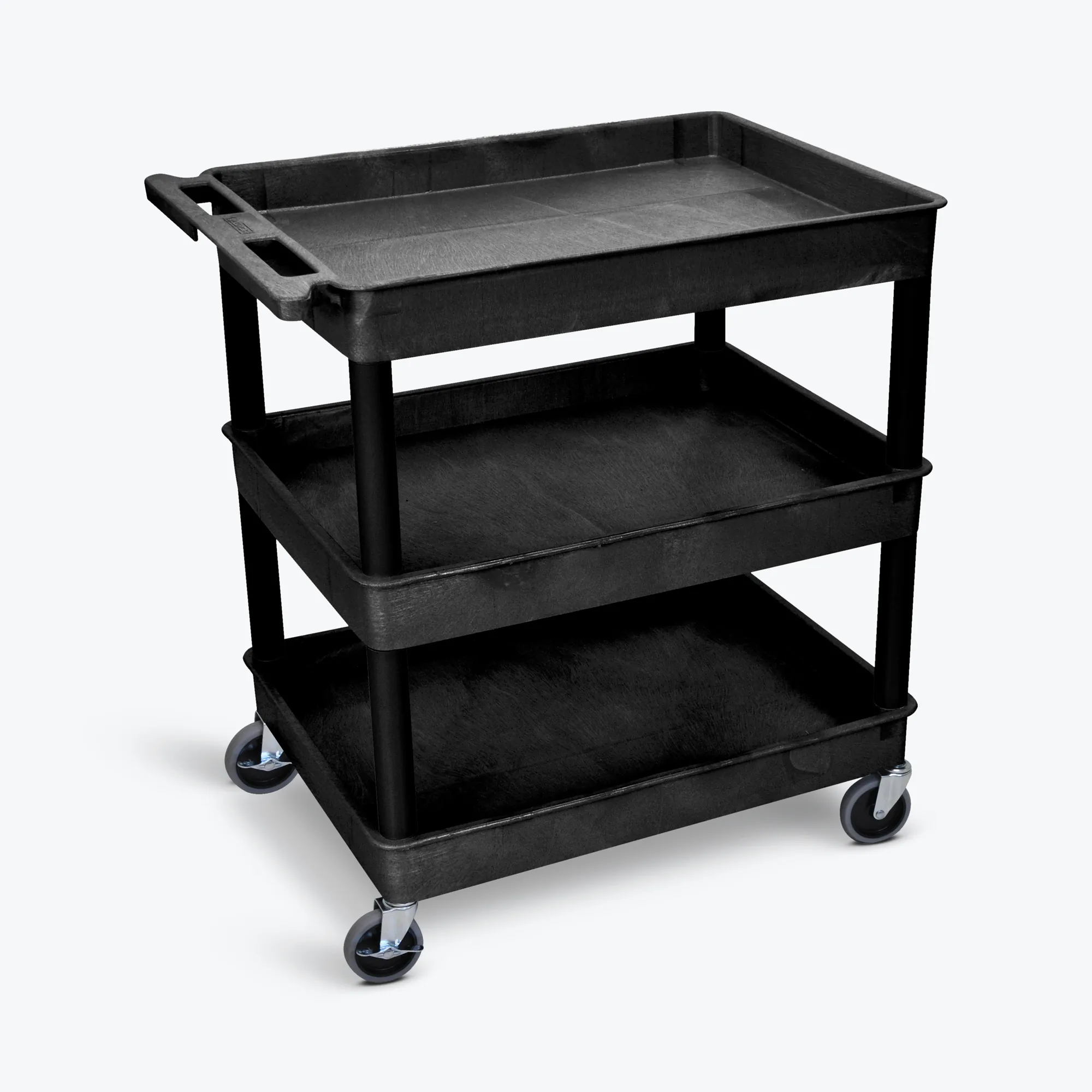 Introducing the Heavy-Duty 3-Shelf Black Utility Tub Cart, designed for maximum durability and functionality. This cart features three spacious 2.75"-deep tubs, perfect for transporting larger quantities of supplies. Constructed from a tough thermoplastic resin, it resists scratches, dents, stains, and rust, ensuring long-lasting use.