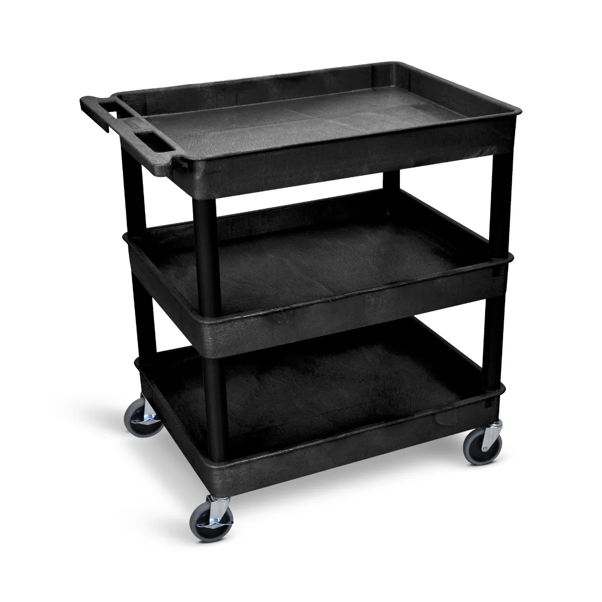 With a sturdy maximum capacity of 400 lbs., the cart is equipped with four 4" heavy-duty casters and a convenient push handle molded into the top shelf, allowing for smooth maneuverability. Safety is enhanced with two locking brakes that securely hold the cart in place when needed.
