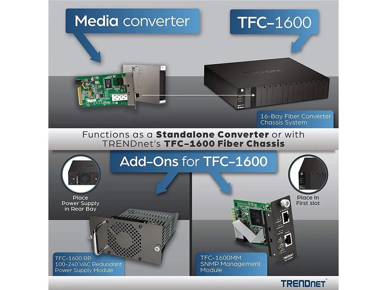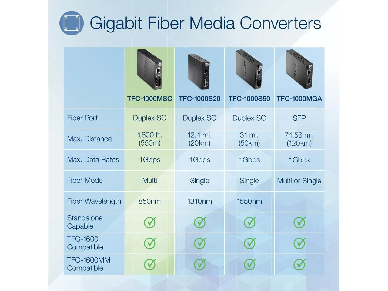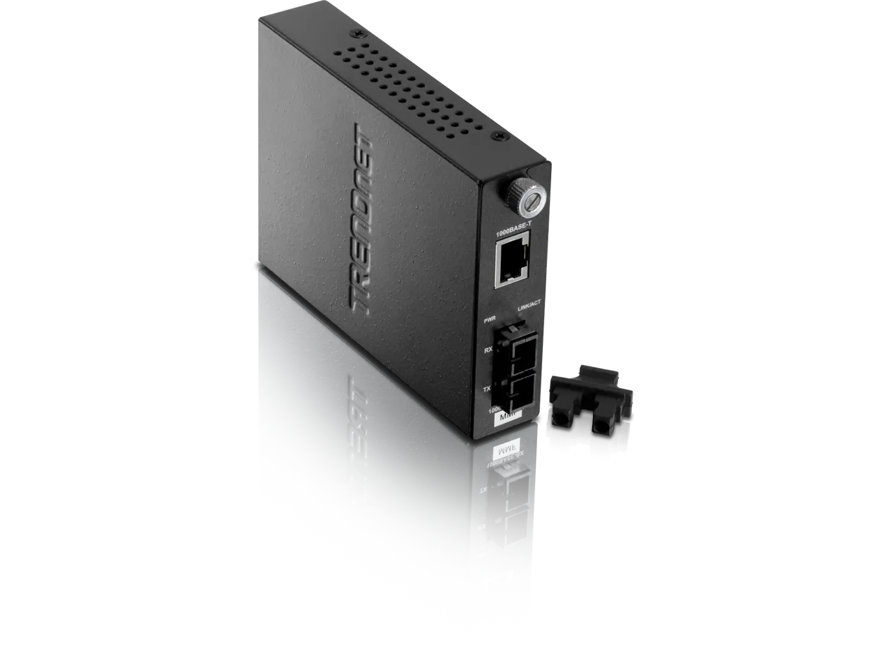 TRENDnet’s TFC-1000MSC, Intelligent Fiber Converter, is compatible with the TFC-1600 chassis system or functions as a standalone unit. This converter is a Multi-Mode SC-Type fiber converter that supports SNMP (when used TFC-1600MM) and spans distances up to 550 m (1,800 ft.). Ports include a 1000Base-T (RJ-45) port and a 1000Base-SX (SC-Type) fiber port. PACKAGE CONTENTS • TFC-1000MSC • Quick Installation Guide • Power Adapter (5 V DC, 1 A)