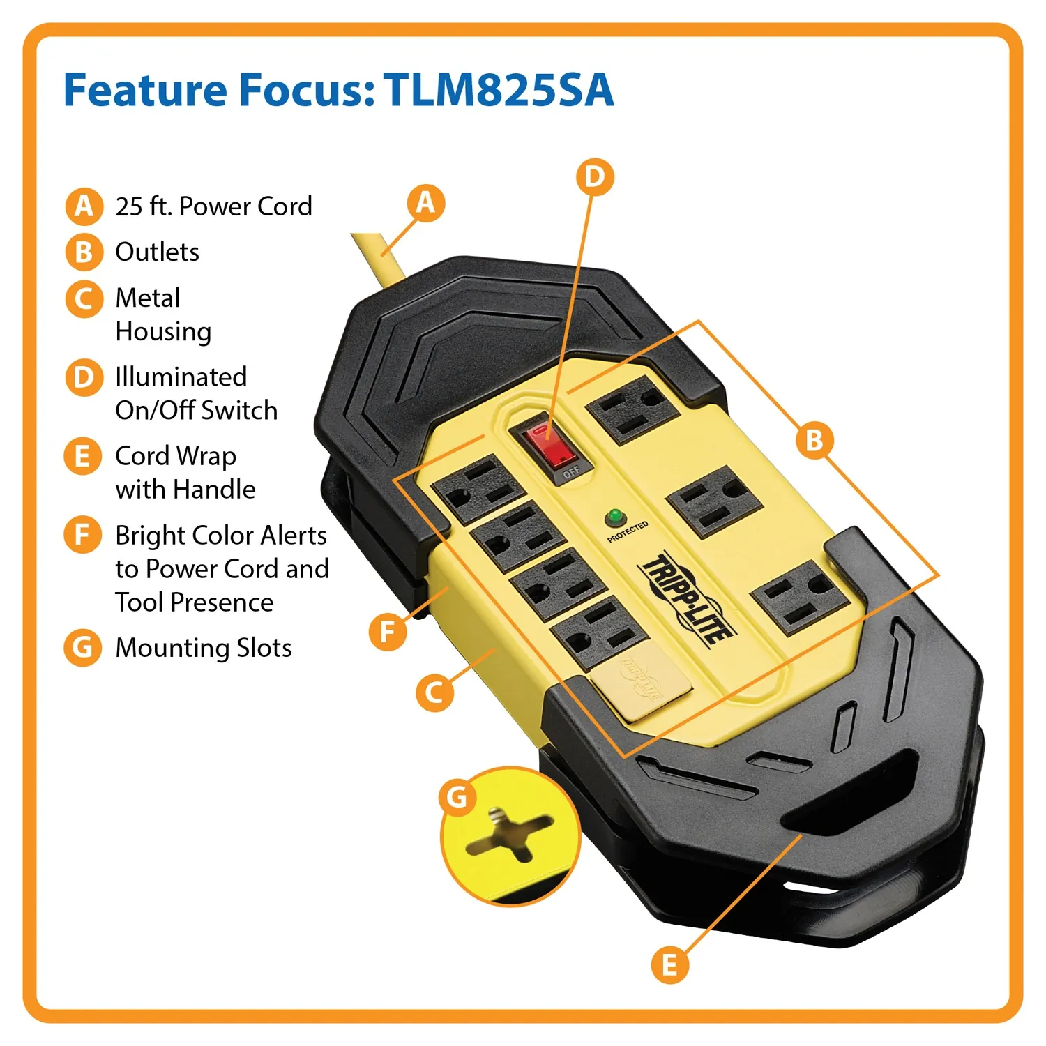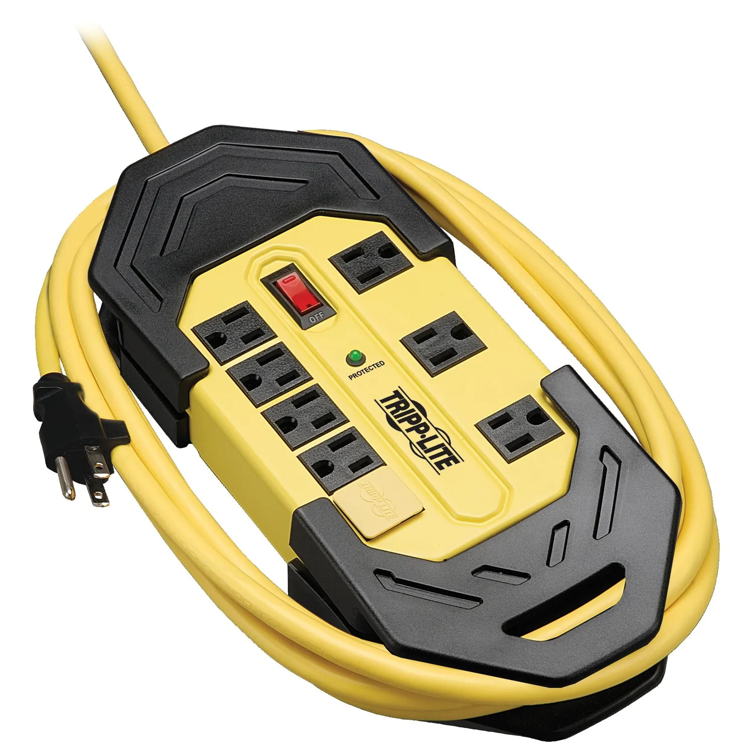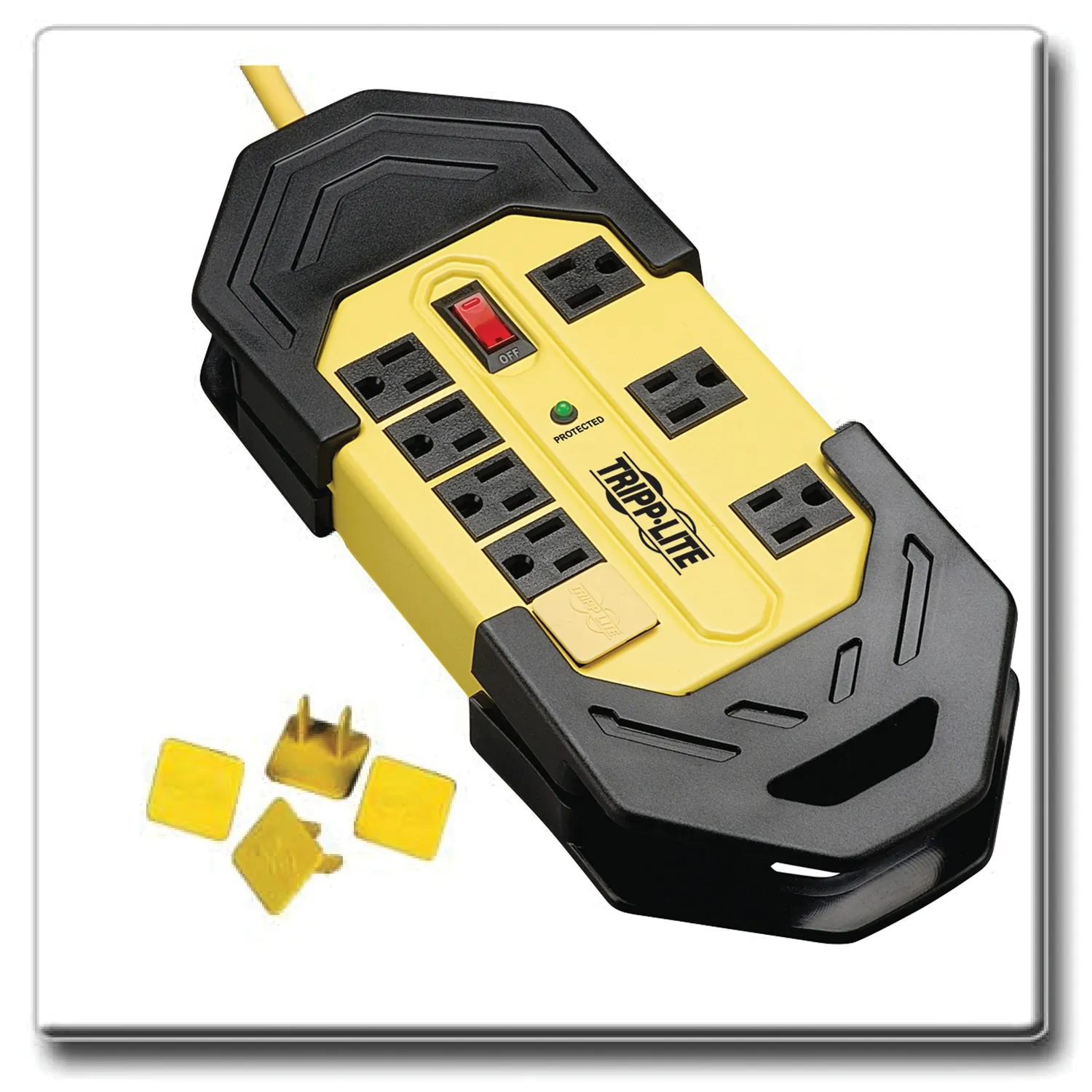 • 8 outlets (including transformer outlets);• 3,900 Joules of surge suppression;• 1,800 watts output;• Cord wrap with hang holes;• Protection status LED;• Lighted power switch with integrated circuit breaker;• Rugged, all-metal case is designed for long life;• Integrated keyhole slots on bottom panel for mounting options;• 25 ft. yellow cord;• Dimensions: 10.26 in. H x 5.13 in. W x 1.57 in. D;• $100,00 Ultimate Lifetime Insurance (US, Canada and Puerto Rico only);• Includes 4 safety covers to shield unused outlets from debris and accidental contact;• Black and Yellow;