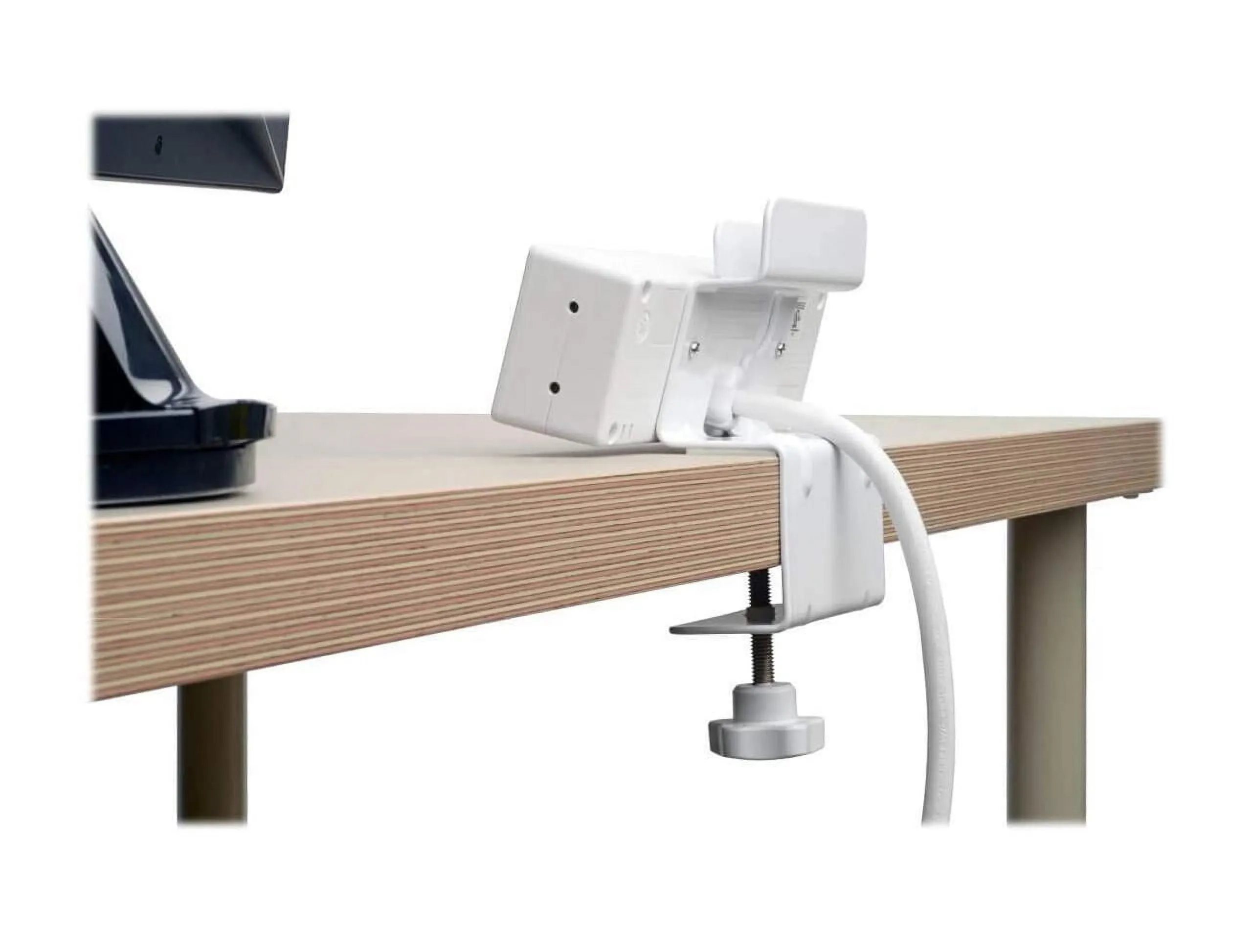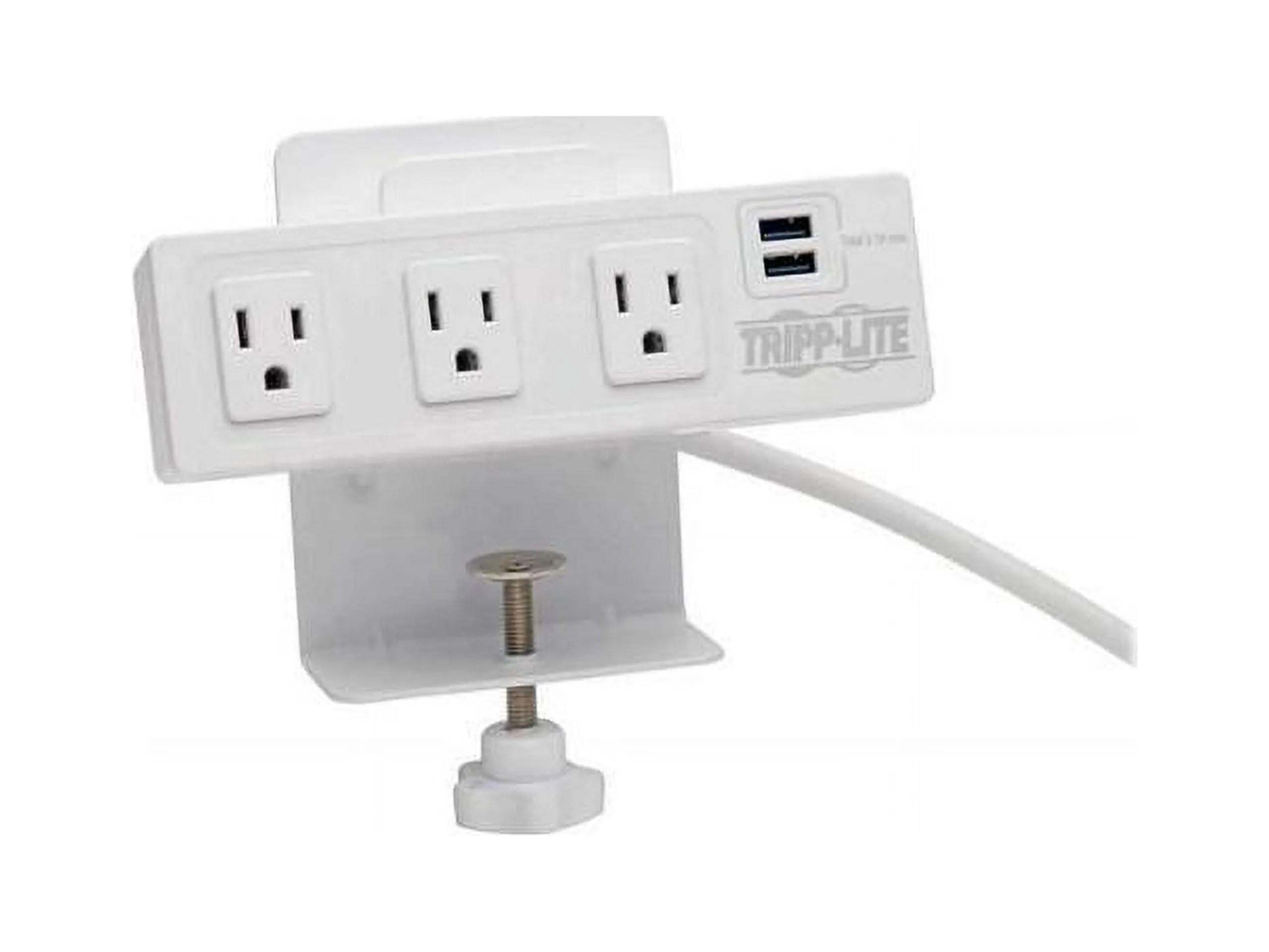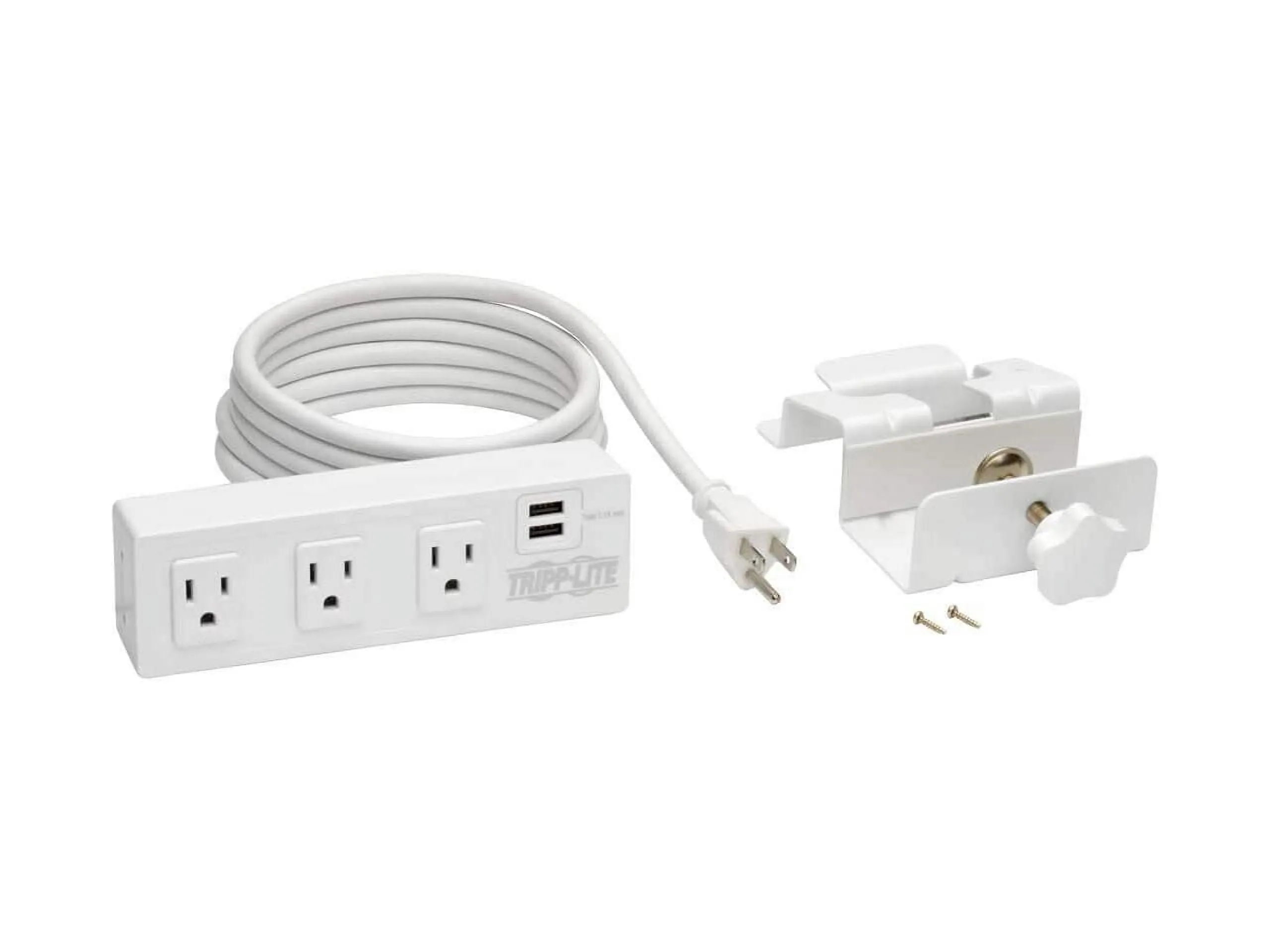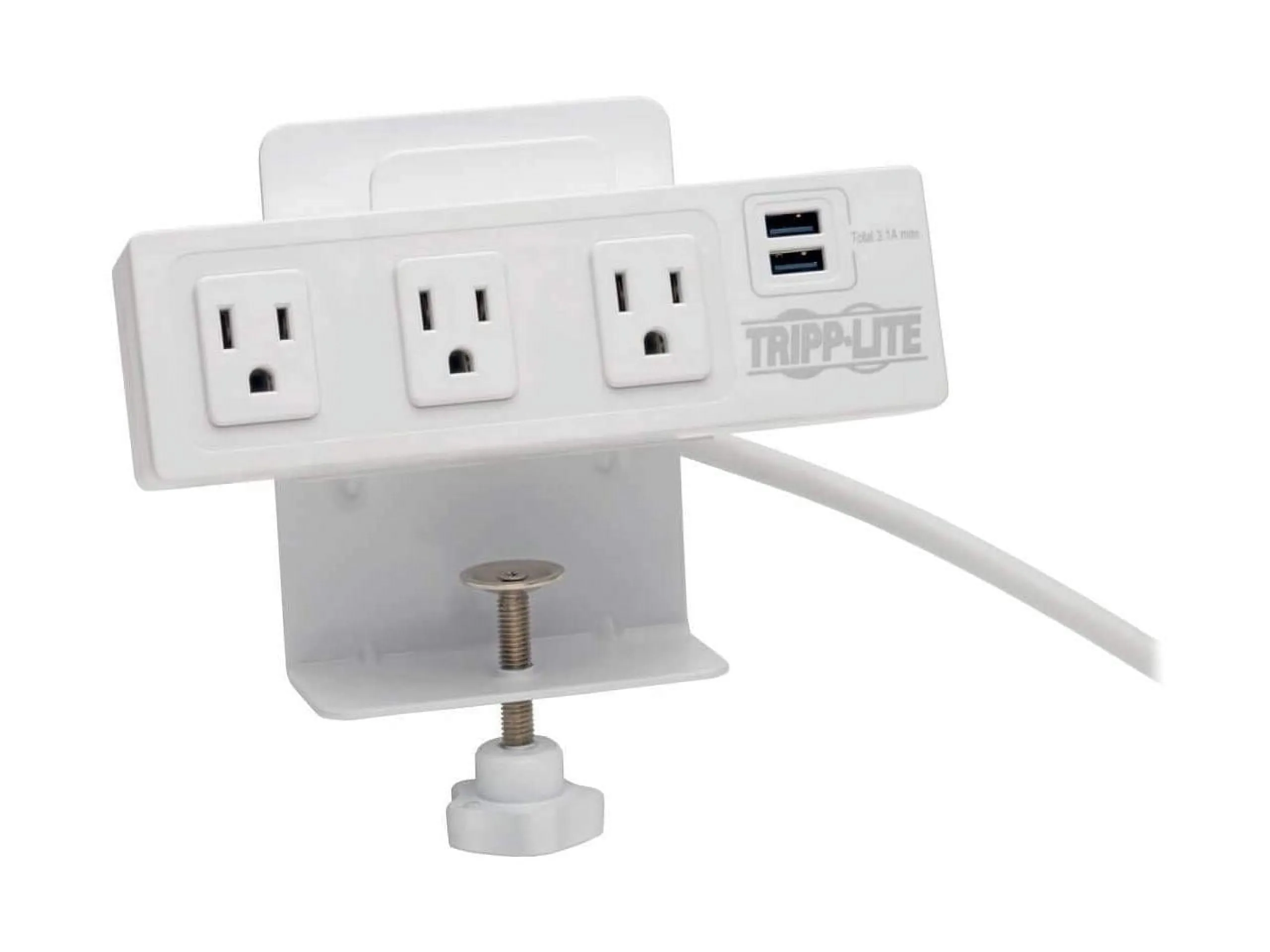 Clamps safely to your workstation to protect your electronics against surges and charge your mobile devices.
