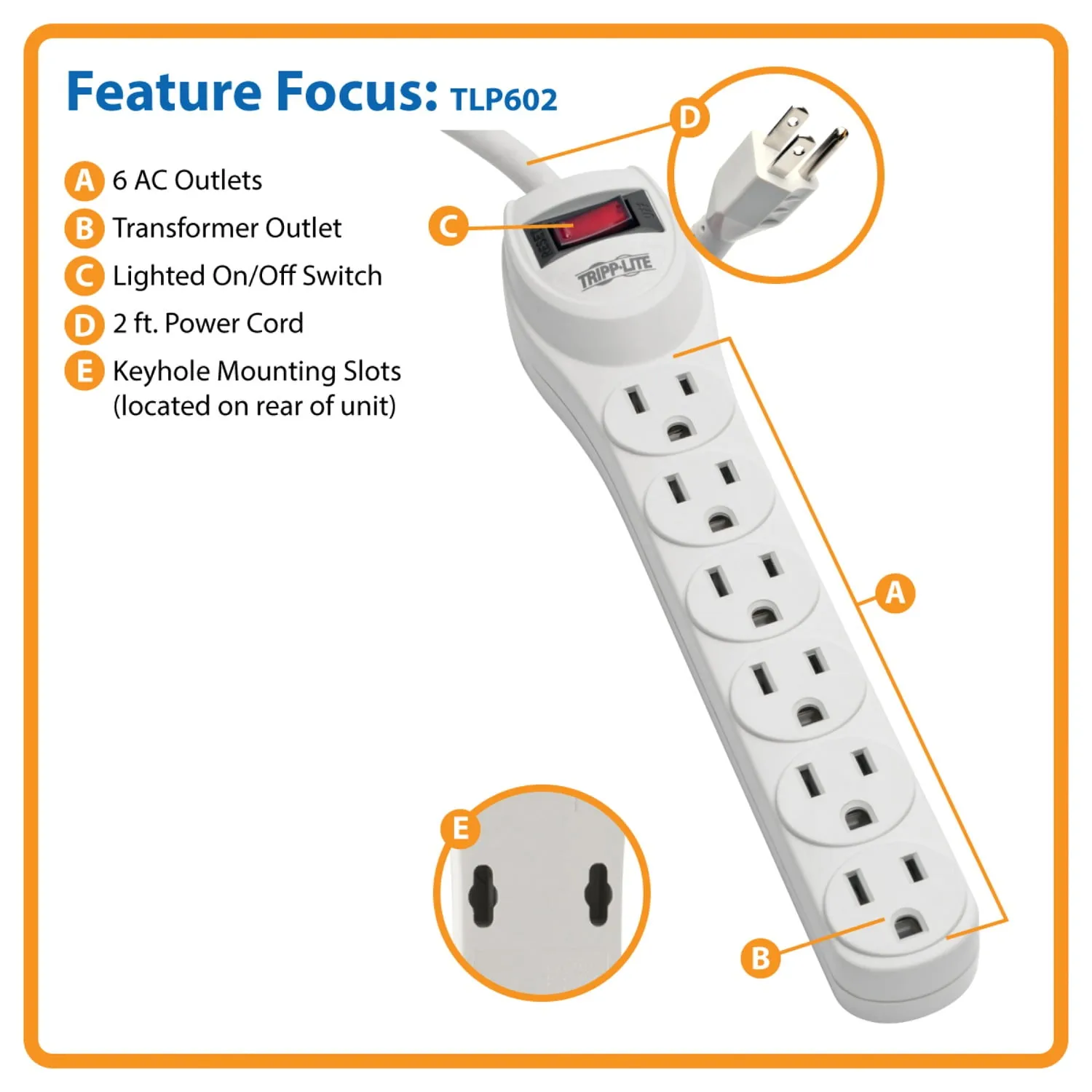 Tripp Lite Surge Protector Power Strip 120V 6 Outlet 2' Cord 180 Joule - 6 x NEMA 5-15R - 1800 VA - 180 J - 120 V AC Input - 120 V AC Output