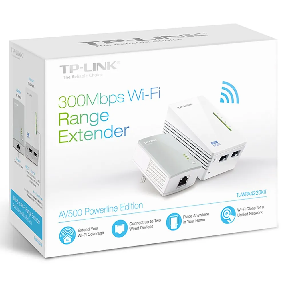 300Mbps AV500 WiFi Powerline Extender Starter Kit extends your Internet connection to every room of the house through your home?s existing electrical circuitry. The TL-WPA4220 features a Wi-Fi Clone Button enabling Super Range Extension, which means it can automatically copy the SSID and Password of your router. In this way, TL-WPA4220 simplifies your Wi-Fi configuration and allows for seamless roaming within your home network.