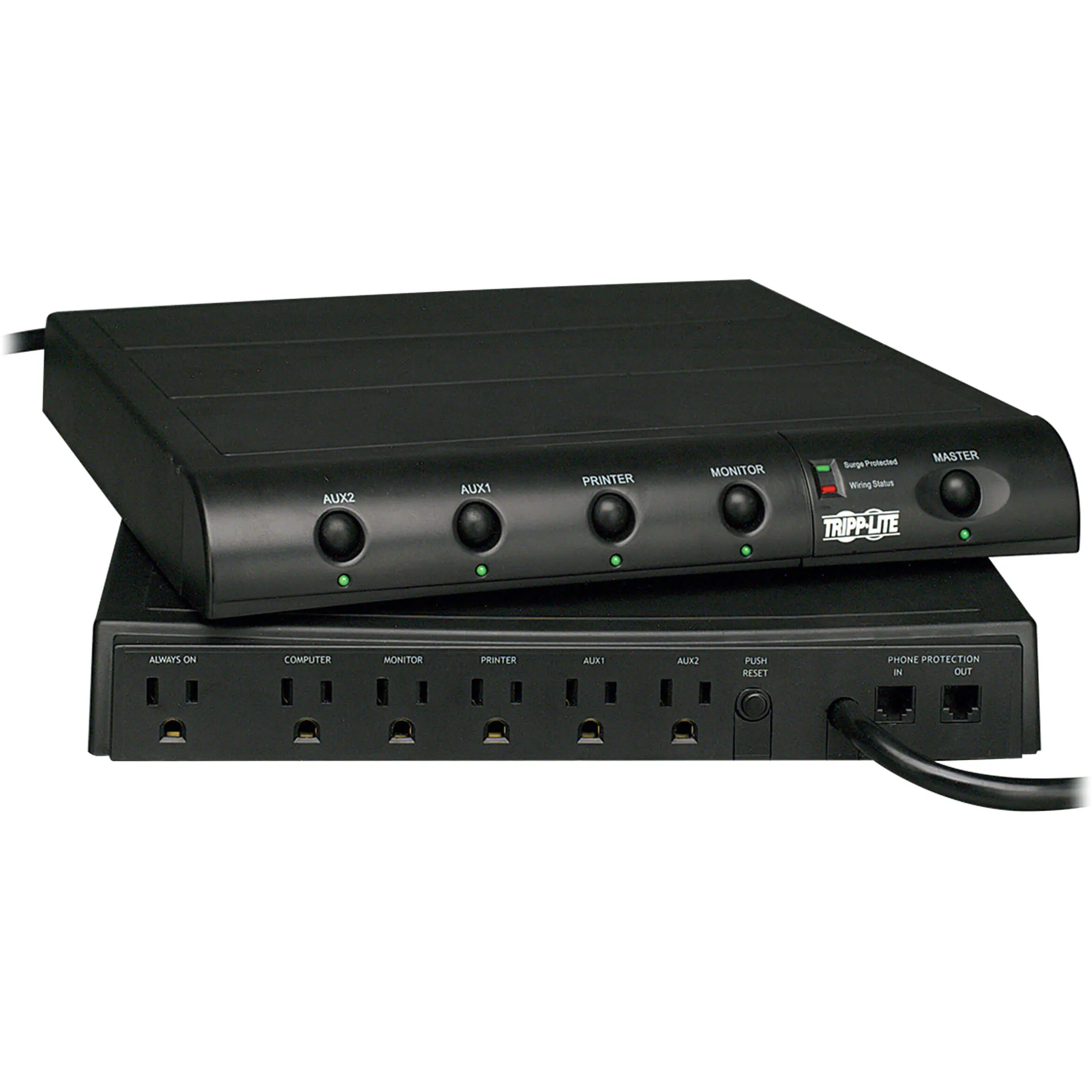 Tripp Lite's TouchMaster 6-Outlet Under-Monitor Surge Protector offers complete AC and phone line surge suppression for comprehensive protection of workstations, desktop PCs, telecom systems and other sensitive electronics. Heavy-grade AC surge suppression shields connected equipment from damage and performance problems due to transient surges. RJ11 telephone line suppression jacks protect dial-up and DSL modem lines, fax machines, cordless phones and more. The attractive, slim design is perfect for use under desktop computer monitors or notebook computers. Individual switches offer power control over connected equipment.