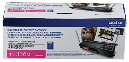 High yield magenta toner cartridge for use with brother hl-l8250cdn, hl-l8350cdw, hl-l8350cdwt, mfc-l8600cdw, mfc-l8850cdw. This is a OEM COLOR TONER BROTHER brand Toner Cartridge (HI MAGENTA TONER) that works with the following printers / machines (HL-L8250CDN, HL-L8350CDW, HL-L8350CDWT, MFC-L8600CDW, MFC-L8850CDW). Product Features: Cartridge Yield: High Yield Compatible with: Brother HL-L8250CDN, HL-L8350CDW, HL-L8350CDWT, MFC-L8600CDW, MFC-L8850CDW Duty Cycle: Up to 3500 pages ISO/IEC 19798 Printing Color: Magenta Printing Technology: Laser Product Description: Brother TN336M - High Yield - magenta - original - toner cartridge Product Type: Toner cartridge Key Selling Points:, Brother Genuine TN336M High Yield Magenta Toner Cartridge., Professional color laser print quality you can consistently rely on for 3,500 pages. (Approx. toner cartridge yields in accordance with ISO/IEC 19798 (letter/A4))., Intelligently engineered to work in seamless unison with your Brother printer., Brother Genuine toner produces rich, vibrant prints that withstand the test of time. Benefits of this product: Brother Genuine TN336M High Yield Magenta Toner cartridge delivers crisp, professional color laser output. HIGH YIELD MAGENTA TONER. HL-L8250CDN, HL-L8350CDW, HL-L8350CDWT, MFC-L8600CDW, MFC-L8850CDW. OEM BROTHER Brand.