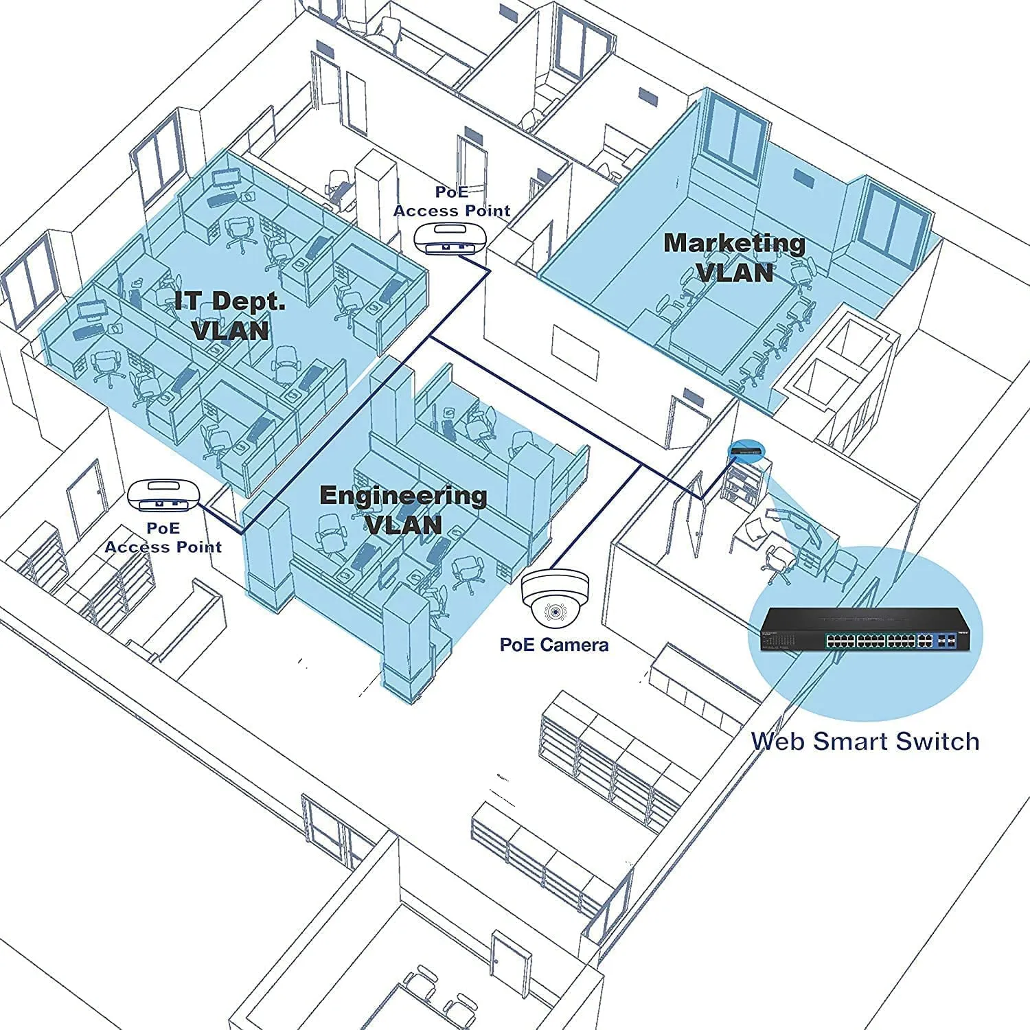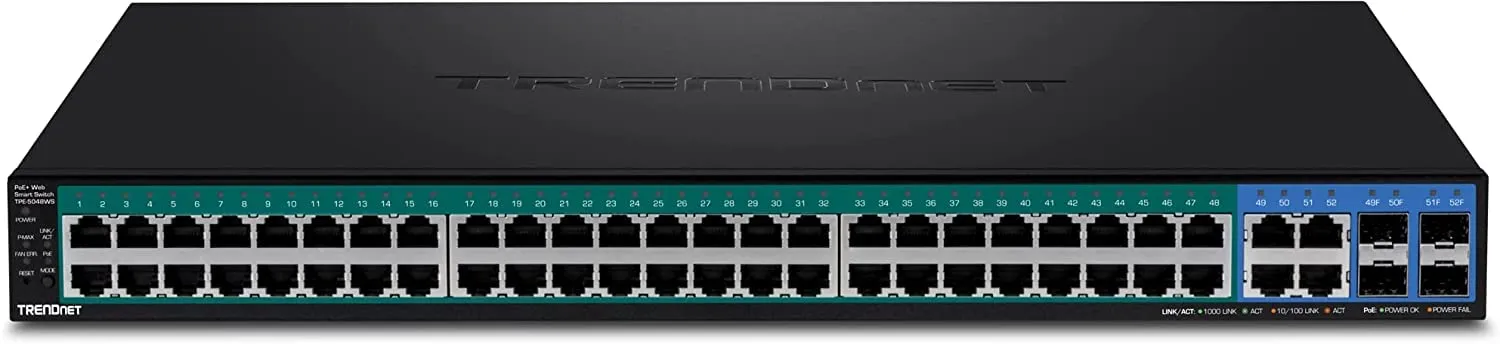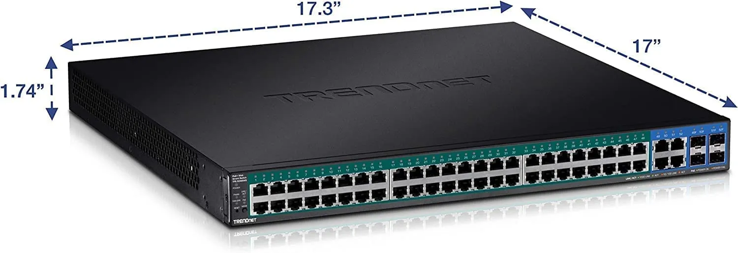 48 x Gigabit PoE+ ports4 x Shared Gigabit ports (RJ-45 or SFP)740W PoE power budgetEasy-to-use web-based management interfaceSupports IPv6, LACP, VLAN, QoS, and IGMP SnoopingBandwidth control per portPrivate and Voice VLAN supportSmart Fan104Gbps switching capacityIEEE 802.1p QoS with queue scheduling supportLifetime TRENDnet Manufacturer Warranty