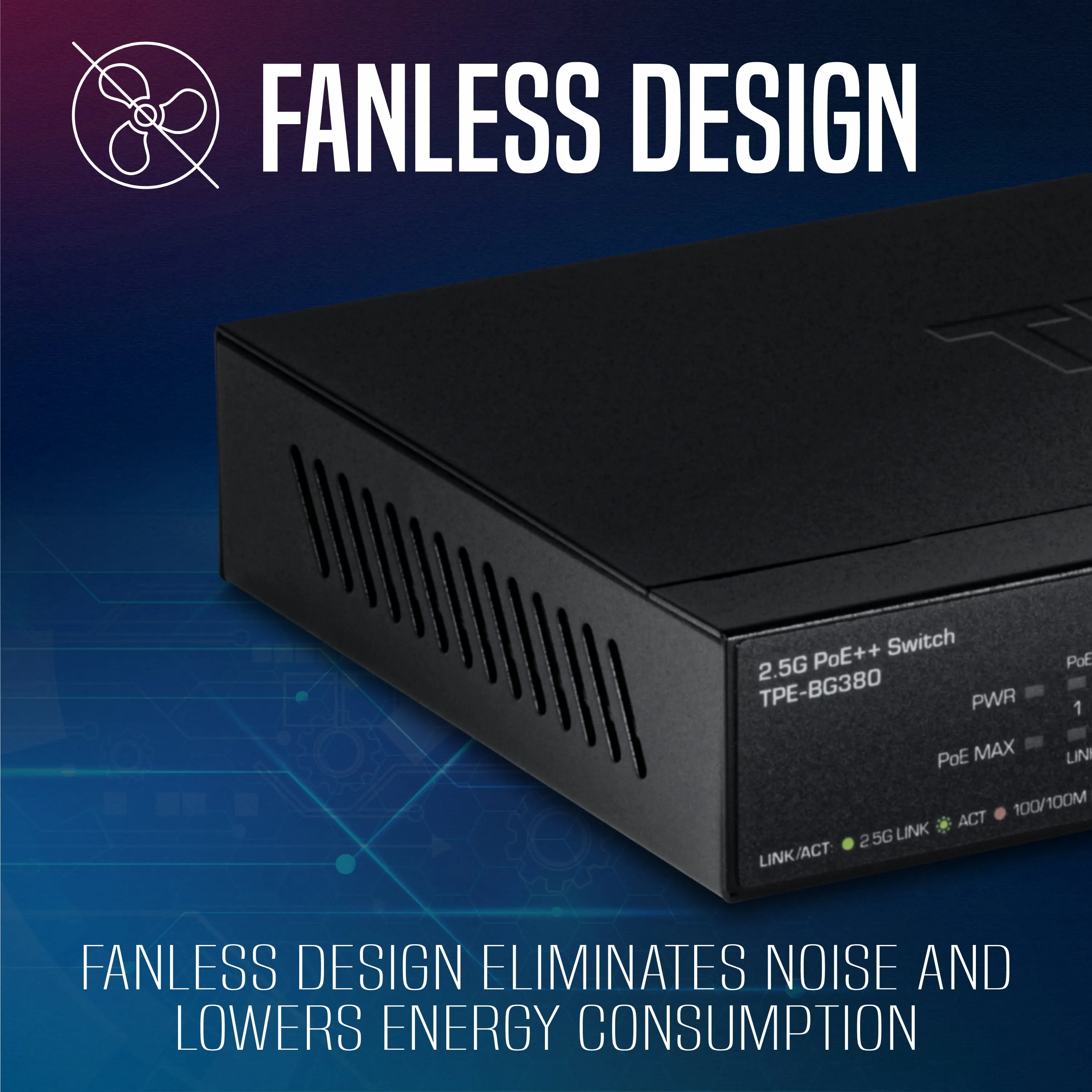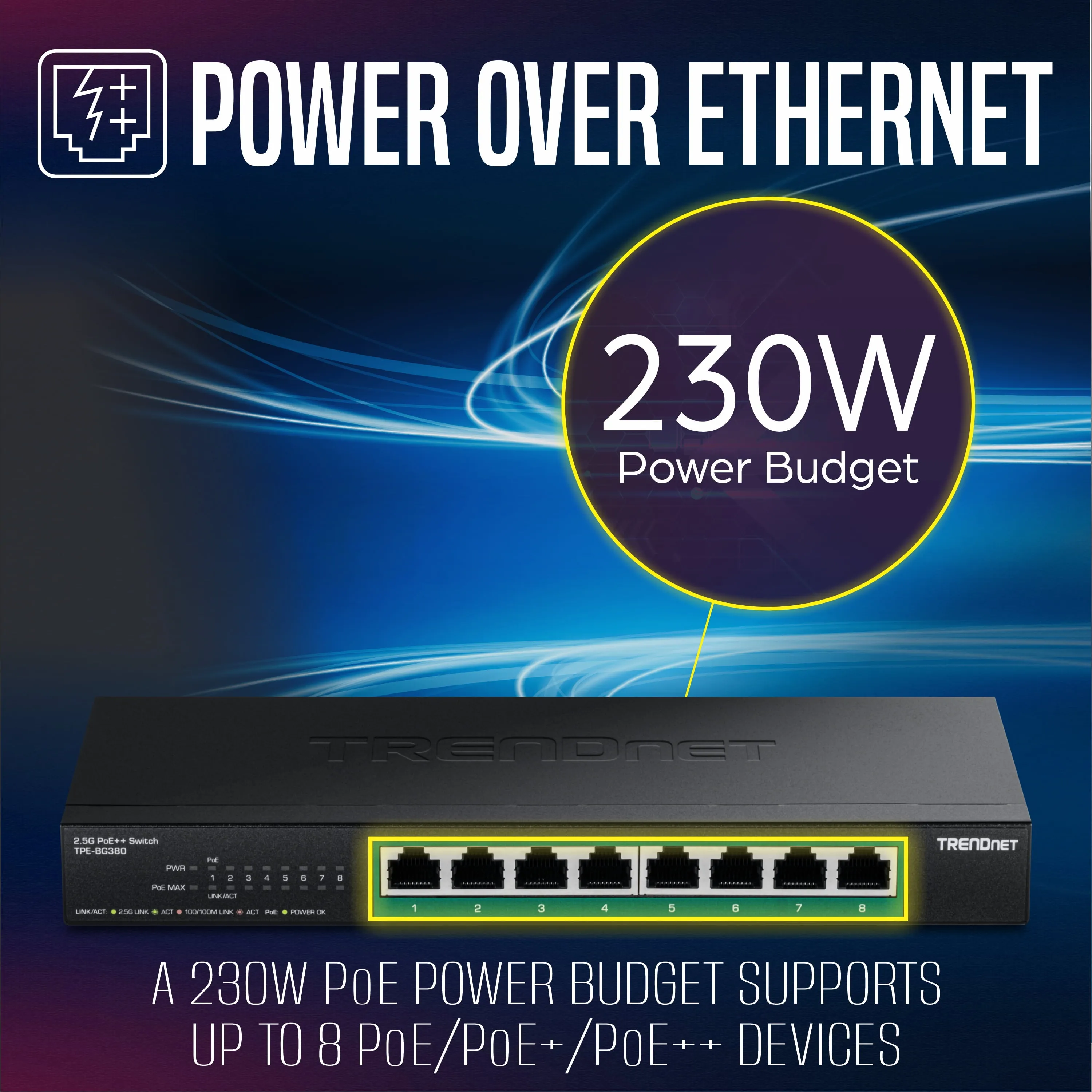 This 8-Port 2.5G PoE++ Switch provides exceptional performance with all ports supporting 230W of PoE power budget. It is backwards compatible with 10/100/1000Mbps devices and is designed to work with existing Cat5e or better cabling. The fanless design ensures silent operation, and its wall-mountable feature offers installation flexibility for various environments.