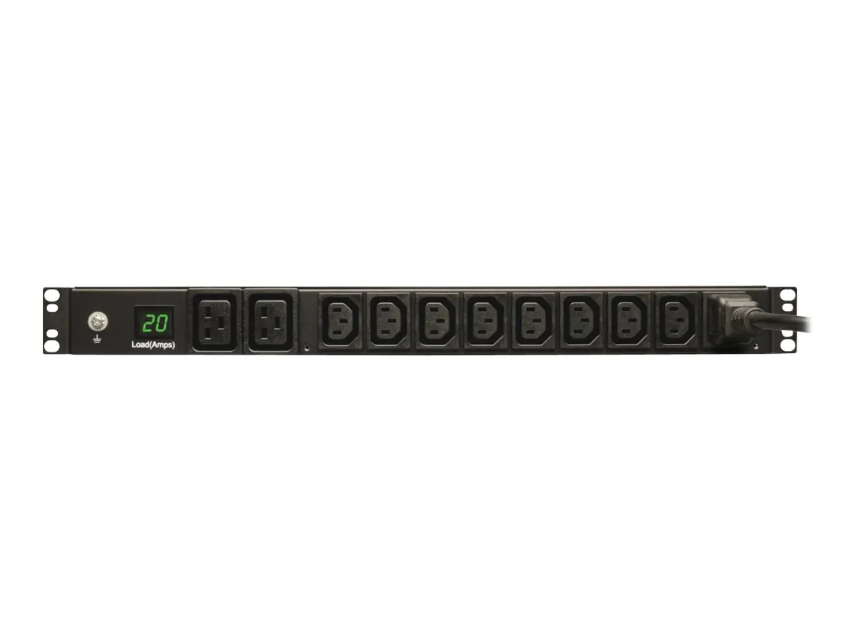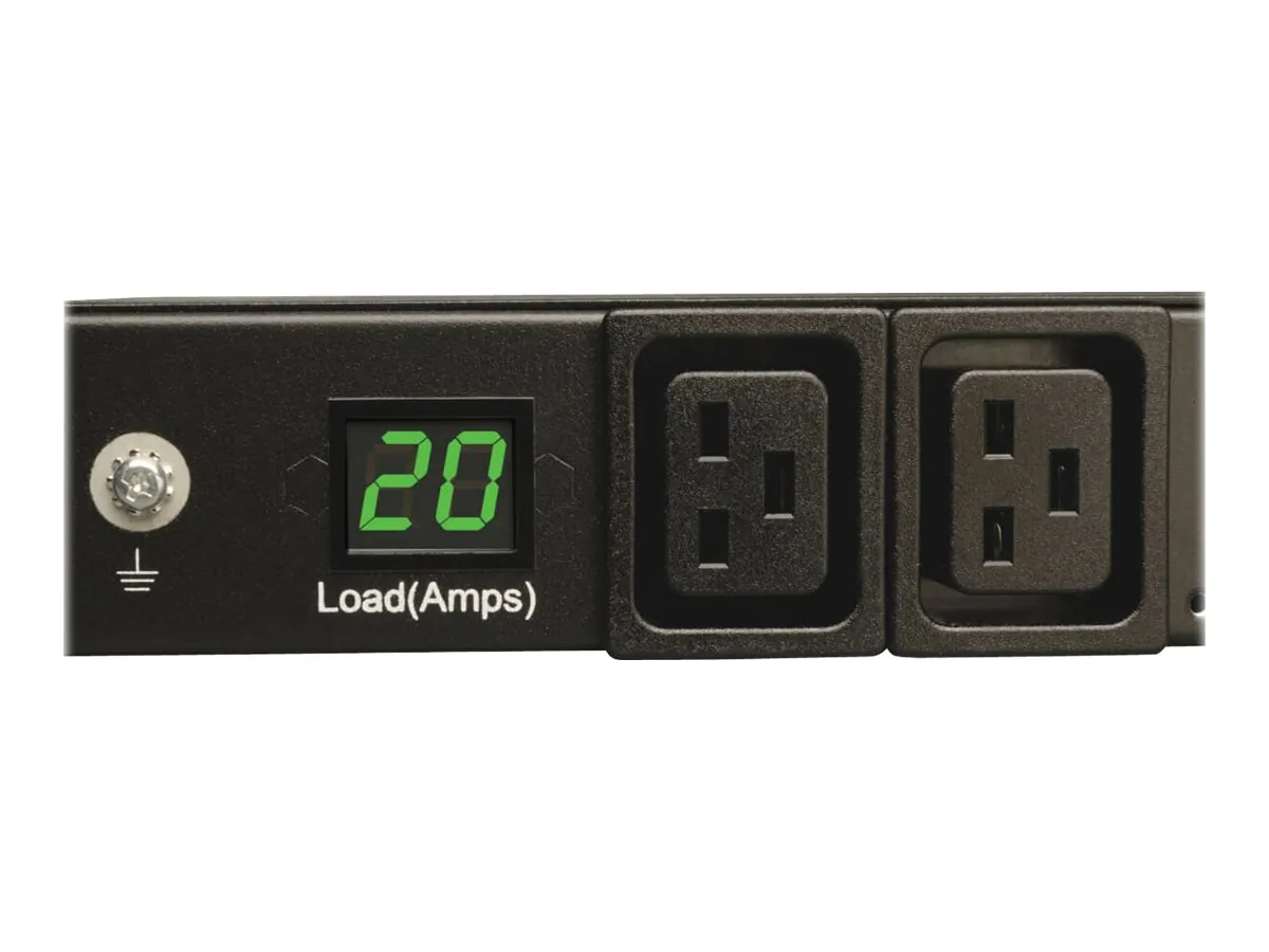 PDUMH20HV Metered, 1U rack PDU supports 20A maximum capacity at 208/240 & 230V (agency de-rated to 16 amps). Includes C20 inlet and detachable input cable with both C20 and L6-20P input plug options. 10 total output receptacles (8 C13 and 2 C19). Visual current meter tracks the output current of all outlets combined. Supports 1U rackmount installation in 19 inch 2 or 4 post racks. Included cord retention bracket keeps vital network equipment plugged in and continuously powered. Tripp Lite Metered Power Distribution Units give IT Managers the ability to monitor network power consumption levels to prevent mains, generator, UPS or PDU overloads and to ensure proper load balance in complex redundant power applications. Built-in, easy to read, two-character LED display offers continuous PDU current monitoring data in one-amp increments. Switch-free unfiltered electrical pass-through reliably distributes UPS or generator power to multiple servers and vital networking equipment in rack enclosures, network closets and more. Included mounting brackets support horizontal installation in 19 inch racks or other surfaces, such as under-counter or wallmount configurations. Key Features 208/240 & 230V metered 1U horizontal mount Power Distribution Unit (PDU) 20A maximum capacity (Agency de-rated to 16A) Includes L6-20P and C20 line cord options (detachable via C20 inlet) 10 total output receptacles (8 C13 and 2 C19) Outlets are arranged in a single unbreakered, metered load bank Current meter offers the ability to monitor network power consumption levels to prevent mains, generator, UPS or PDU overloads and to ensure proper load balance in complex redundant power applications Easy to read, two-character LED display offers continuous whole-PDU current monitoring data in one-amp increments Included cord retention brackets keep vital network equipment plugged in and continuously powered 1U rackmount installation supported in 2 or 4 post racks Typical Applications Ideal for network configurations requiring a metered PDU Package Includes Rackmount PDU Rack mounting brackets