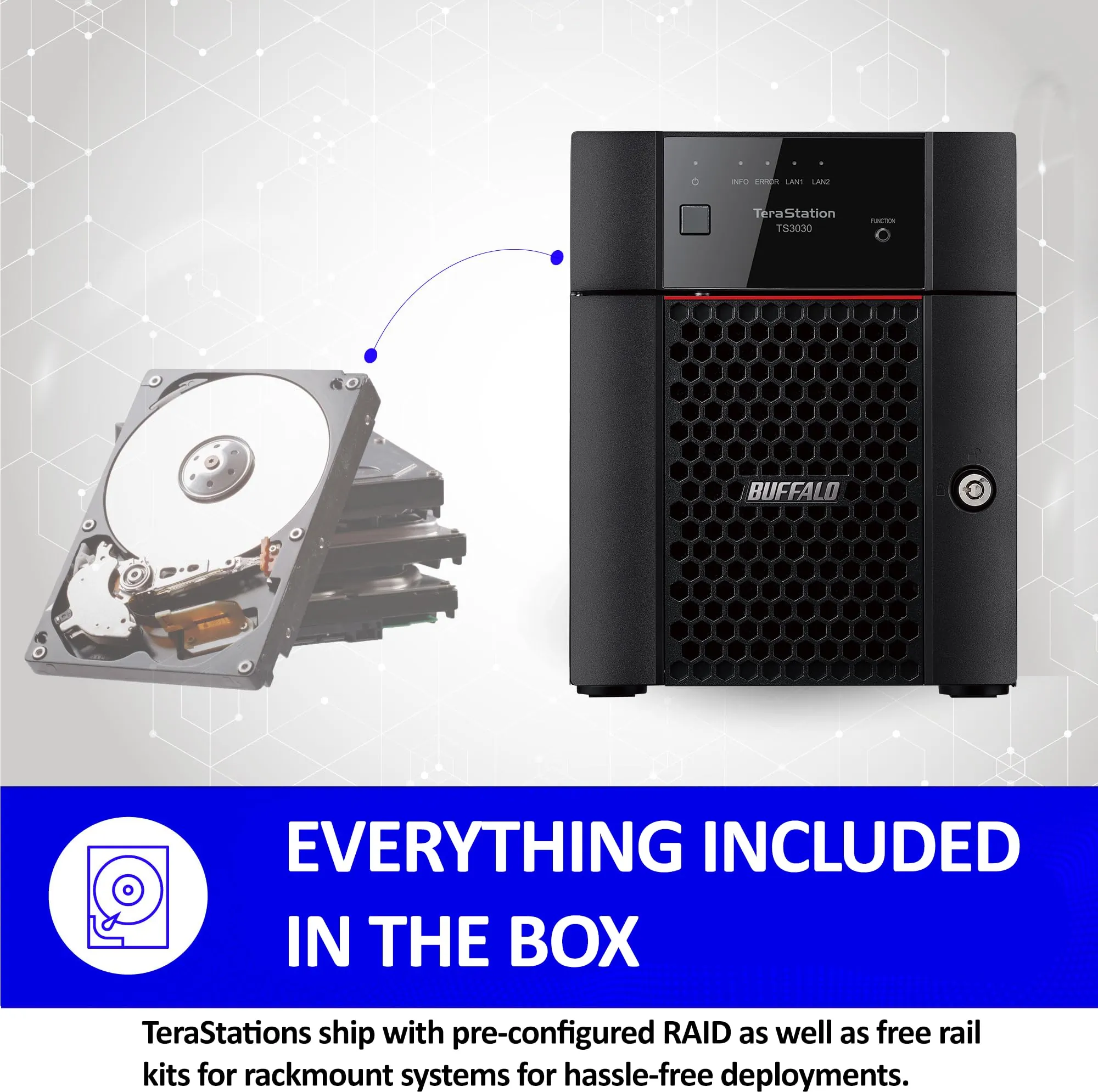 The Buffalo TeraStation 3430DN is a versatile and reliable NAS solution that comes partially populated with 8TB of storage (2x4TB HDDs included). Ideal for both home and small business use, it features dual open drive bays for future expansion and supports 2.5GbE connectivity. With built-in RAID and iSCSI support, it ensures your data is safe and easily accessible.