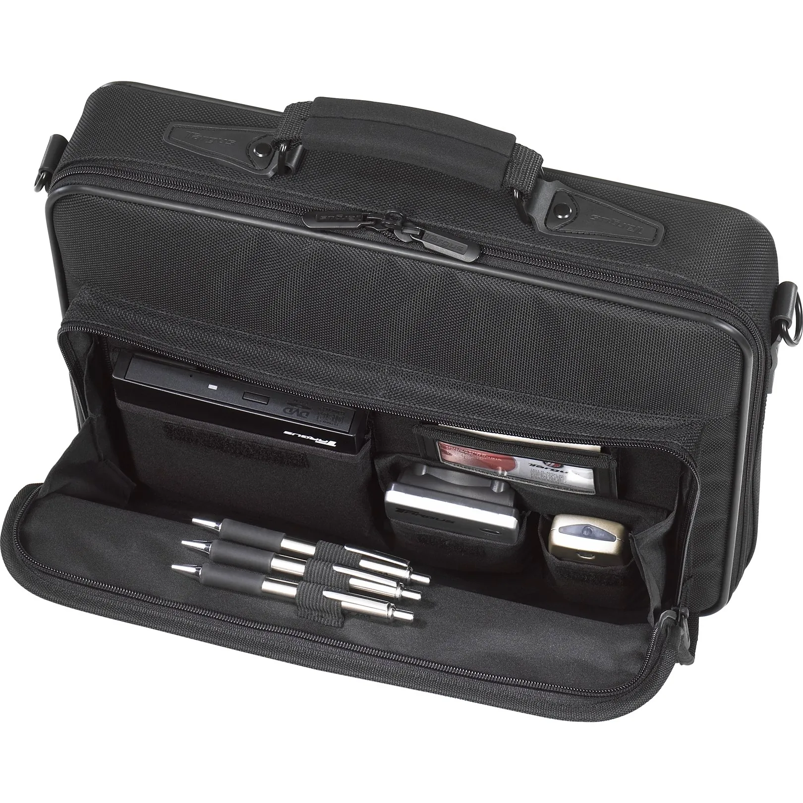 The Targus Premiere Laptop Case has a padded laptop compartment designed to fit laptops with up to 15.4? screens. The front pocket workstation includes pockets for a cell phone/PDA, business card/ID holder and pen loops for added convenience. The interior slip pocket allows for additional document storage while traveling. A padded/removable shoulder strap and padded carry handle make this case easy to transport. If you need a sturdy yet lightweight case while traveling, this case has plenty of space to store your mobile accessories.