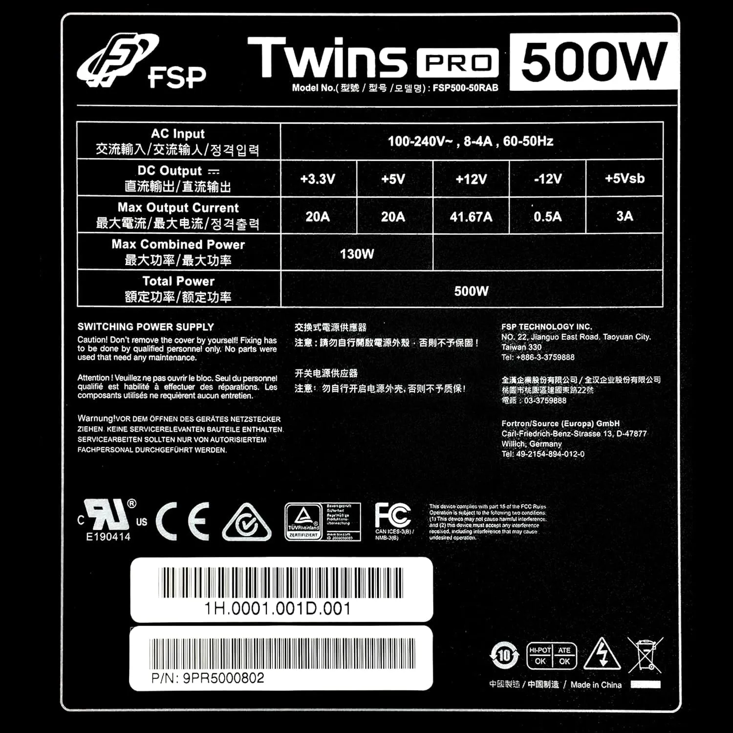 The FSP Twins PRO 500W is a high-performance ATX power supply designed for reliability and efficiency. With its 80 PLUS GOLD certification, it ensures optimal power consumption and lower heat generation, making it an excellent choice for modern computer systems.