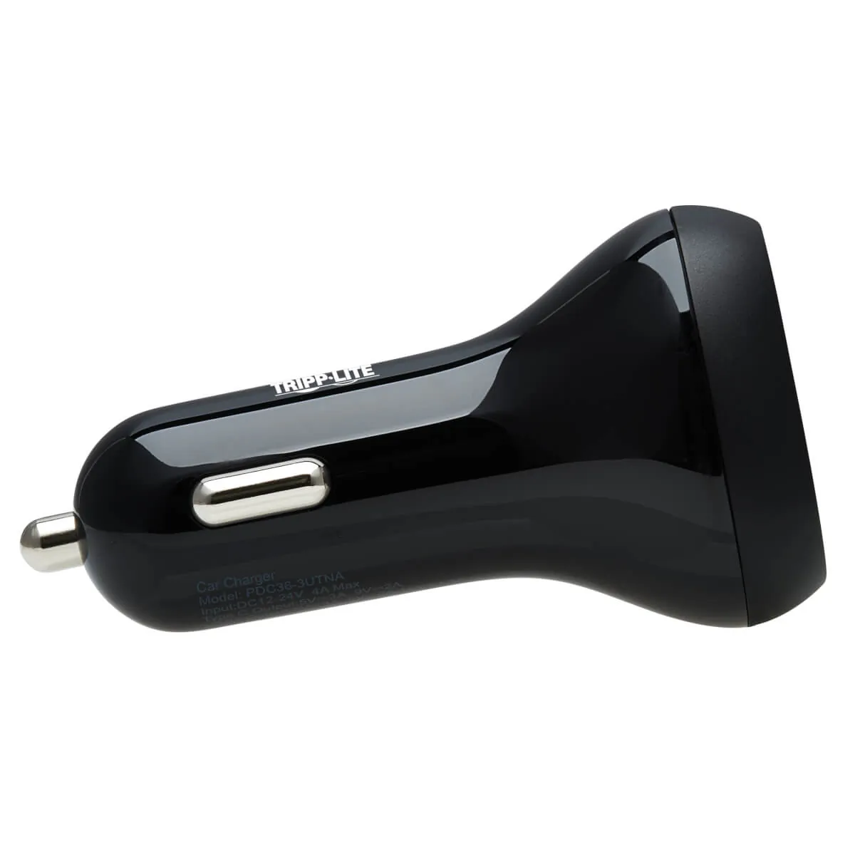 USB CAR CHARGER 3-PORT 36W MAX CHARGING USB C, 2 USB-A BLACK