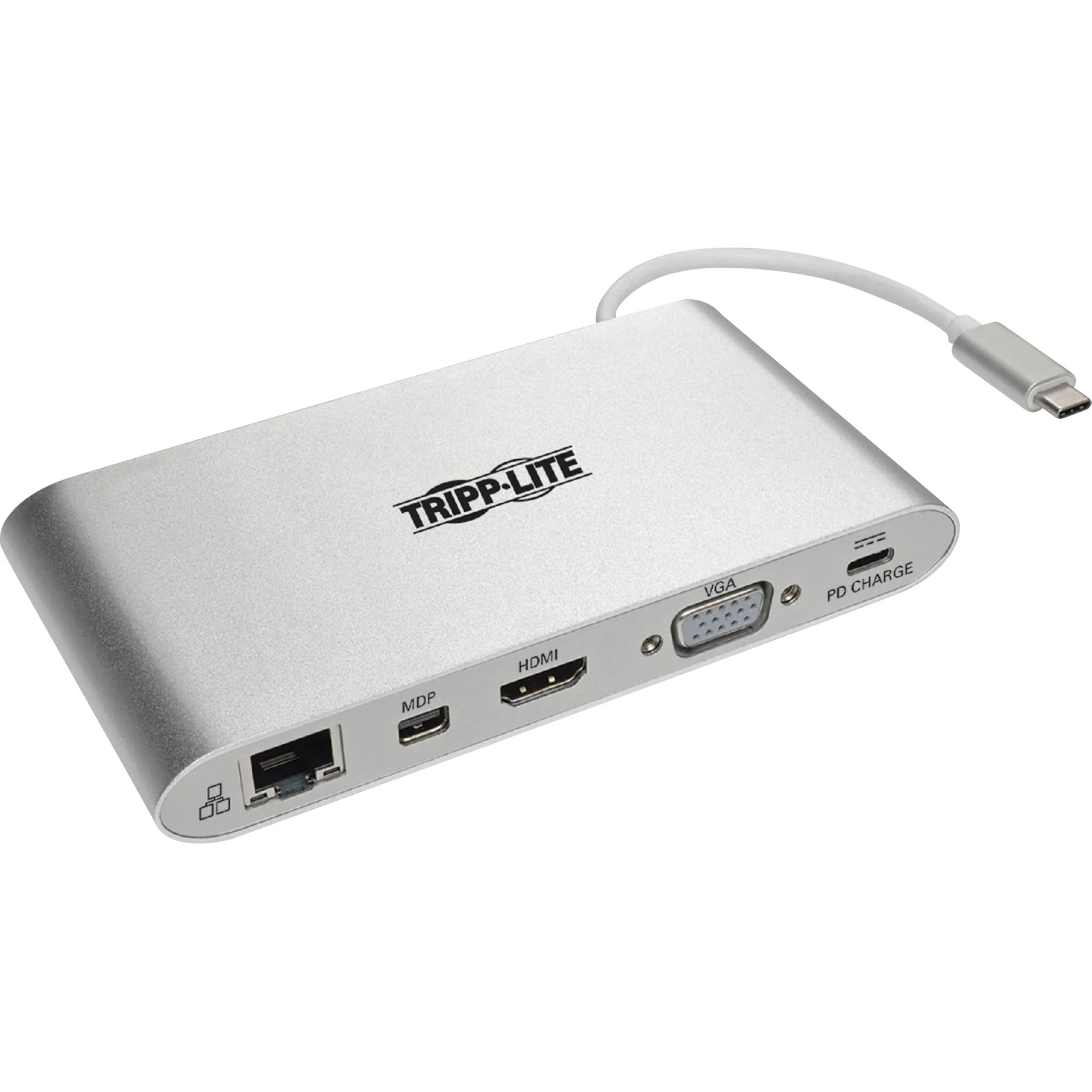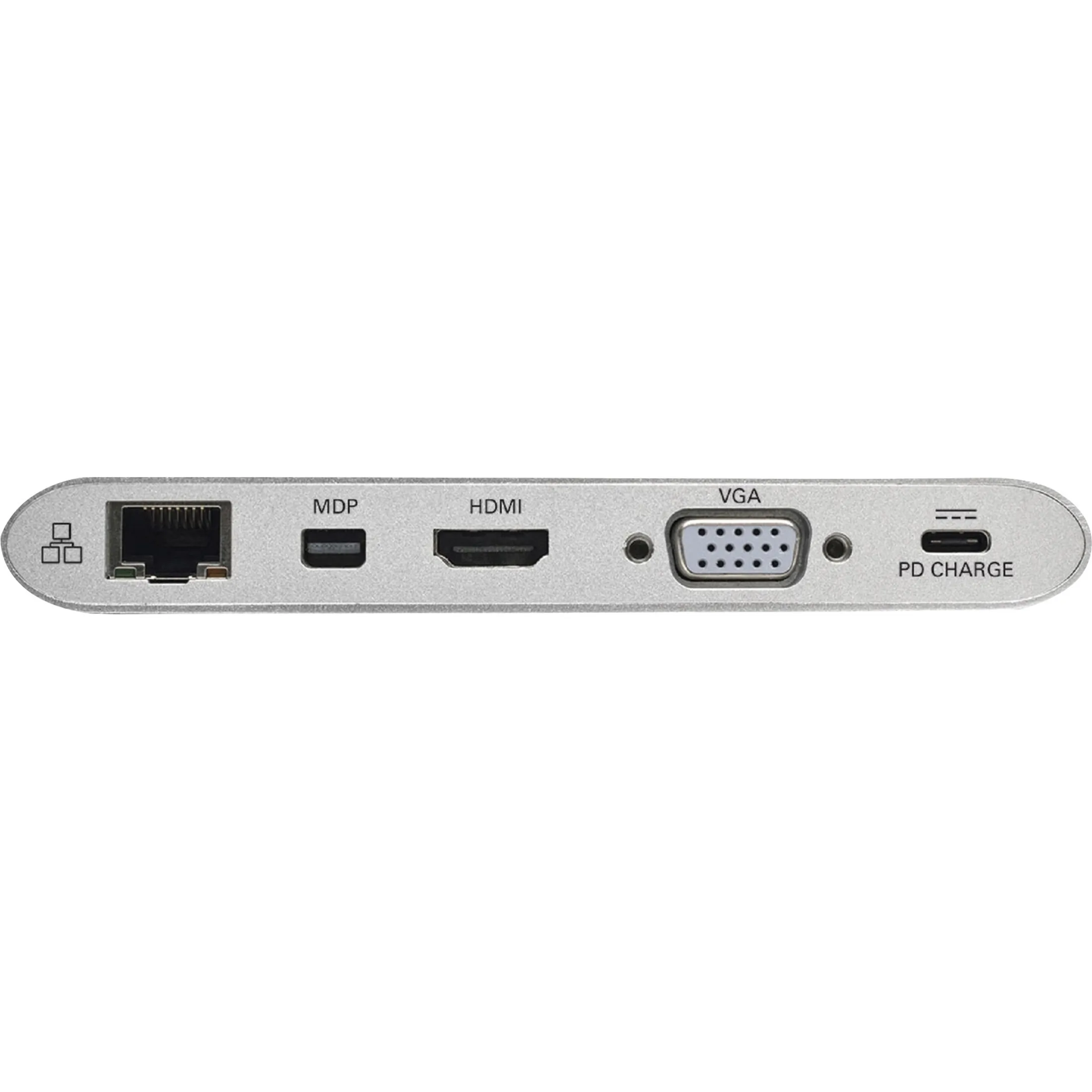 Marketing Information:USB 3.1, generation 1 USB-C Docking Station turns your MacBook, Chromebook, tablet or laptop into a versatile workstation. By connecting its built-in cable to your device's USB-C or Thunderbolt 3 port, you'll be able to add an external display, access Gigabit Ethernet networks, transfer data, display video and more. Mini DisplayPort (mDP), VGA and HDMI ports allow you to connect an external display (one display at a time). The mDP and HDMI ports support UHD video resolutions up to 3840 x 2160 (4K x 2K) at 30 Hz. The VGA port supports HD video resolutions up to 1920 x 1200, including 1080p, at 60 Hz. Connect a Gigabit Ethernet cable (sold separately) to the RJ45 port to access true 10/100/1000 Mbps network speeds. A dedicated BC 1.2-compliant USB port provides up to 1.5A of fast-charging power. Micro SD and SD/MMC memory card slots provide access to external memory. A 3.5 mm audio jack is convenient for connecting speakers, headphones or a microphone to your connected device.