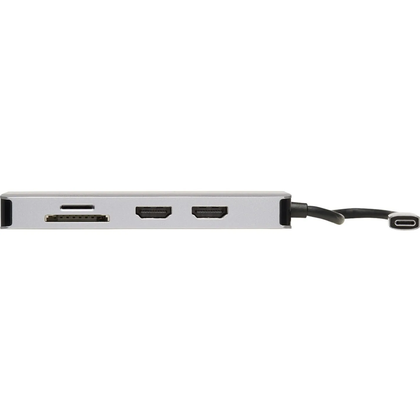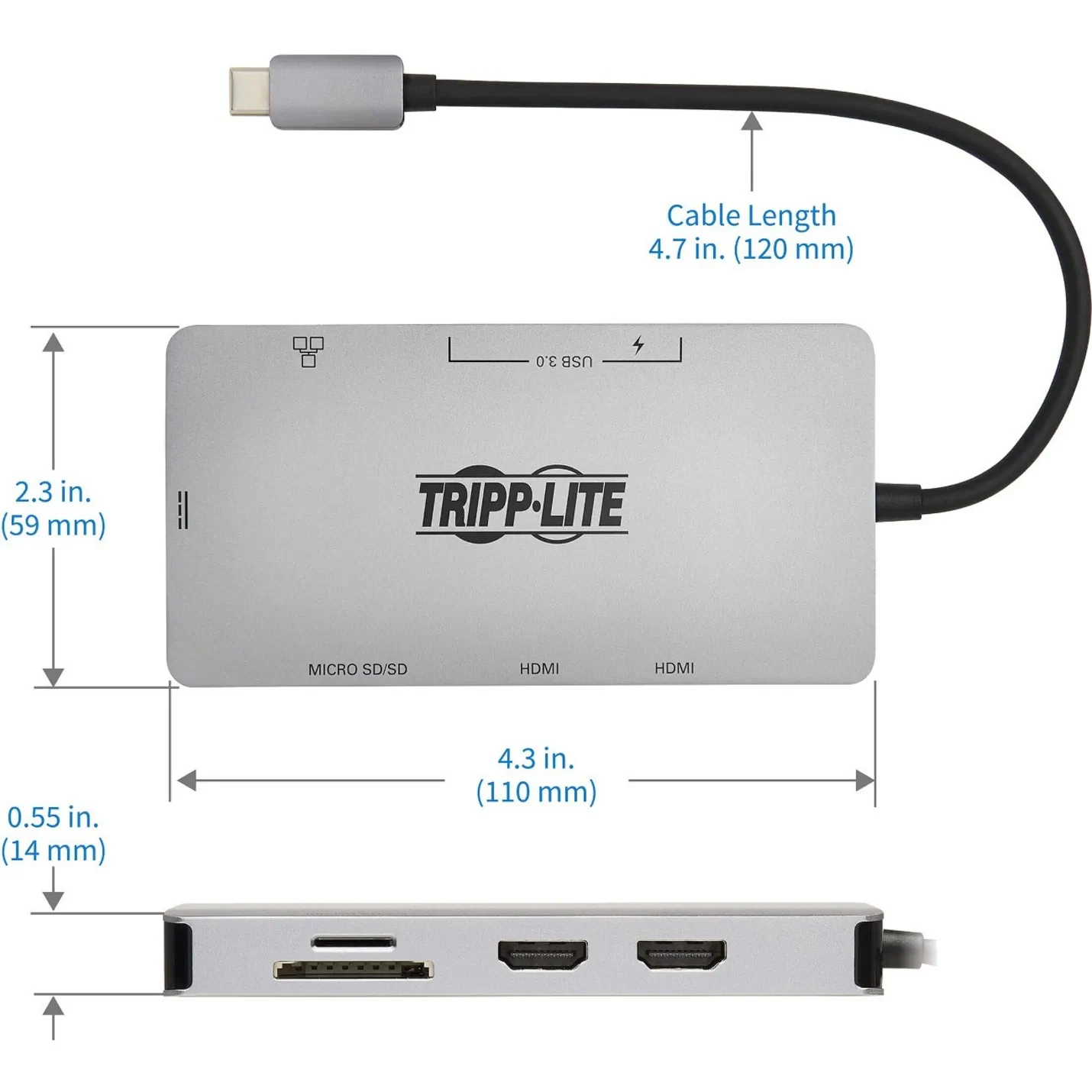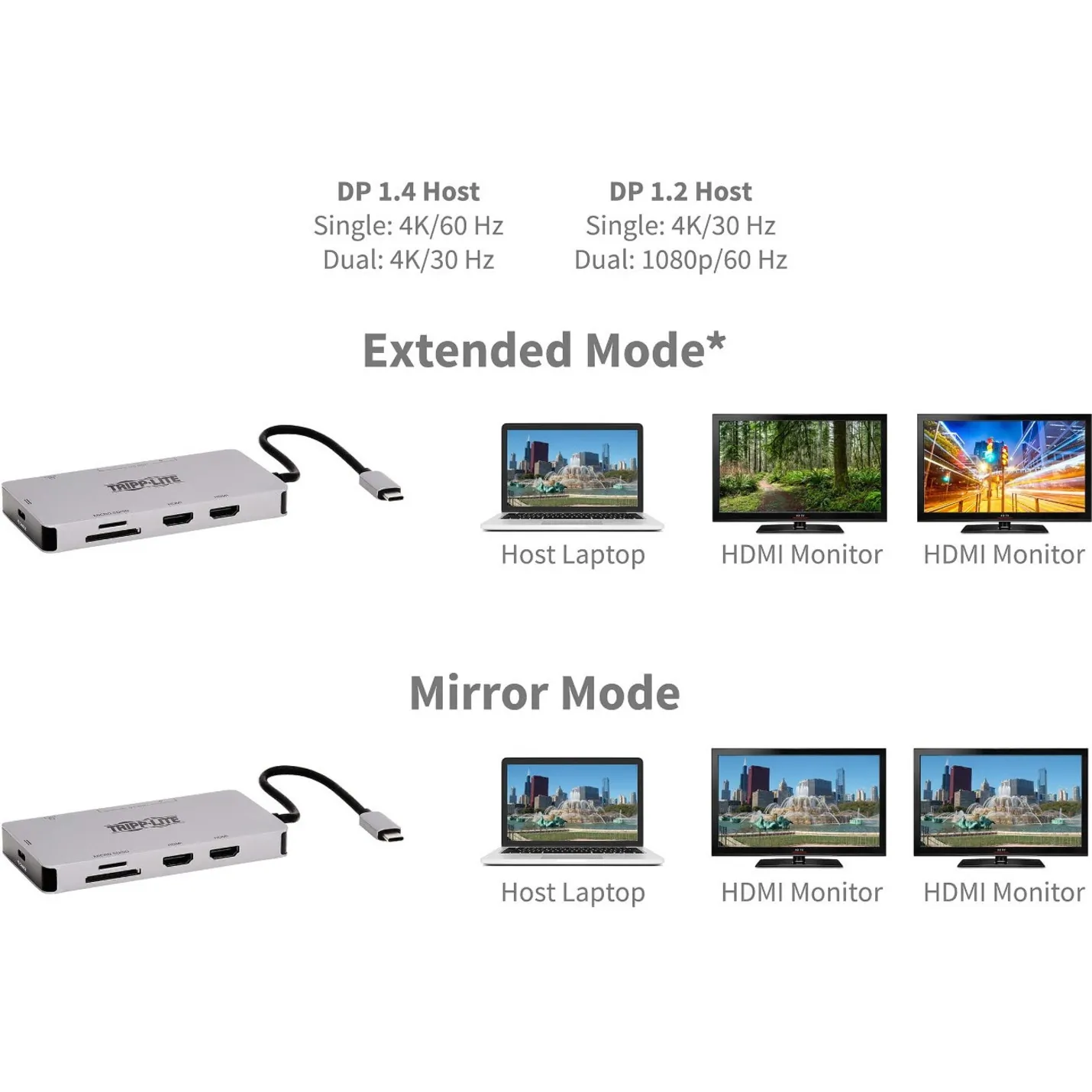 USB-C DOCKING STATION TURNS YOUR DEVICE'S USB-C OR THUNDERBOLT 3 PORT INTO A WORKSTATION: This USB-C dock with PD Charging expands the potential of your Windows laptop, Chromebook, smartphone or PC's USB-C or Thunderbolt 3 port. It's ideal for transmitting 4K video and digital audio to two large displays, adding a thumb drive and other USB peripherals, and powering and charging a PD Charging-compliant mobile device, all at the same time. SUPPORTS USB-C DISPLAYPORT ALTERNATE MODE FOR CONVERTING AUDIO/VIDEO SIGNALS: By connecting the built-in USB-C cable to a source device that supports USB DisplayPort (DP) Alt Mode, you can output 4K video and digital audio to an HDMI monitor, television or projector without installing special software drivers. TRANSMITS 4K VIDEO TO 2 HDMI DISPLAYS SIMULTANEOUSLY: Two HDMI outputs each support 4K video resolutions up to 3840 x 2160 at 60 Hz with multi-channel sound, 36-bit Deep Color and 4:4:4 chroma subsampling. You can display the image from the host computer on both monitors, extend your host desktop across both with different windows open on each, or combine both into one large display as a video wall. Connect both monitors in Extended (4K at 30 Hz under MST/Windows) or Mirror (4K at 60 Hz under SST/Mac) mode. Note, when connecting a DP 1.4 Alt Mode host, the maximum HDMI resolution is 3840 x 2160 at 60 Hz for one monitor and 3840 x 2160 at 30 Hz for two. When connecting a DP 1.2 Alt Mode host, the maximum HDMI resolution is 3840 x 2160 at 30 Hz for one monitor and 1920 x 1080 at 60 Hz for two, due to bandwidth limitation.