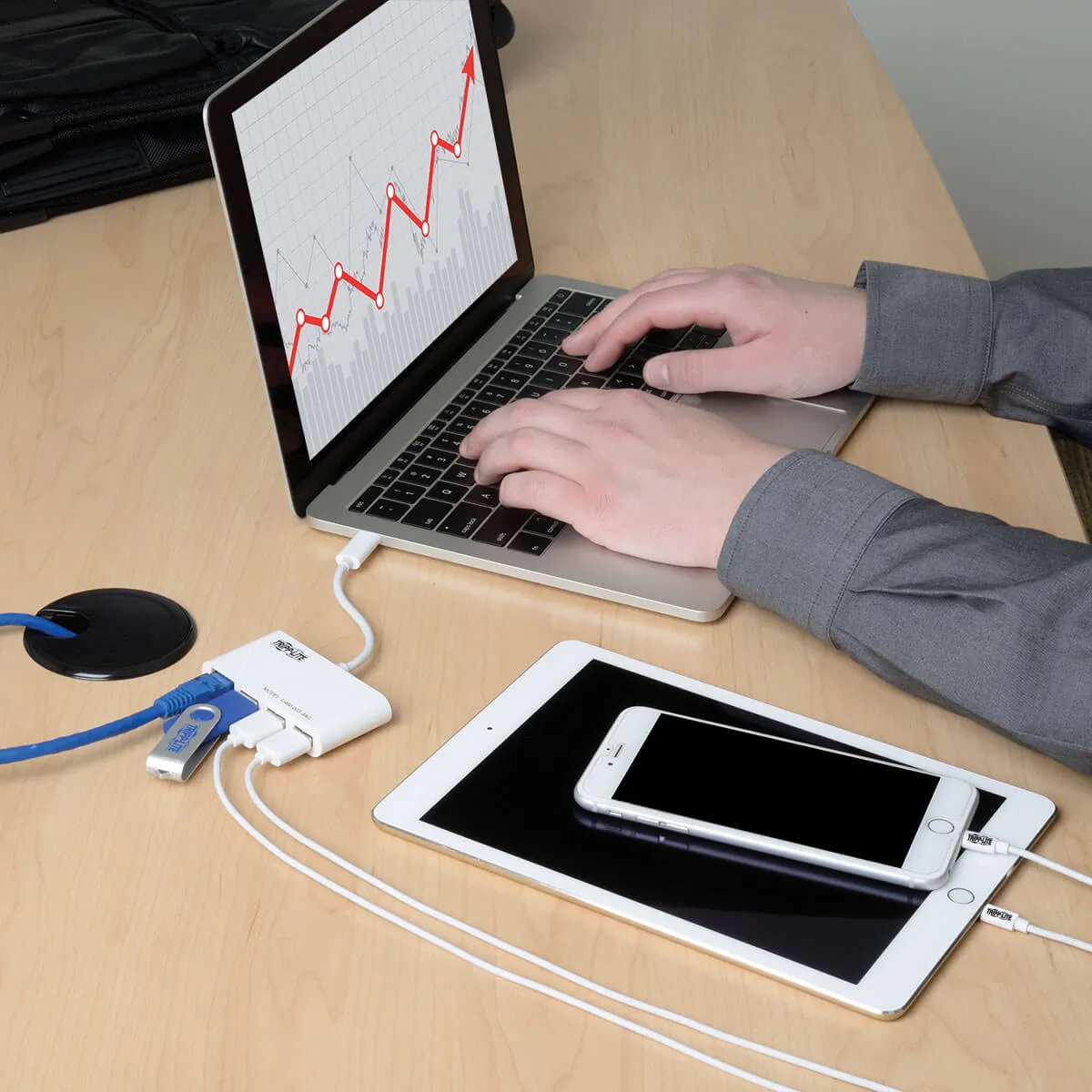 USB 3.1, generation 1 USB-C hub/adapter expands the potential of your tablet, laptop, MacBook, Chromebook, smartphone or PC's USB-C or Thunderbolt 3 port. Plug-and-play technology makes installation quick and simple - with no software or drivers to install. Fumble-free, reversible USB-C plug connects in either direction for a quick connection every time. Three USB-A ports accept USB peripherals, such as a flash drive, mouse, keyboard or printer, and each provides up to 0.9A for charging smartphones and other mobile devices. All ports support fast data-transfer rates up to 5 Gbps and are backward-compatible with previous USB generations so you can continue using older peripherals while getting high-speed performance from new devices. Hub/adapter is perfect for adding a thumb drive and other USB peripherals, charging a mobile device, and connecting to a Gigabit Ethernet network all at the same time.Tripp Lite 3-Port USB-C to USB-A Hub Portable w/ Gigabit Ethernet Port RJ45