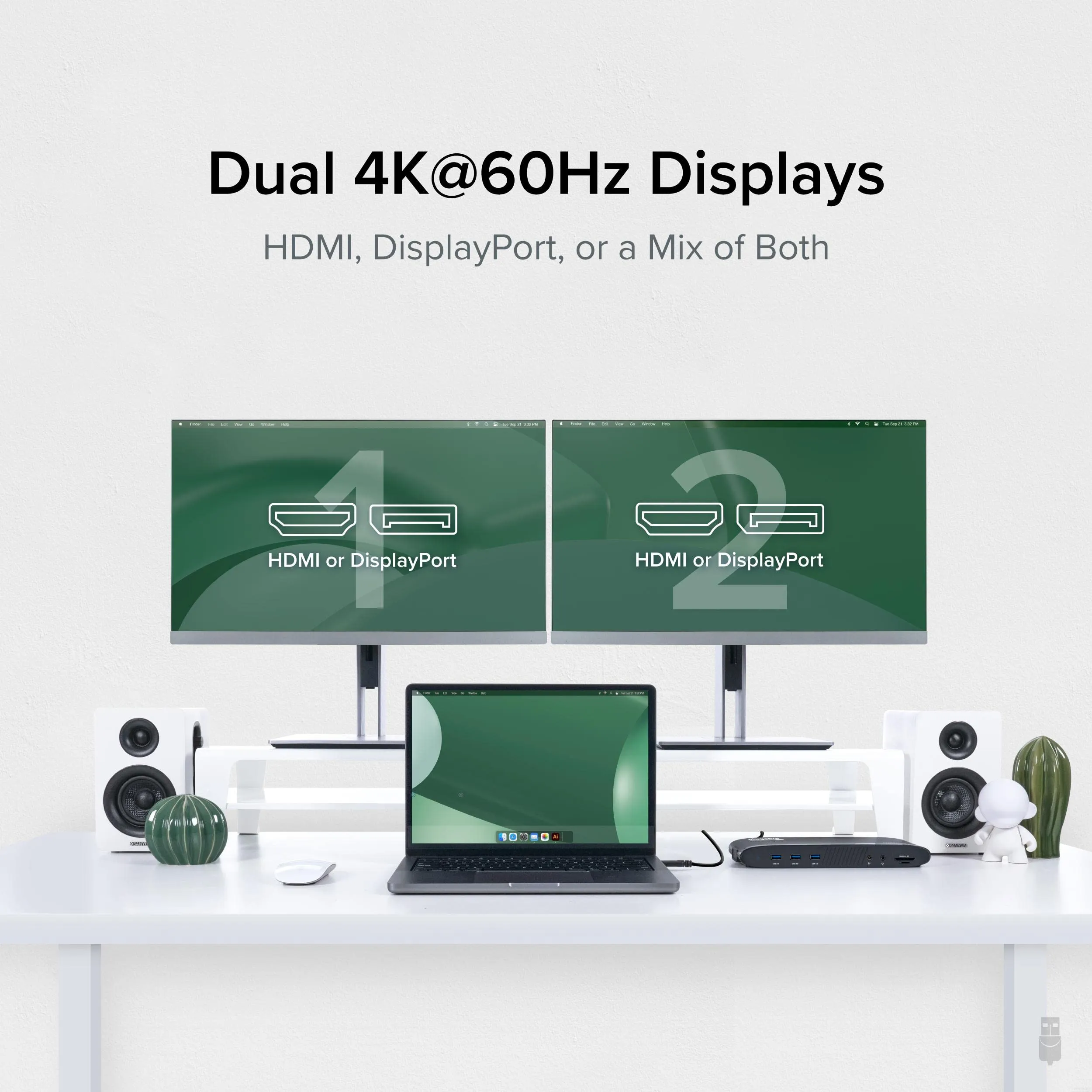 The Plugable USB-C Dual 4K Docking Station allows you to connect dual 4K monitors while providing 100W power delivery to your laptop. This versatile dock supports multiple connectivity options, making it ideal for any workspace.