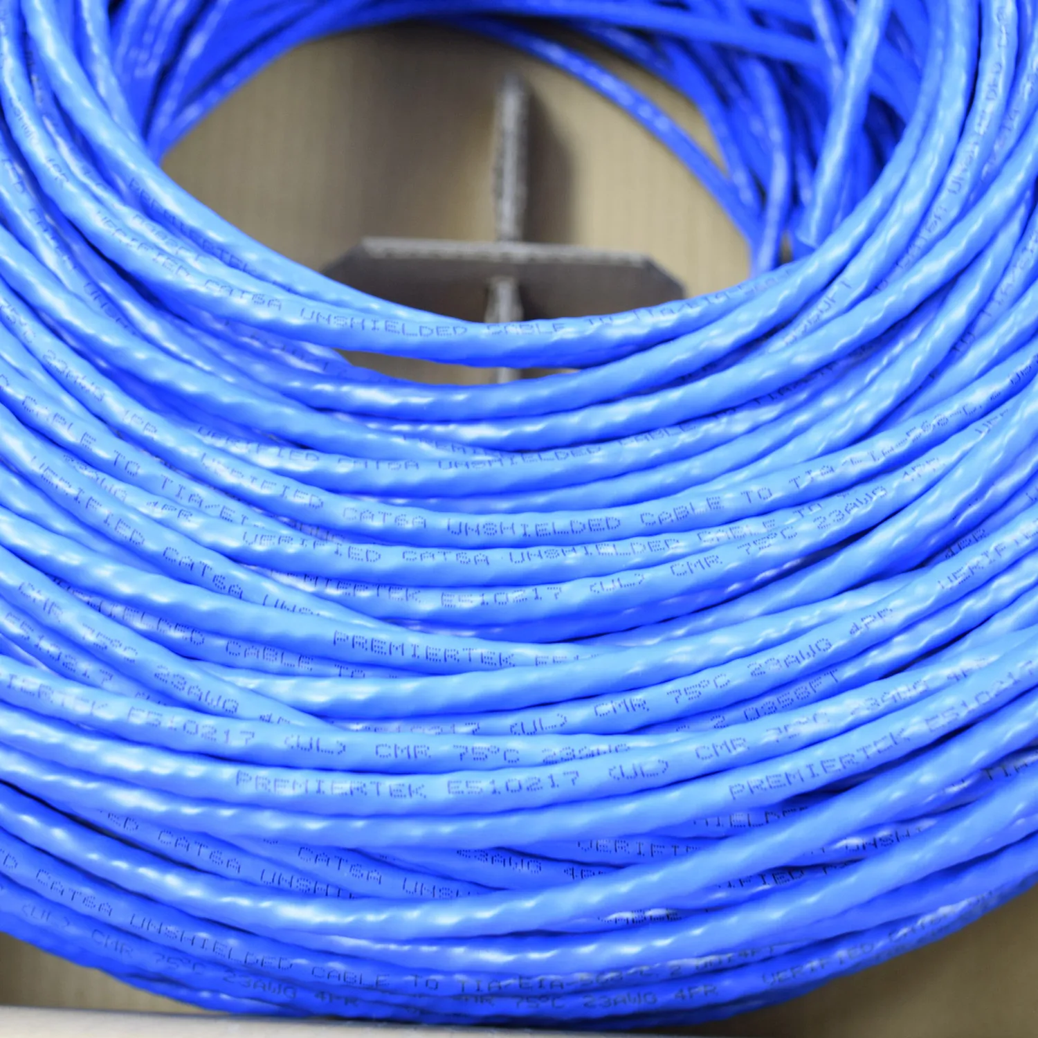 This 1000-foot Blue Cat6A UTP cable is engineered with solid bare copper for optimal performance. Its UL CMR rating ensures it is safe for vertical spaces, making it ideal for commercial and residential installations.