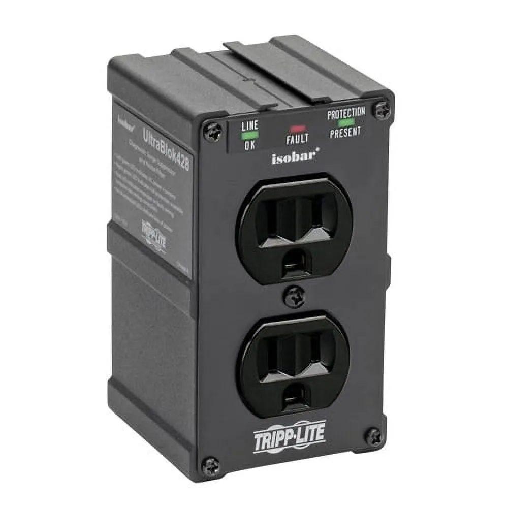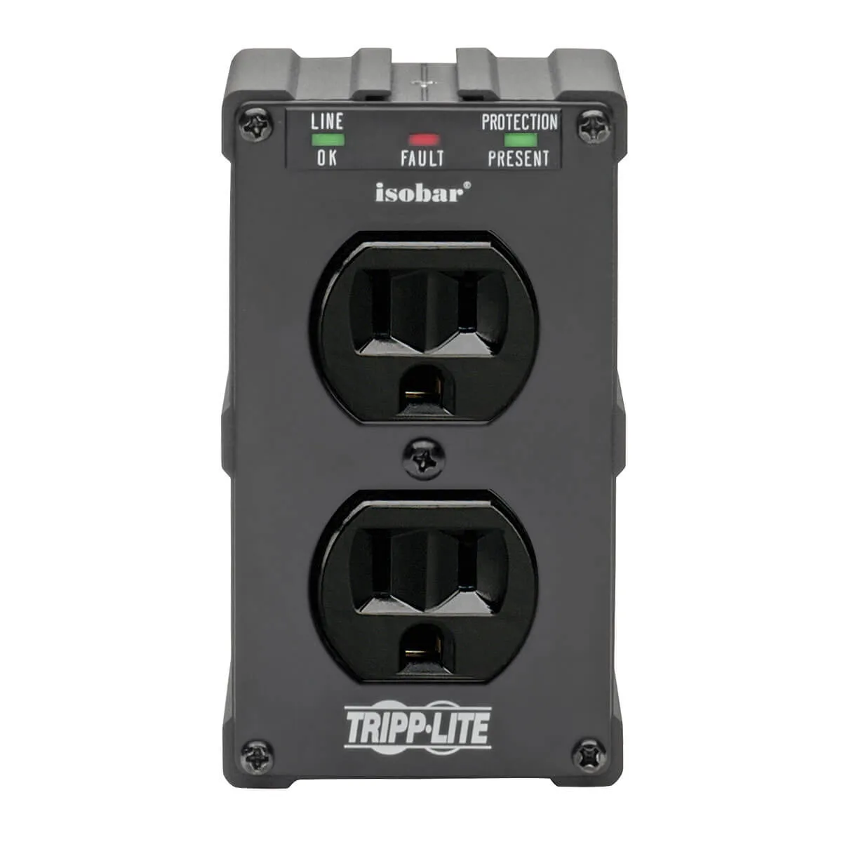 Isobar 2-Outlet Surge Protector Direct Plug-In 1410 Joules Diagnostic LEDs Black Metal Housing