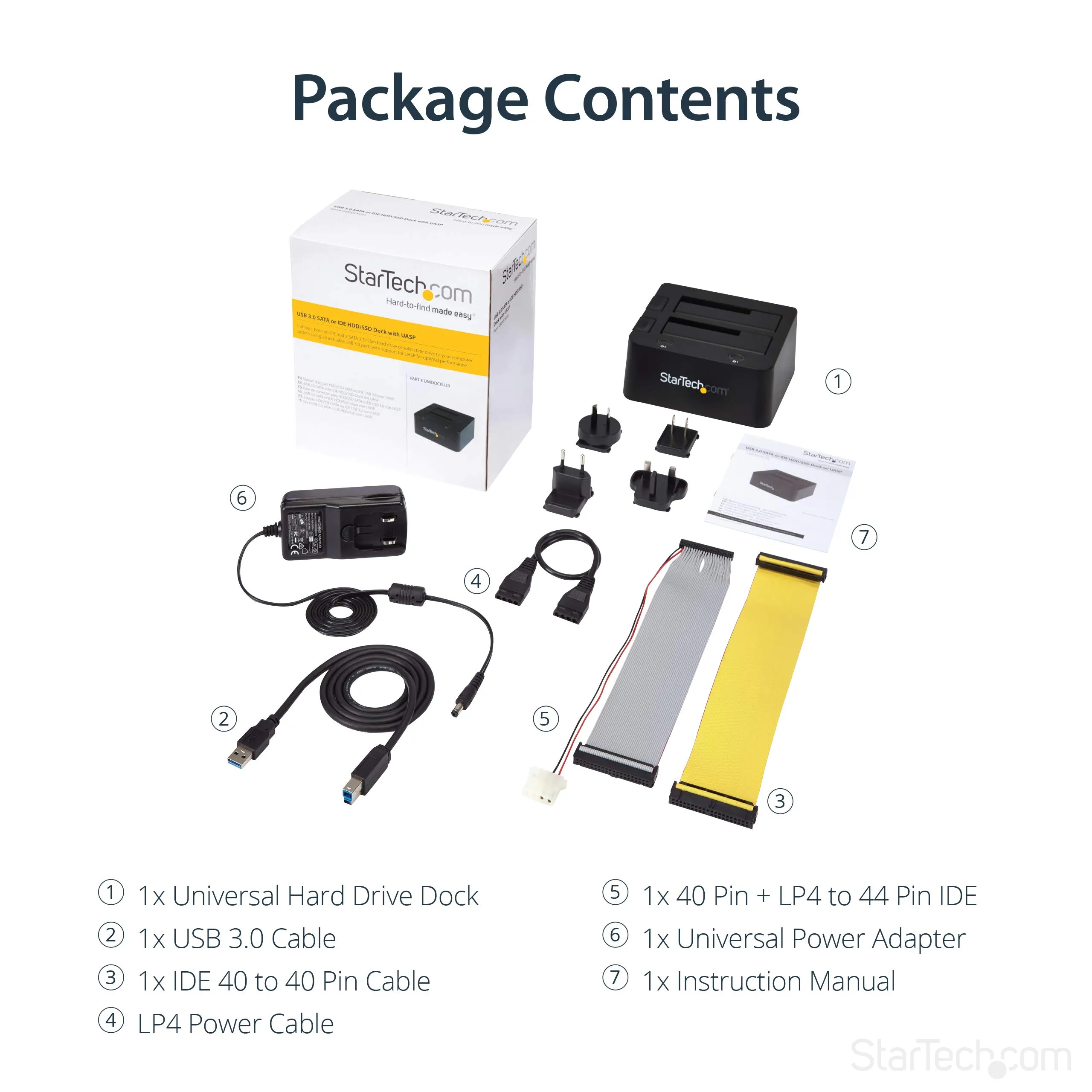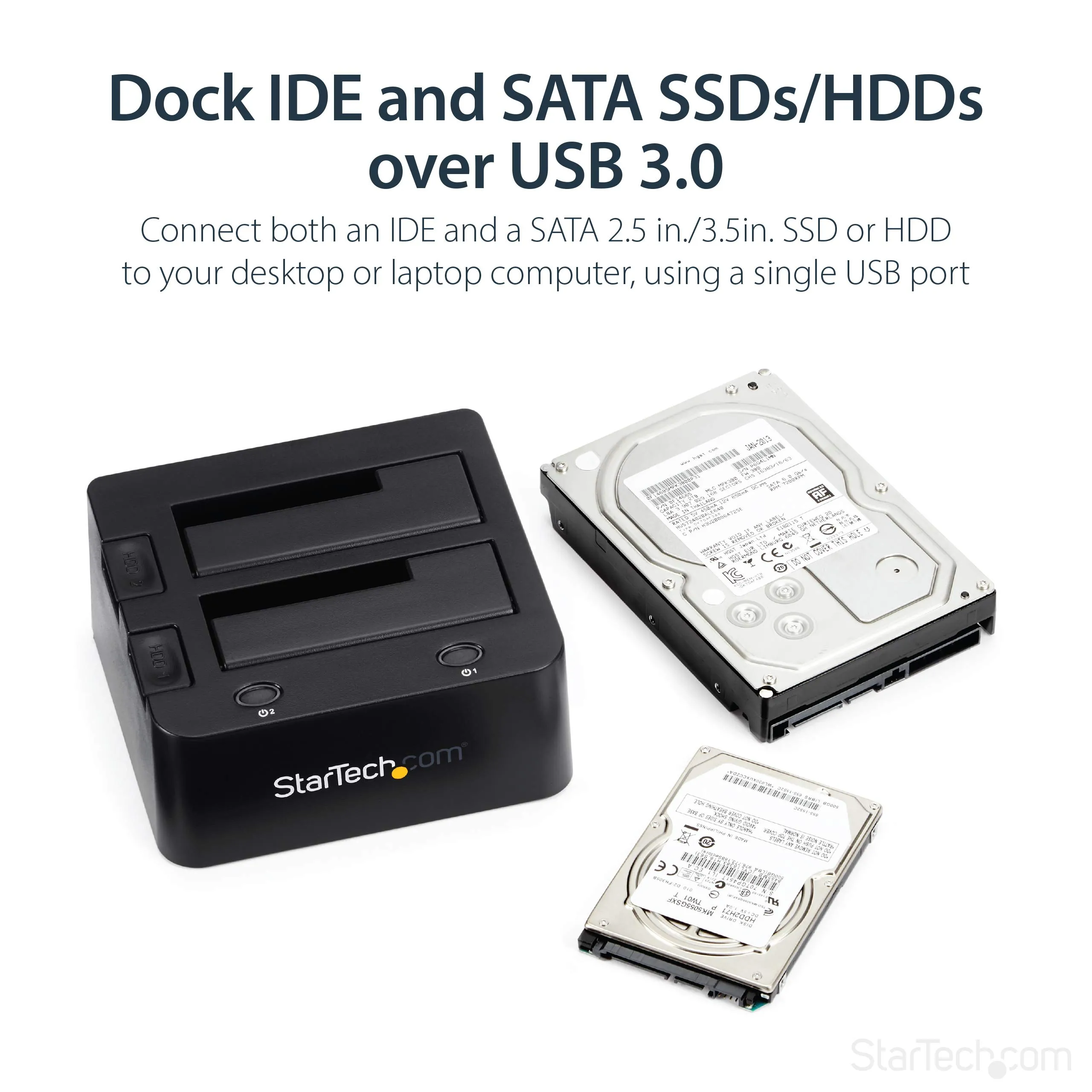 The dual hard drive docking station with UASP enables you to instantly access your 2.5 or 3.5in IDE and SATA hard drives through two top loading drive slots, saving you the hassle of mounting the drives into a computer or external enclosure or tray. Enhanced with UASP (USB Attached SCSI Protocol), this external hard drive docking station lets you get the most out of the fastest drive technologies such as SATA III (6 Gbps), solid state drives (SSD) and hybrid drives. The slot-loading design holds the SATA and IDE drives upright inside the USB 3.0 hard drive docking station, neatly keeping them off the desk, for convenience and a clutter-free setup. For SATA drives, the SATA HDD/SSD docking station can be inserted and connected directly through the designated dock slot, while the IDE drive slot is conveniently positioned near the rear panel 40-pin data and LP4 power connections, making it easy to connect to the dock using the included IDE data and power cables. The universal HDD docking station has a single USB 3.0 connection to your host computer, enables access to both the IDE & SATA hard drives simultaneously.