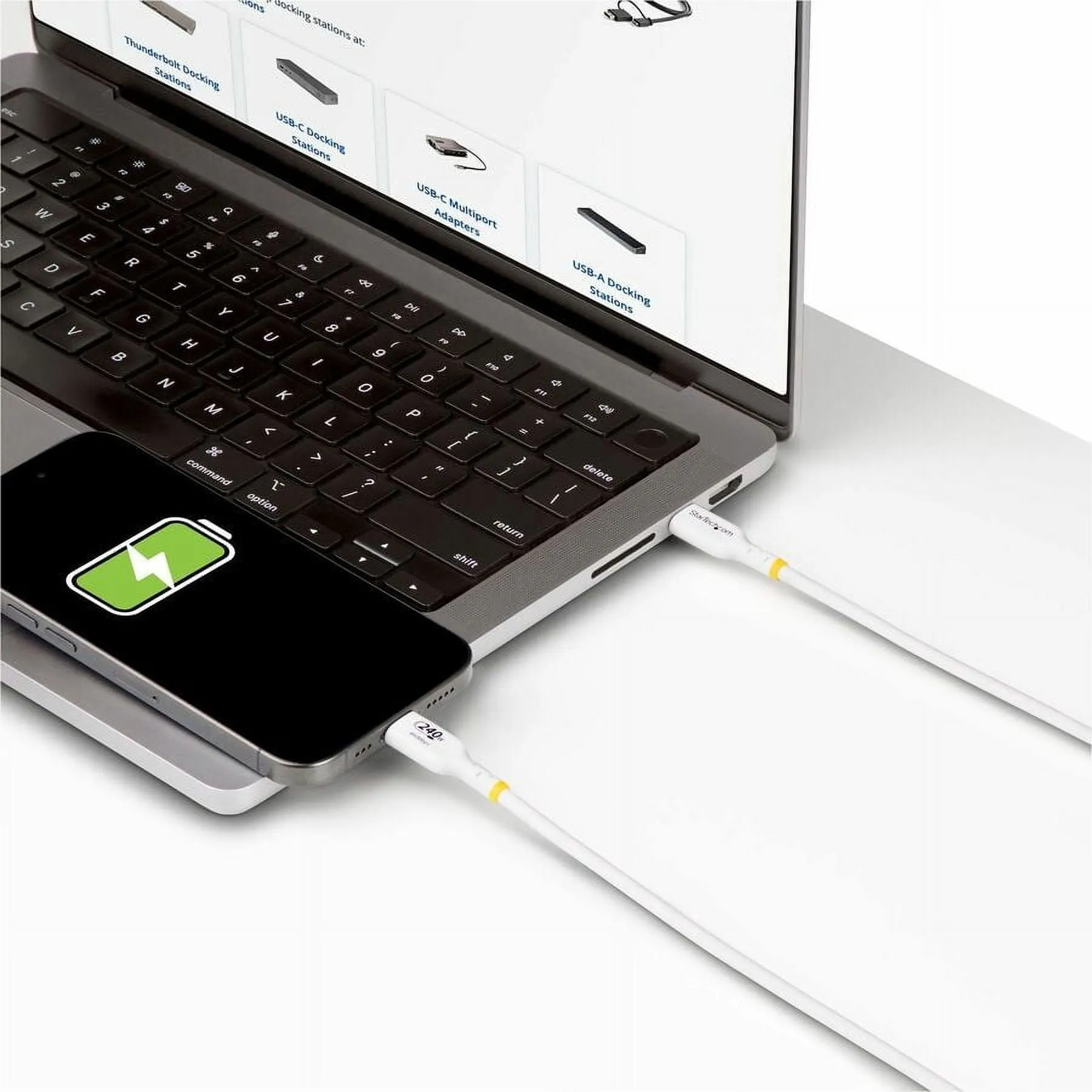 USB C Cable supports Power Delivery 3.1 Extended Power Range (EPR); Up to 240W at 48V; Ideal for highpower laptops including 16in MacBook Pro M3 Pro/M3 Max USBIF certified w/Emarker for consistent PD output; Use connector markings to identify specs ataglance Nickelplated connectors; 30AWG wire; Durable TPE Jacket w/shield protects from EMI 240W/5A PD 3.1 EPR; USB 2.0 TypeC (480Mbps); 13foot; White; 4mm (0.16in) O.D.; NOTE: USBC video (DP Alt Mode) is not supported