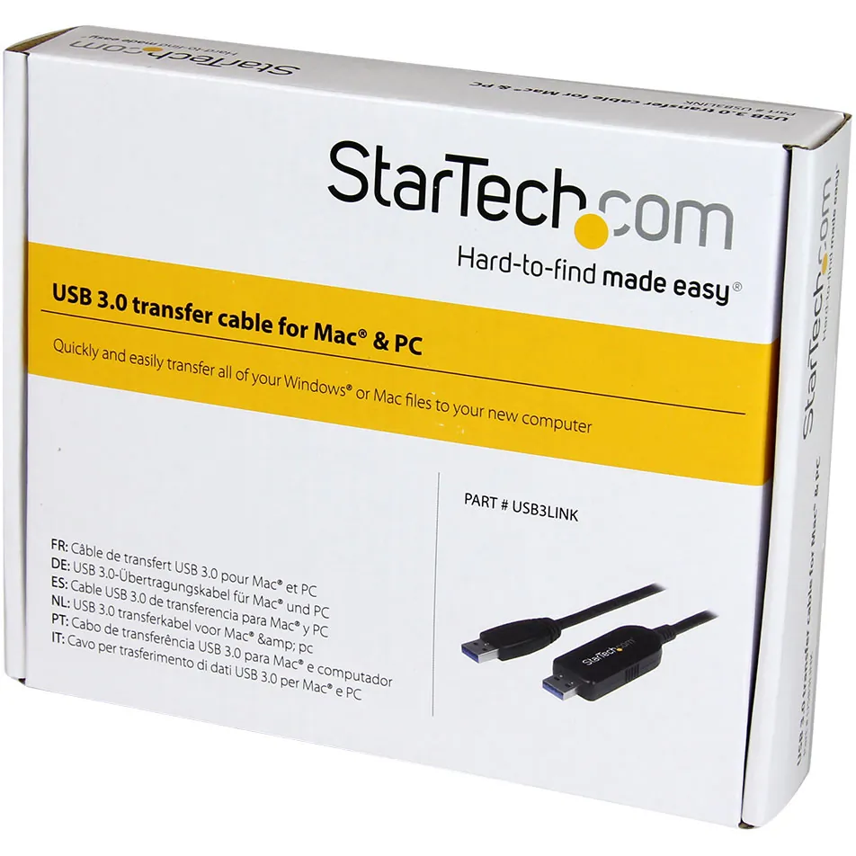 The transfer cable saves you time and effort when you're upgrading to a new computer. You can transfer your files and settings quickly over USB 3.0, also known as USB 3.1 Gen 1, with file transfer speeds up to 5 Gbps. Plus, there are no additional drivers to install when connecting your computers, because the necessary software is stored on the cable.