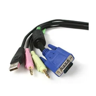 This 10ft 4-in-1 USB KVM switch cable provides VGA video, USB mouse and keyboard, 3.5mm audio, and 3.5mm microphone connections, all in a single, compact cable.