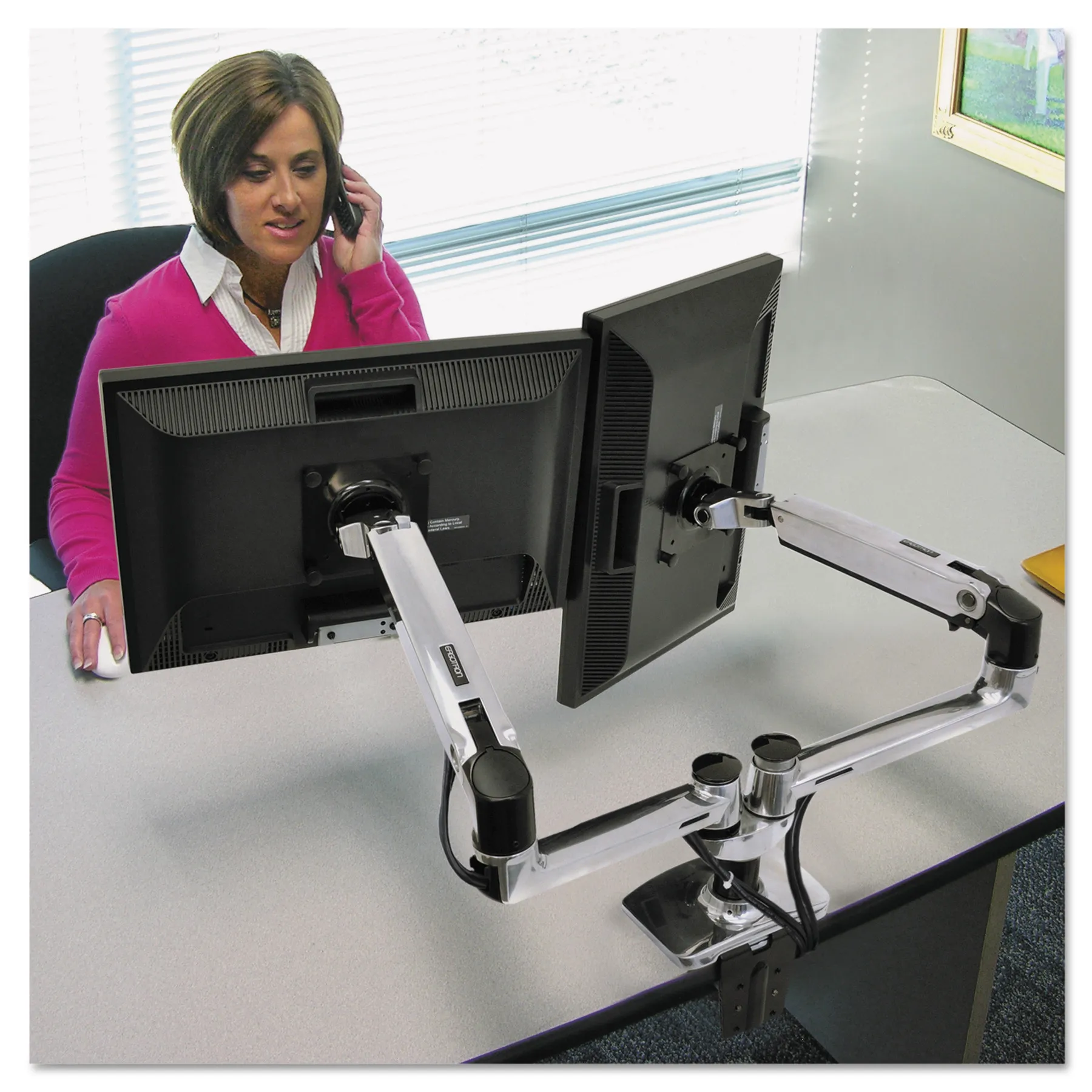 Designed for side-by-side or low-angle screen viewsFree up your desktop for office essentialsHolds two screens up to 27" in sizeStreamlined look enhances your work areaBuilt for years of use by passing our 10,000-cycle motion test