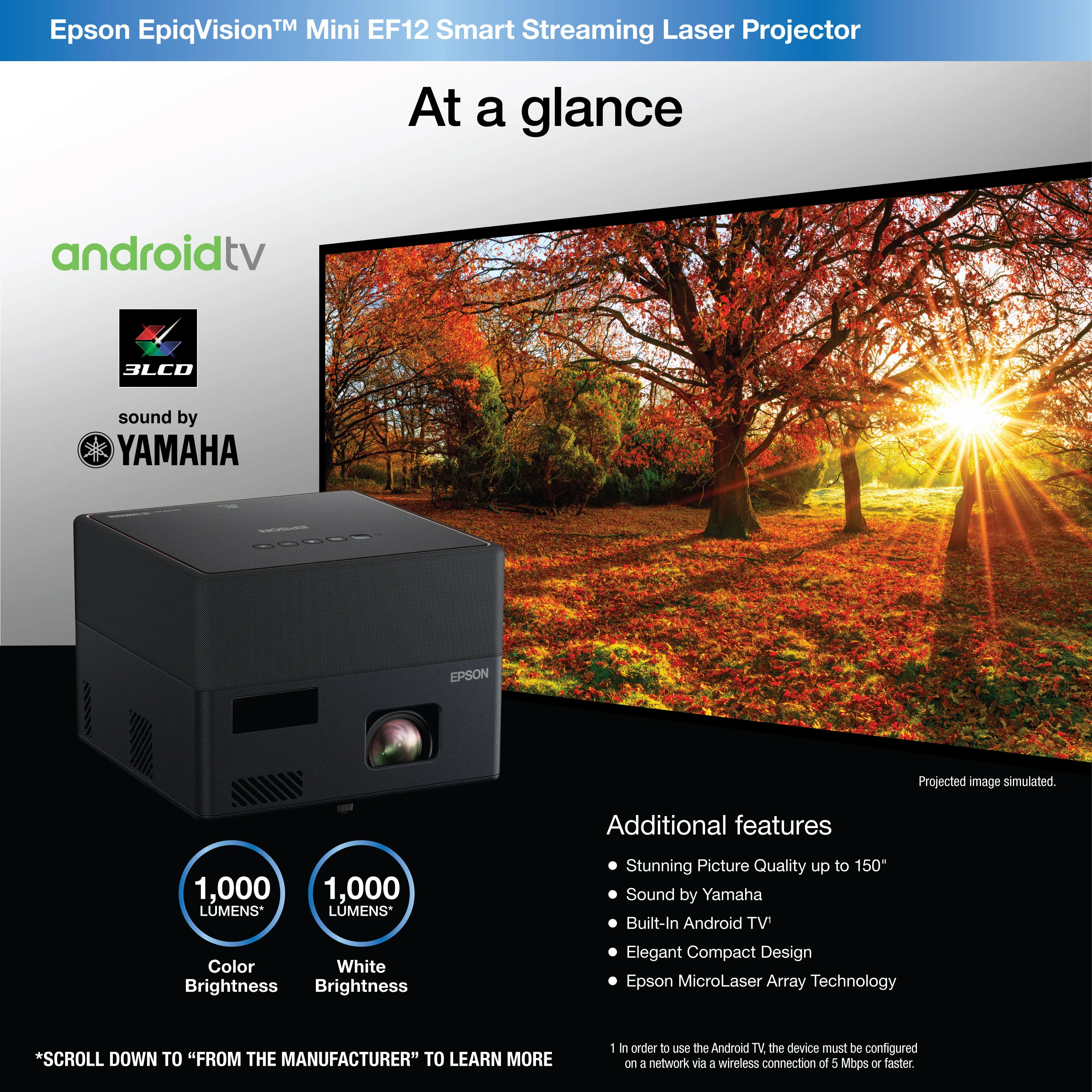 The EF-12 Mini Laser Projector is a compact and portable device that transforms any space into a cinematic experience. With built-in Android TV, it brings your favorite streaming services right to your fingertips. Enjoy stunning visuals and vibrant colors from the comfort of your home or on the go. Perfect for movie nights, presentations, or gaming sessions!
