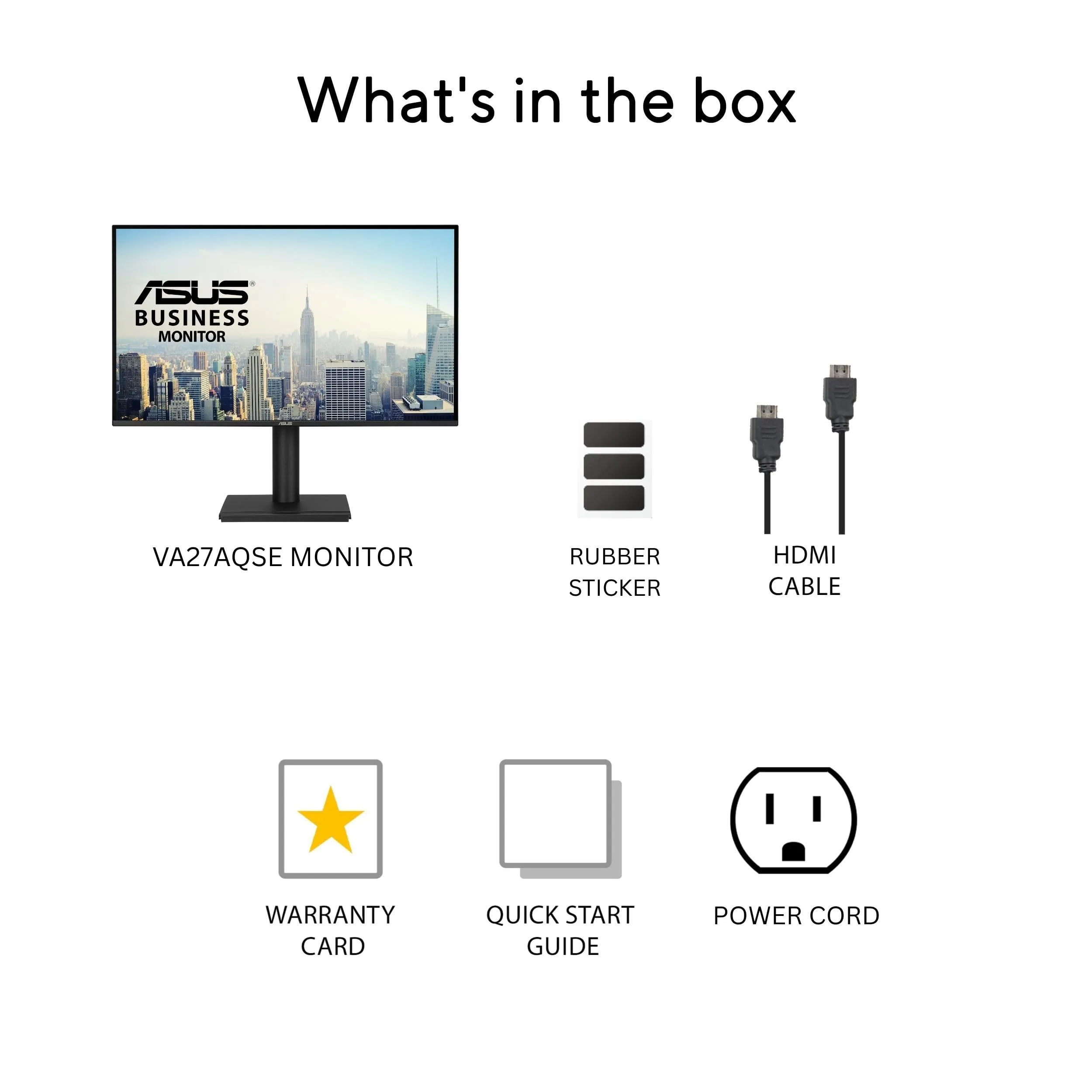 ASUS 27 1440P Business Monitor VA27AQSE IPS, QHD, 99 sRGB, Frameless, HDMI, DisplayPort, VGA, 1ms, Speakers, Low Blue Light, Flicker Free, Ergonomic Design, VESA Wall Mountable, 3 yr warranty
