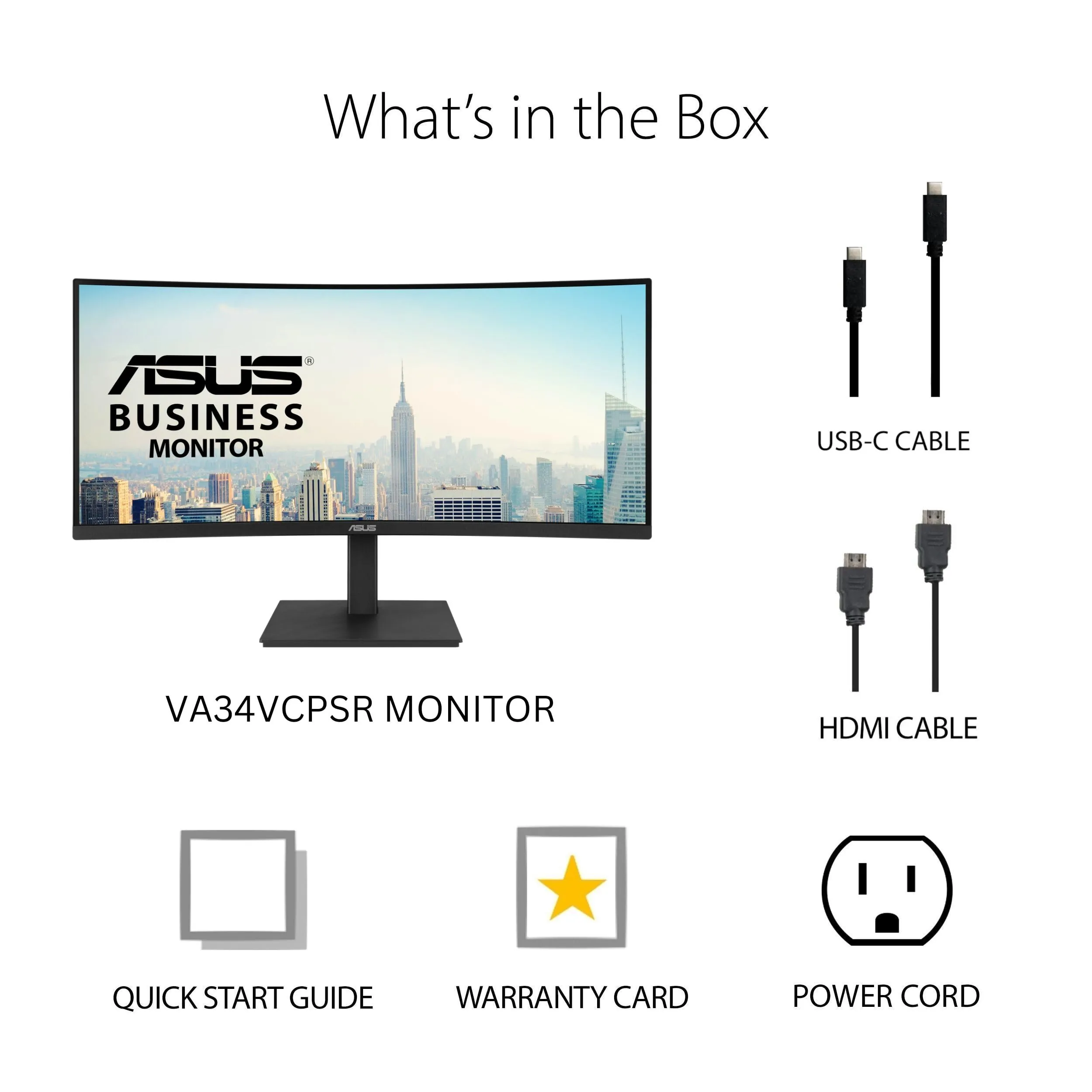 The ASUS 34-inch Curved USB-C Docking Monitor (VA34VCPSR) offers an immersive WQHD resolution of 3440x1440 with a 1500R curvature, designed for a visually stunning and comfortable viewing experience. Its frameless design maximizes screen estate, making it ideal for multi-monitor setups.