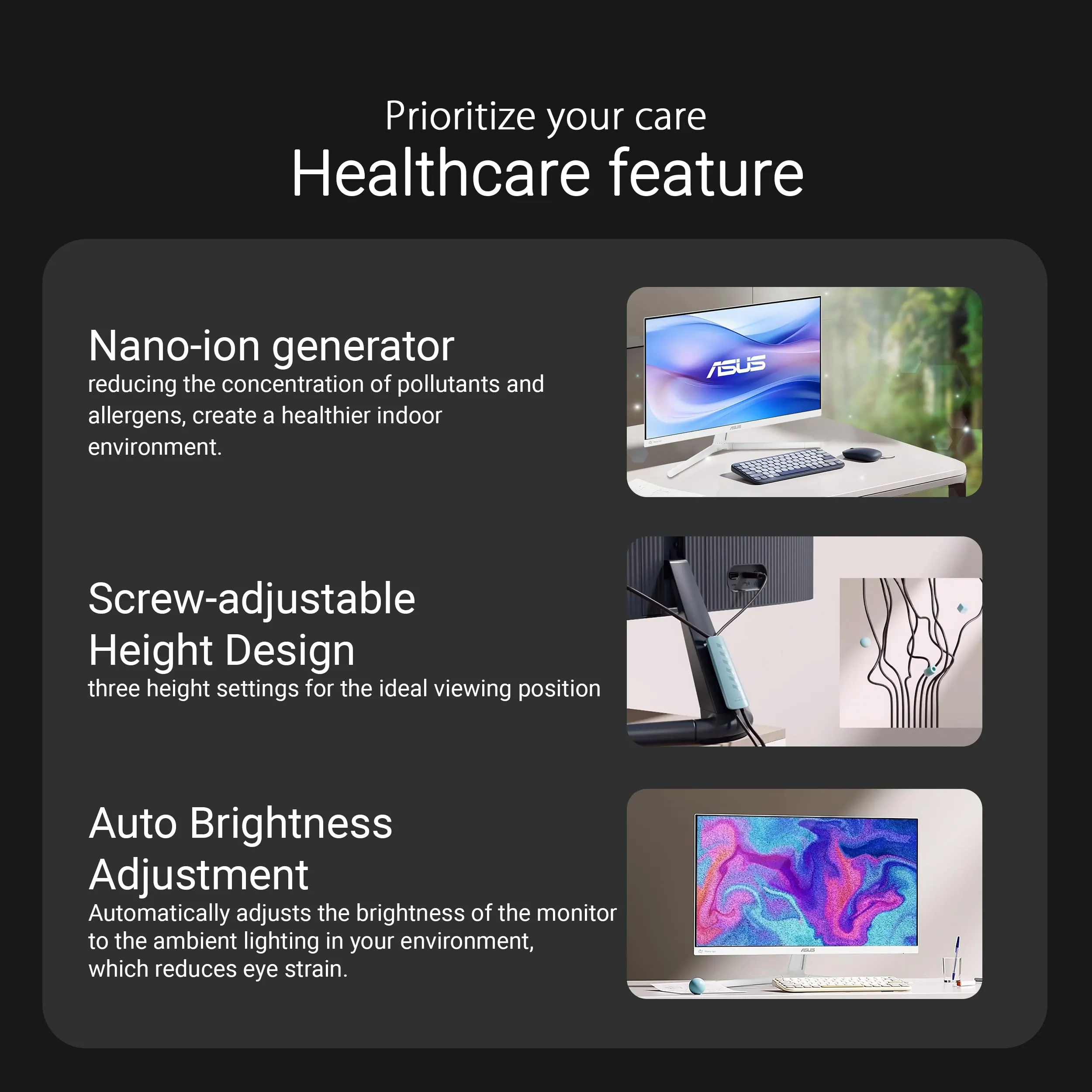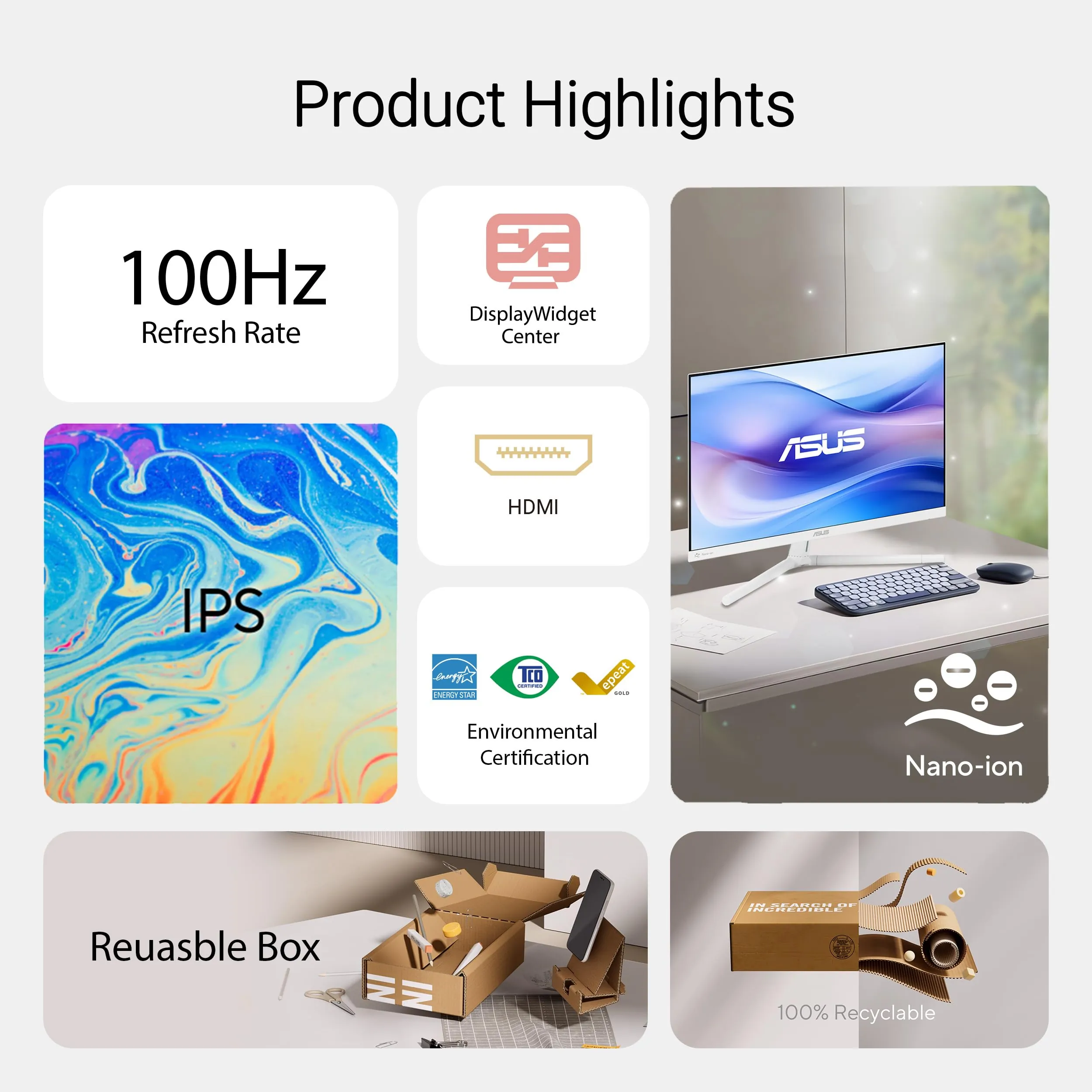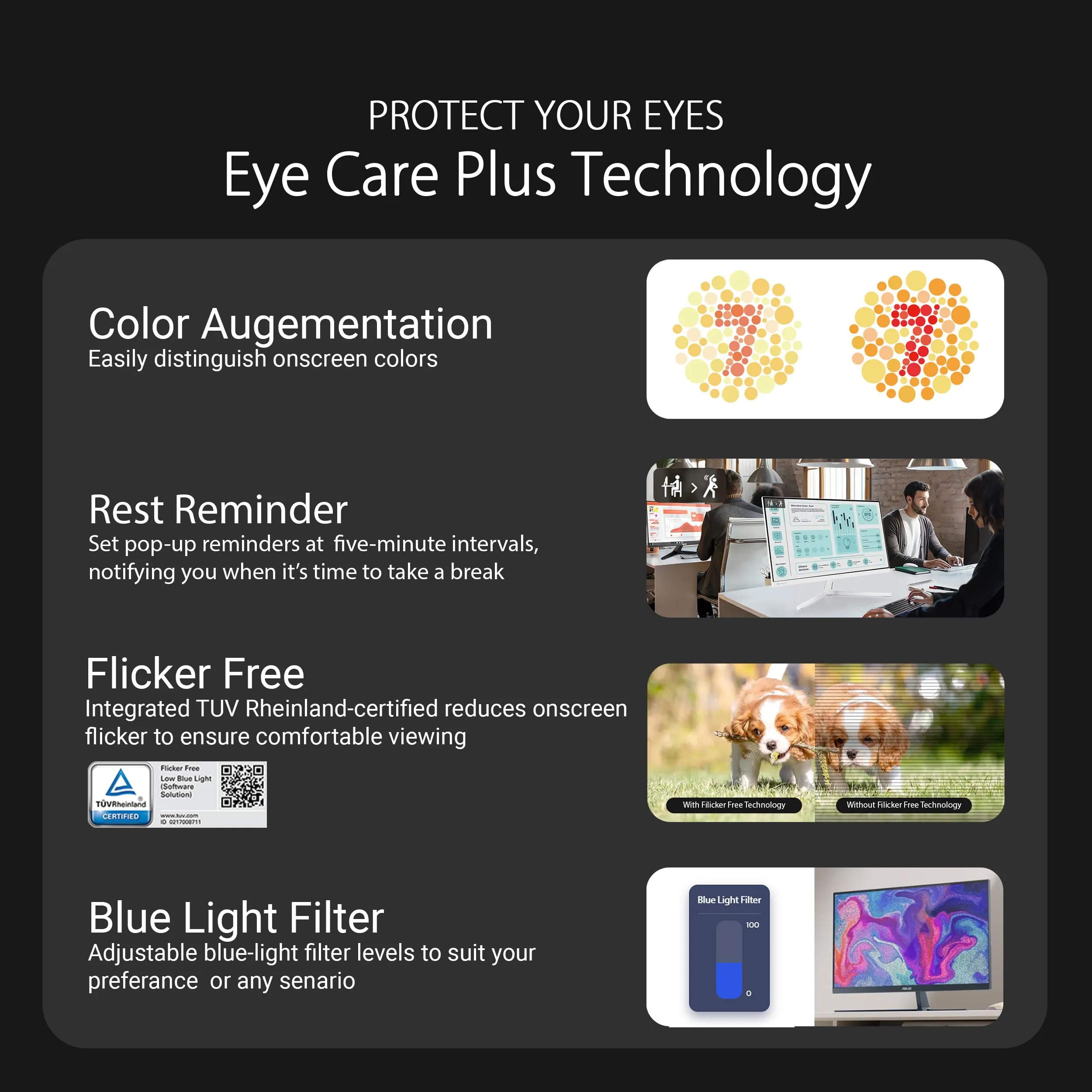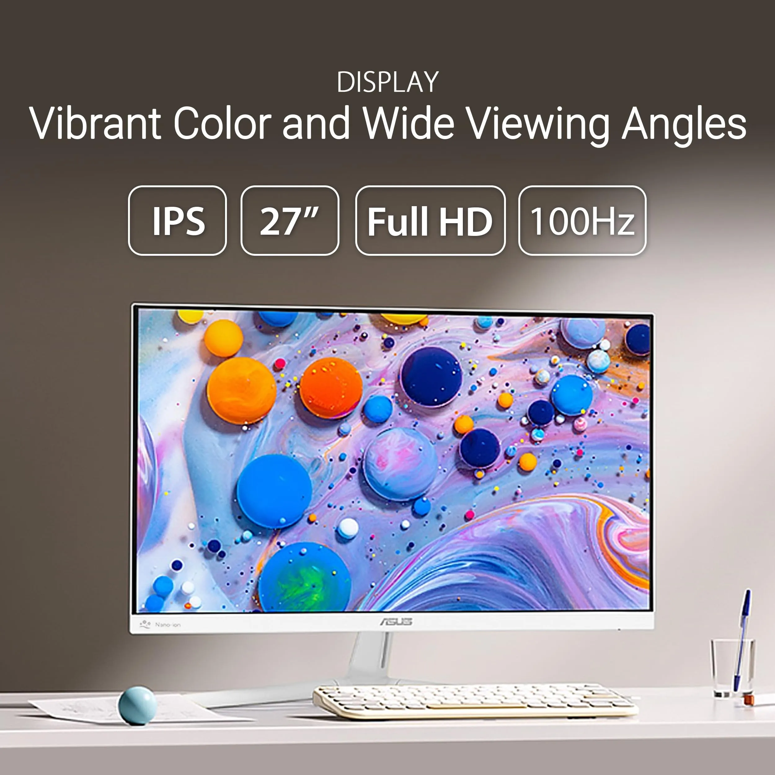 The ASUS 27-inch Full HD Eye Care Monitor (VU279HFI-W) offers stunning visuals with IPS technology and a 100Hz refresh rate for smooth motion in gaming and video playback. Designed with eye care in mind, it features Blue Light Filter and Flicker-Free technology to reduce eye strain during extended use.