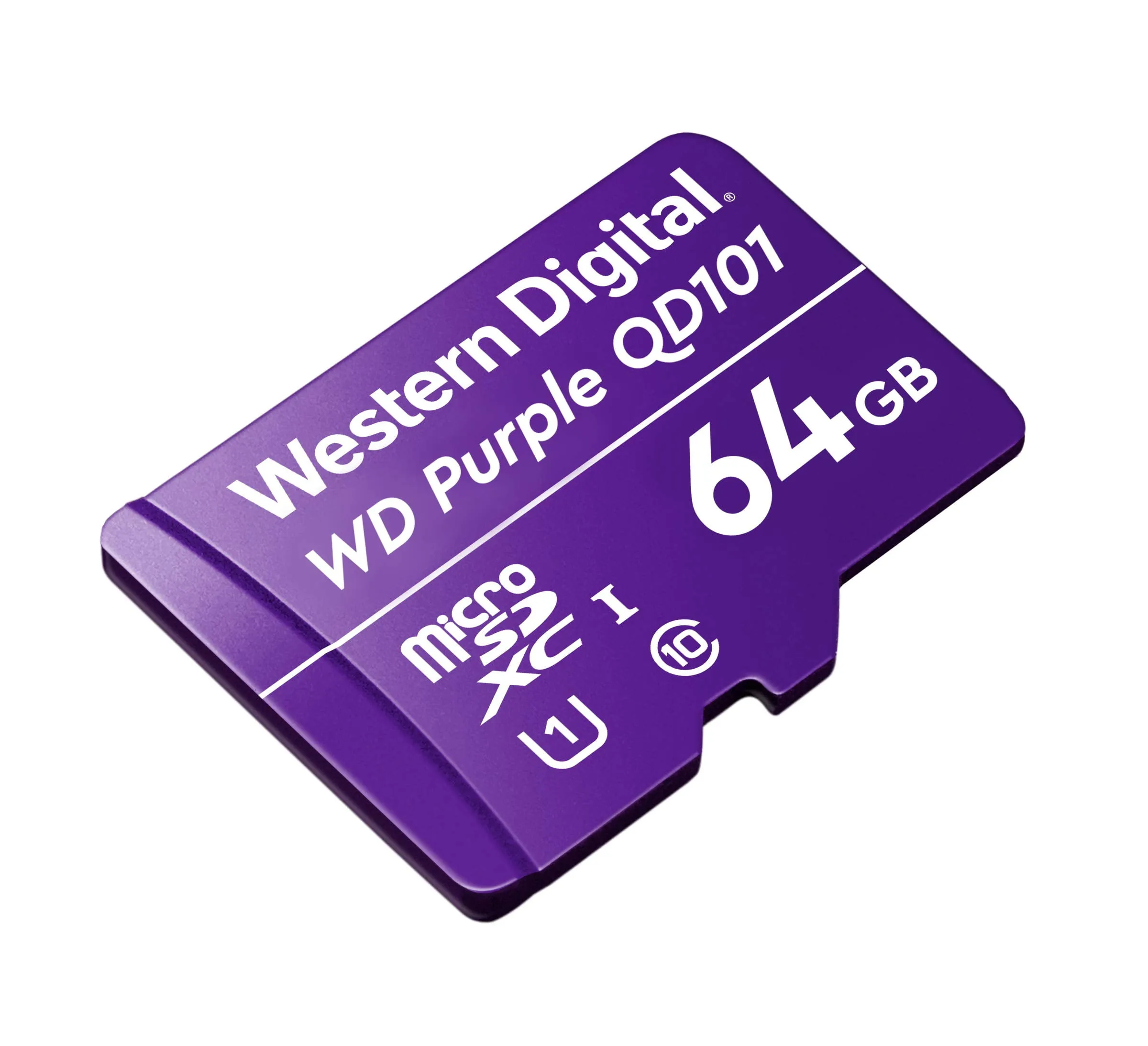 WD (WDD064G1P0C) Purple SCQD101 MicroSD Card - SDA 6.0 - Western Digital's WD Purple microSD card was created specifically to address the complex storage requirements of the growing security camera market. Leveraging over four generations experience of developing world-class industrial storage products, Western Digital designed the WD Purple microSD card to provide storage longevity, environmental robustness and the right level of performance needed in all levels of cameras and edge devices for security video. WD Purple SC QD101 microSD cards are Western Digital's newest introductionto the WD Purple portfolio. These cards have the performance, elevated endurance and wide capacity range to provide a competitively pricedon-camera storage for low bit-rate video and backup/failoveron-camera storage. Targeted at security camera integrators, resellers and installers, the elevated endurance of these cards provides 24/7 continuous recording of securityvideo for much longer period of time than commercial or retail cards, reducing the frequency of storage maintenance and providing additional confidence and peace of mind. With advanced 96-layer 3D NAND technology, WD Purple microSD cards deliver capacities up to 512GB, and in compatible cameras, card health monitoring capability allows you to get notified when it's time to service your WD Purple microSD, so you can perform preemptive storage management. Trust Western Digital, who offers an unmatched portfolio of edge-to-core security video storage solutions, to provide you with the latest WD Purple microSD cards for uncompromising storage for security video edge devices. 3 Year Limited Warranty