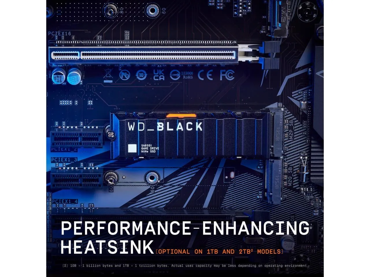 Strap in for breakneck gaming speeds with the WD BLACK SN850X NVMe SSD. Crush load times and slash throttling, lagging, and model pop-ins for a smooth, fast experience that lets you compete at your absolute peak. This purpose-built gaming drive comes in capacities of 1TB to 4TB1, with an optional heatsink on the 1TB and 2TB drives to help sustain top-end performance for more consistent gameplay. With the advanced features of Game Mode 2.0 (Windows only) plus speeds that approach the limits of the PCIe Gen43 interface, the WD BLACK SN850X NVMe SSD delivers top-tier performance to keep you playing, streaming, recording, and dominating the game.